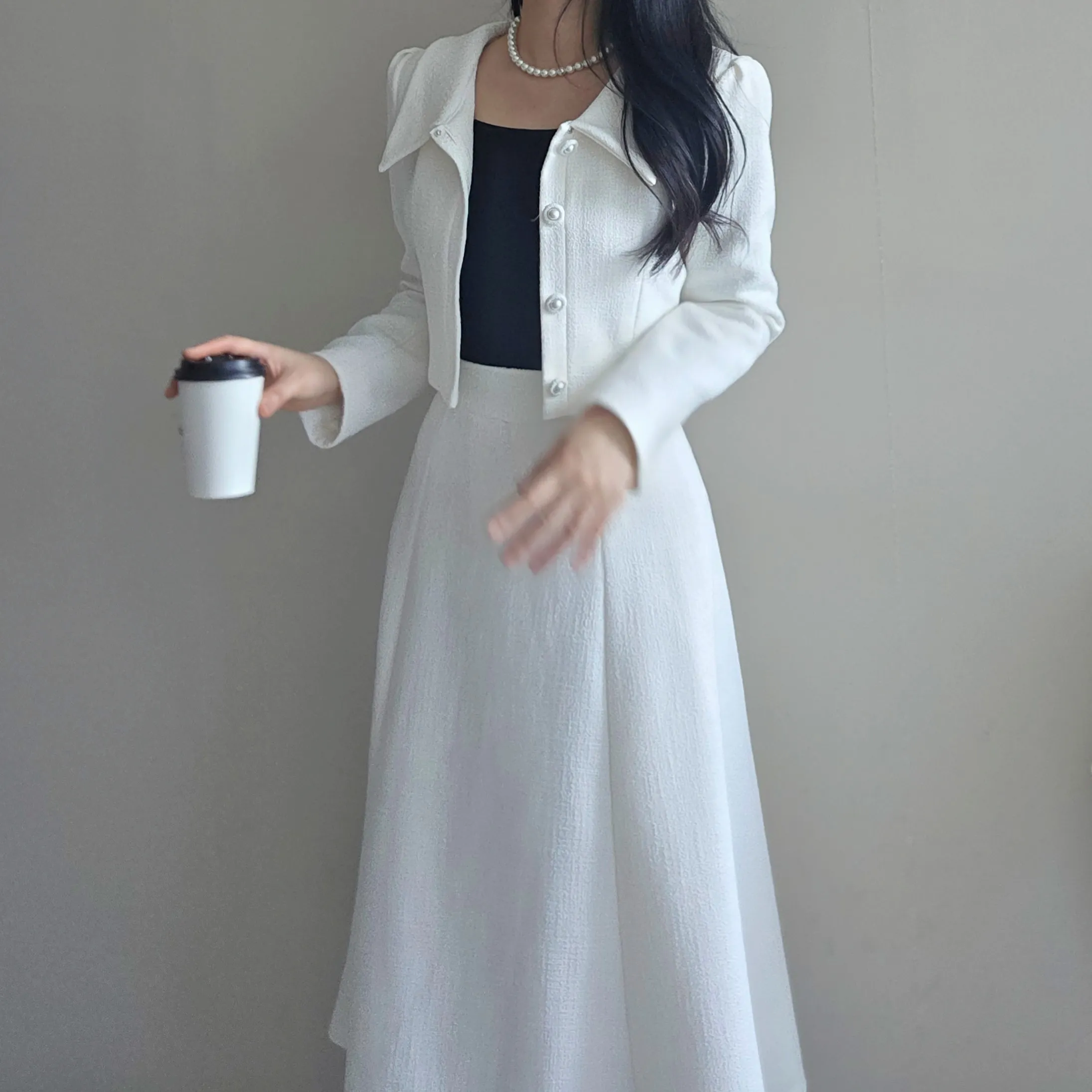 ツイードロングフレアジップアップカラー長袖クロップドボタンセットアップスカートジャケット