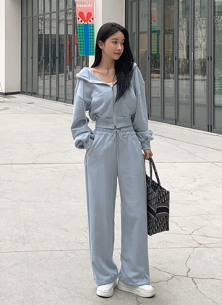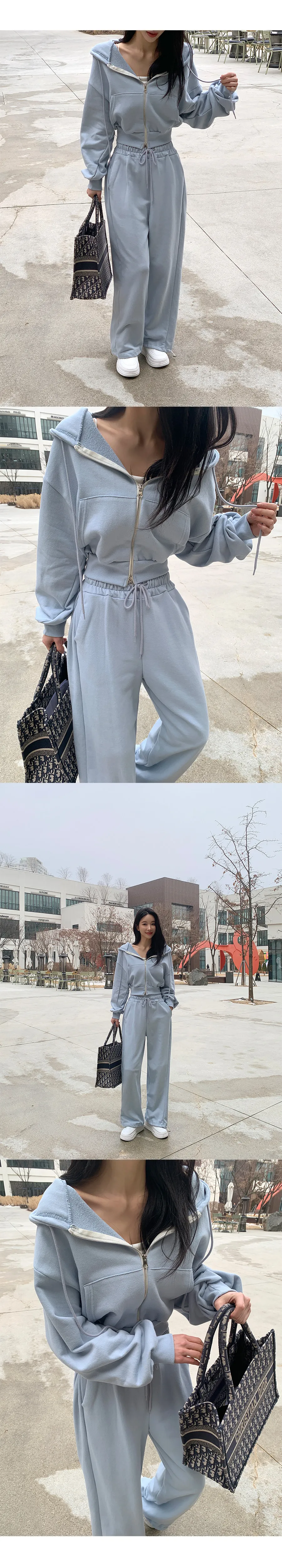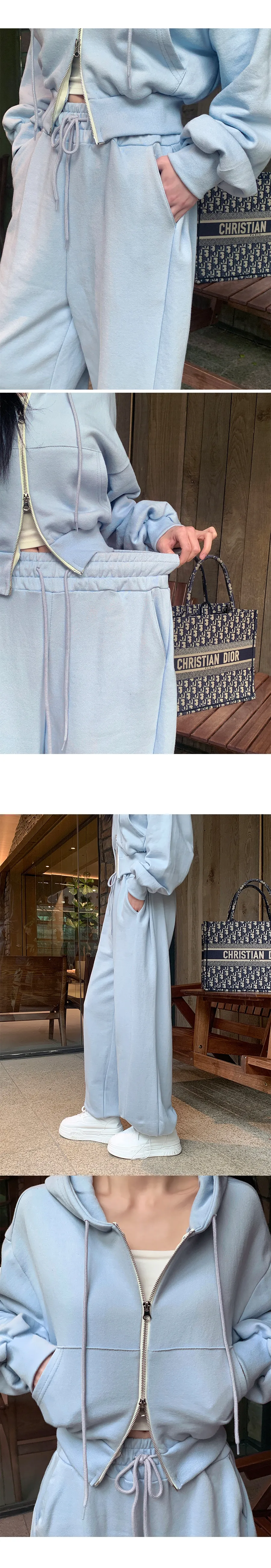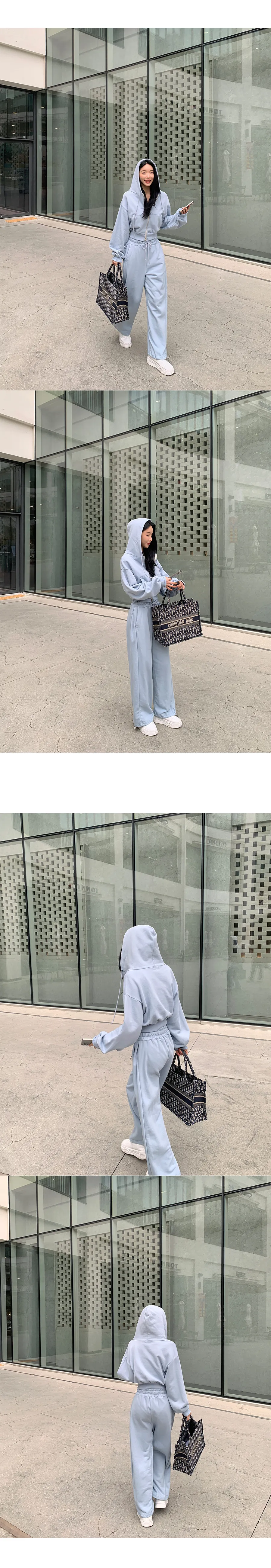 ベロアコーデュロイフード長袖ジップアップハーフウエストゴムドローストリングポケットワイド無地ジップパーカーパンツツーピース(トップス、ボトムス)