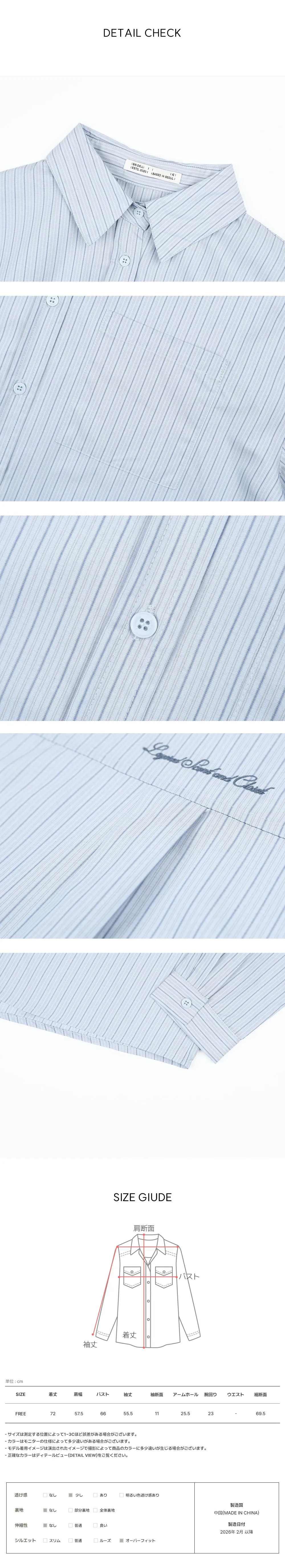 | Size | 肩幅 | 身幅 | 袖丈 | 着丈 | 袖口幅 | 袖幅 | アームホール | 裾幅 |