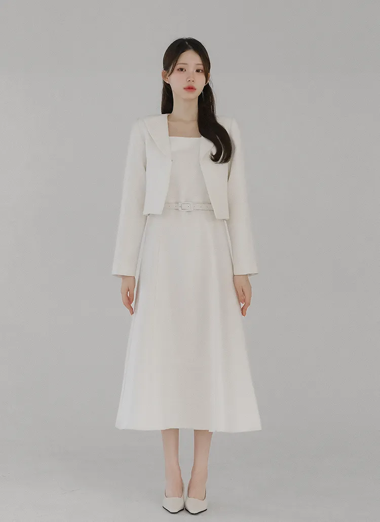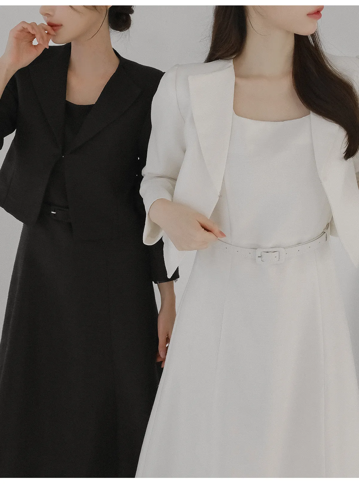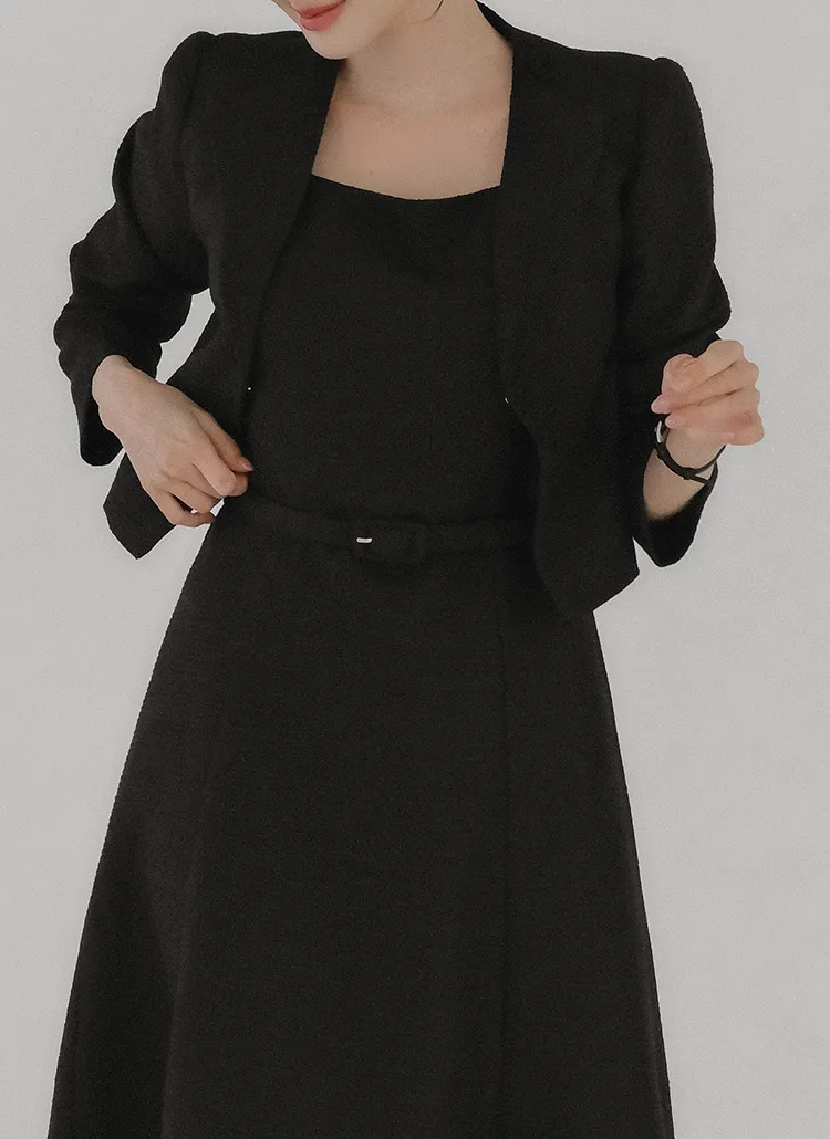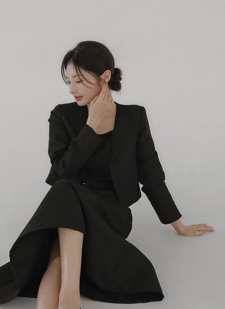 ツイードラウンドネックプリーツハイウエスト肩パッドクロップド長袖ミディツーポケットAラインホックヒドゥンジッパー配色ツーピース(トップス、ボトムス)スカートジャケット