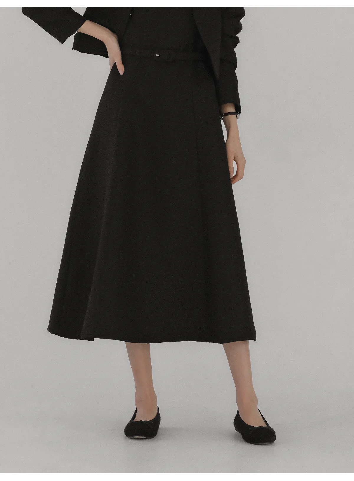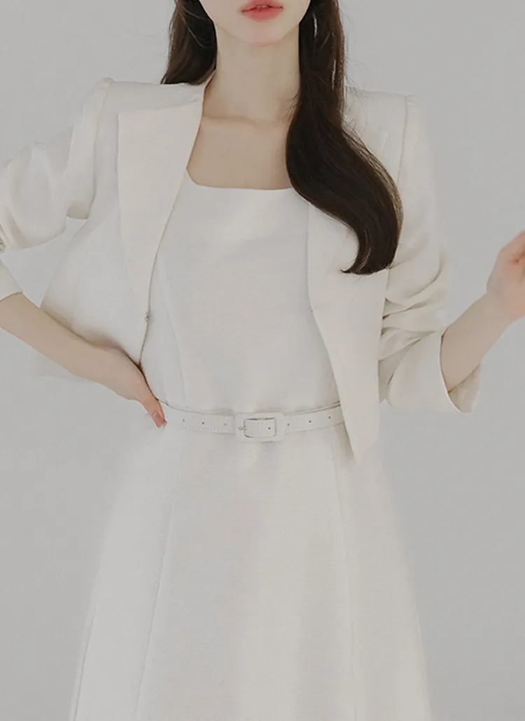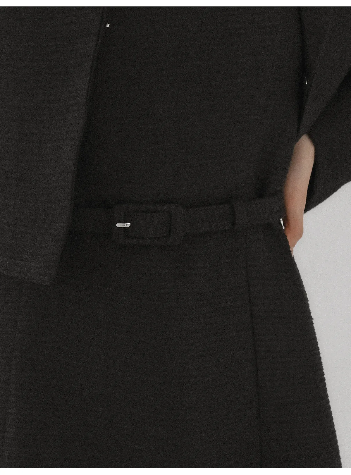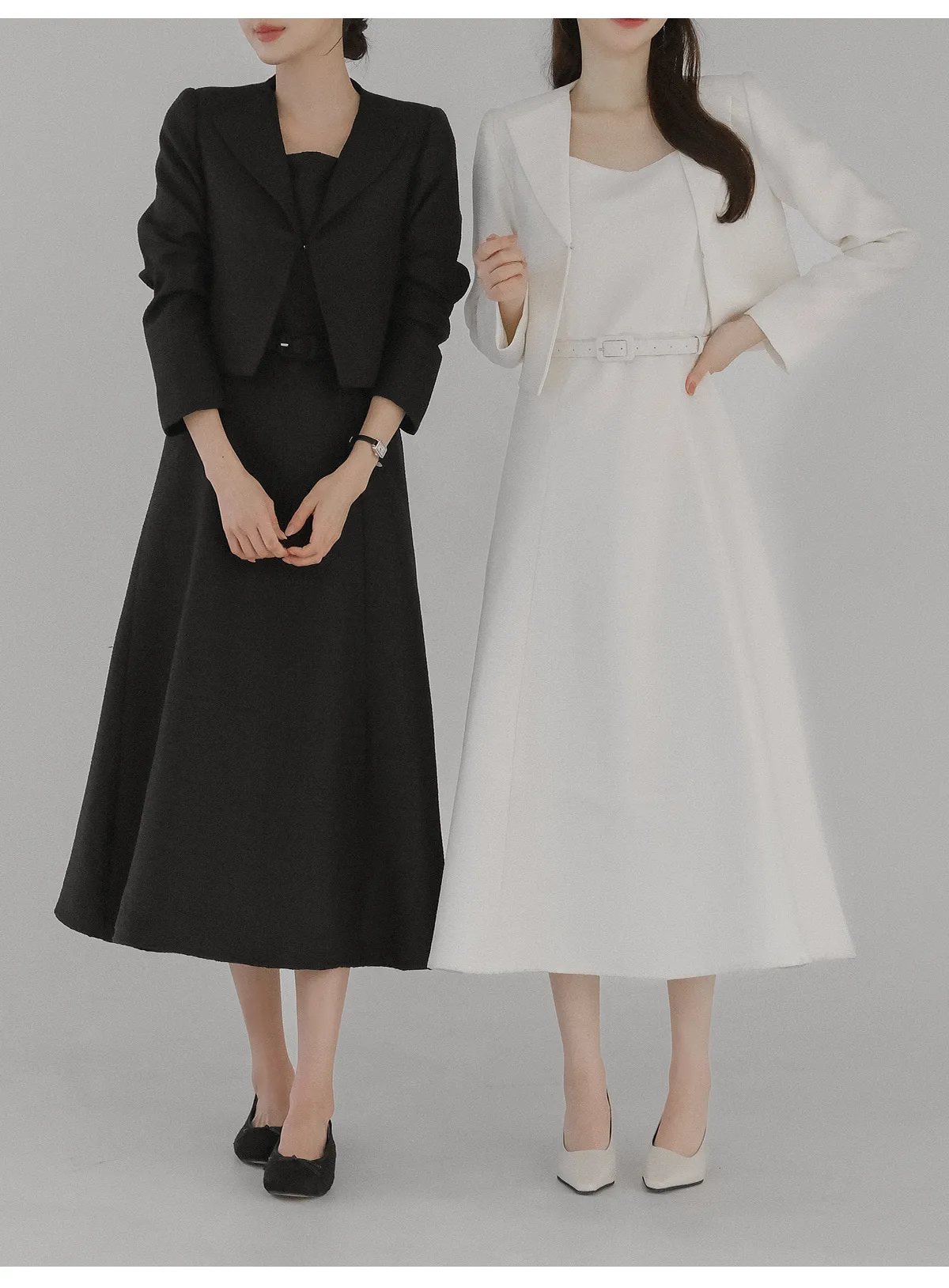 ツイードラウンドネックプリーツハイウエスト肩パッドクロップド長袖ミディツーポケットAラインホックヒドゥンジッパー配色ツーピース(トップス、ボトムス)スカートジャケット