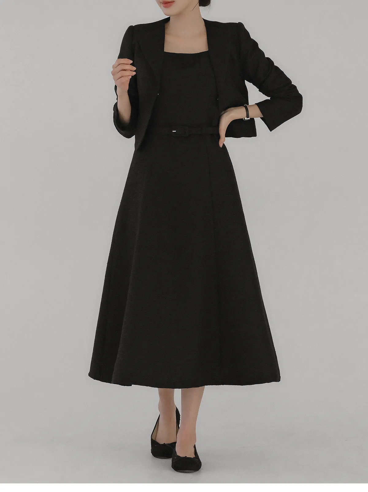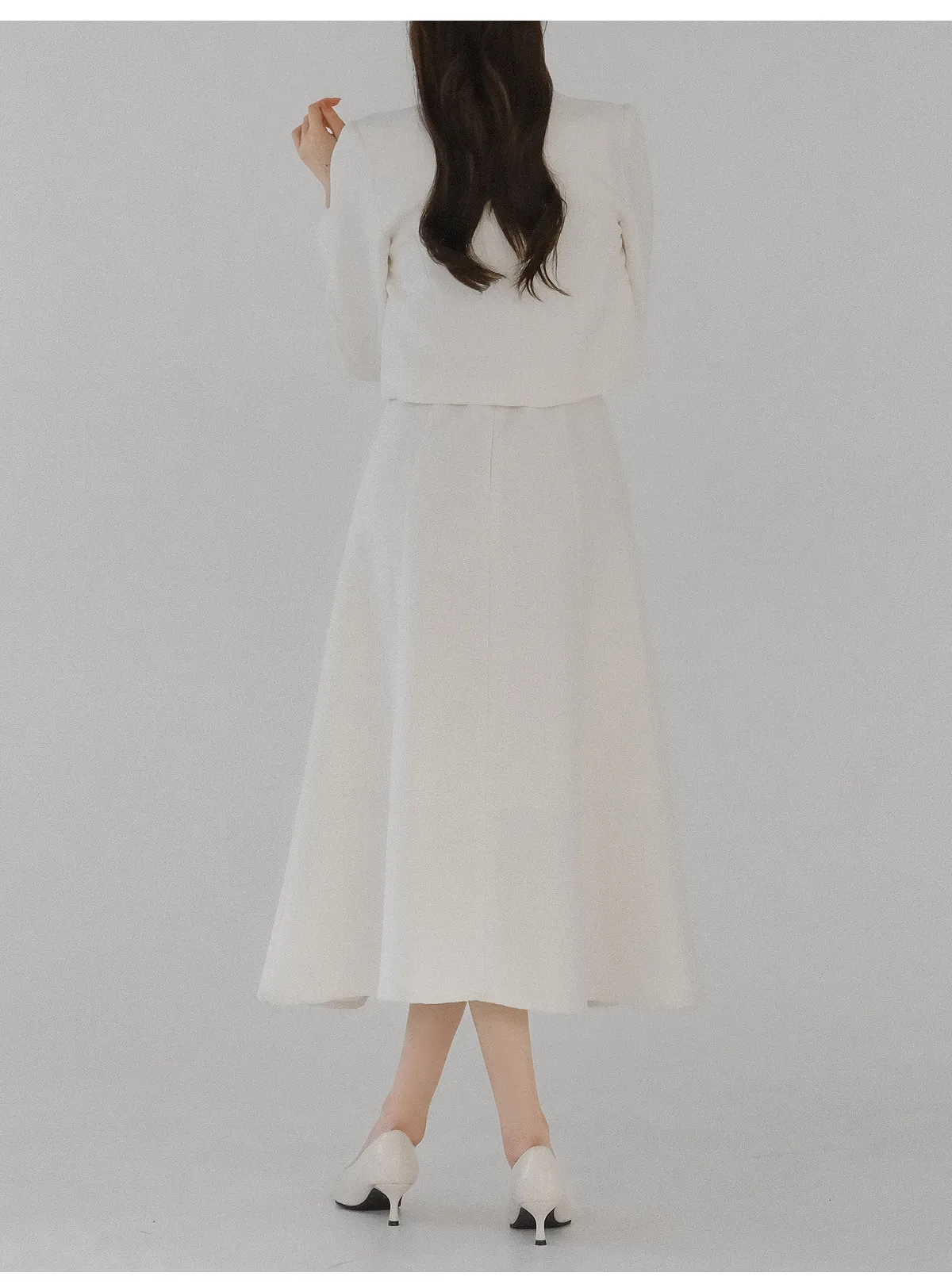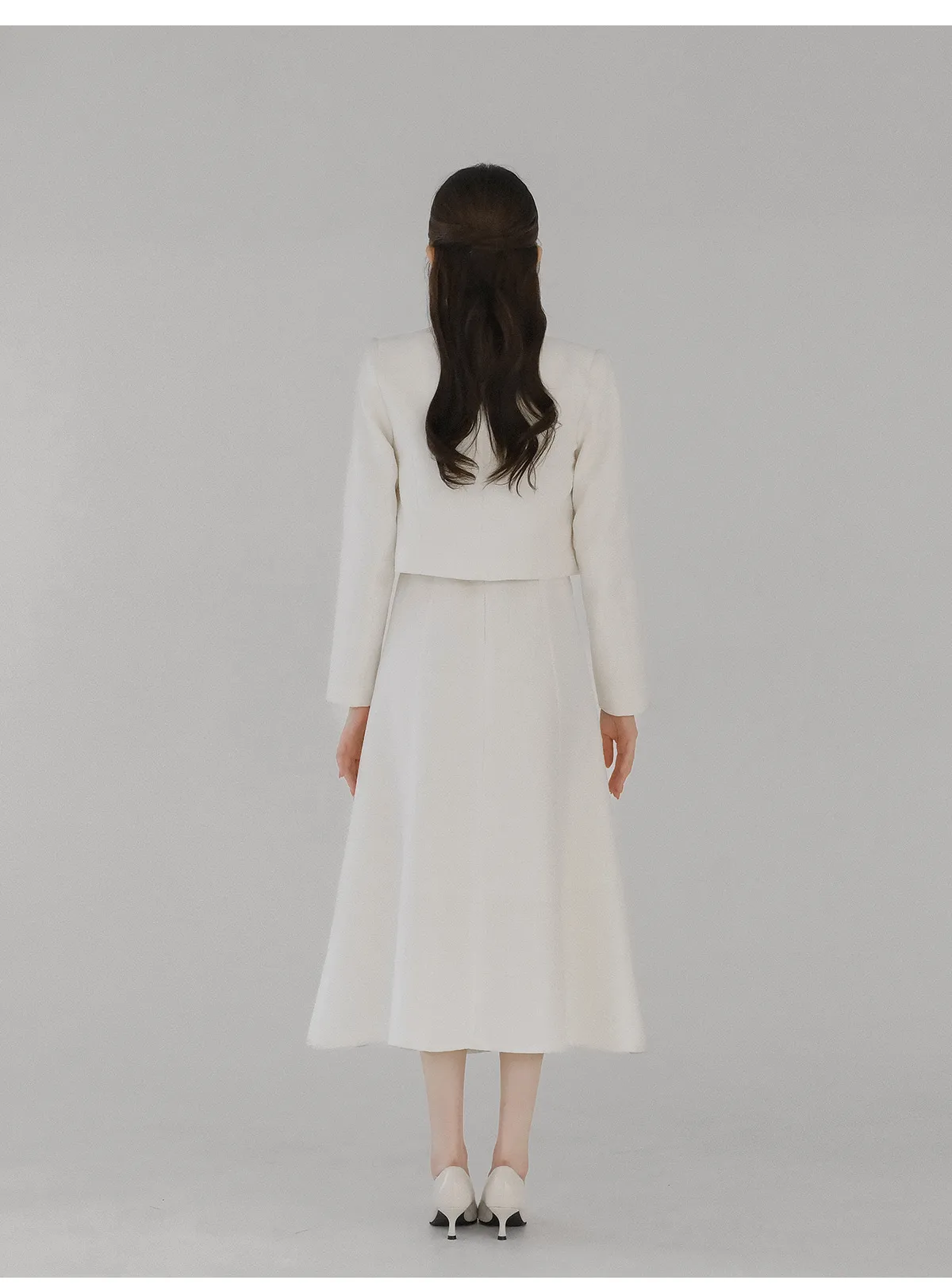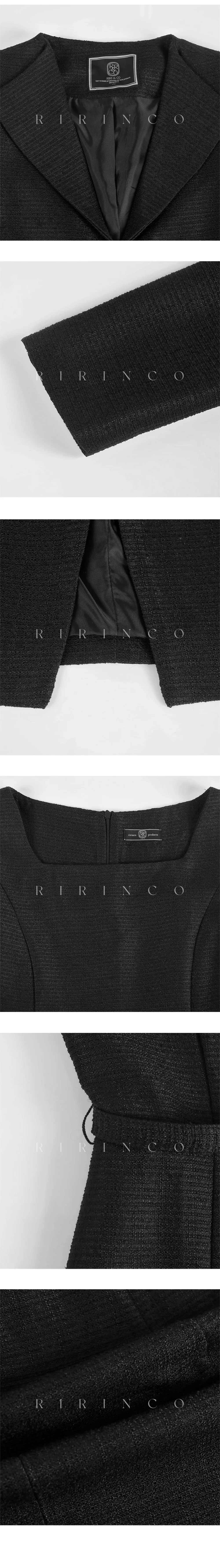 ツイードグリッタースクエアネックパール調ボタン肩パッドクロップドロング長袖タックフレアAラインフェイクポケットヒドゥンジッパーツーピース(トップス、ボトムス)スカートジャケット