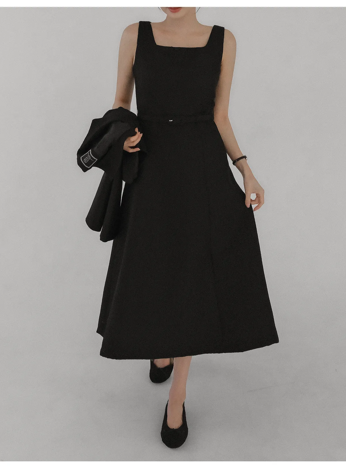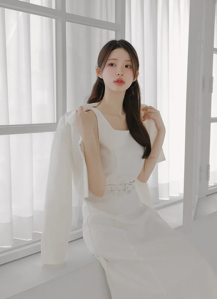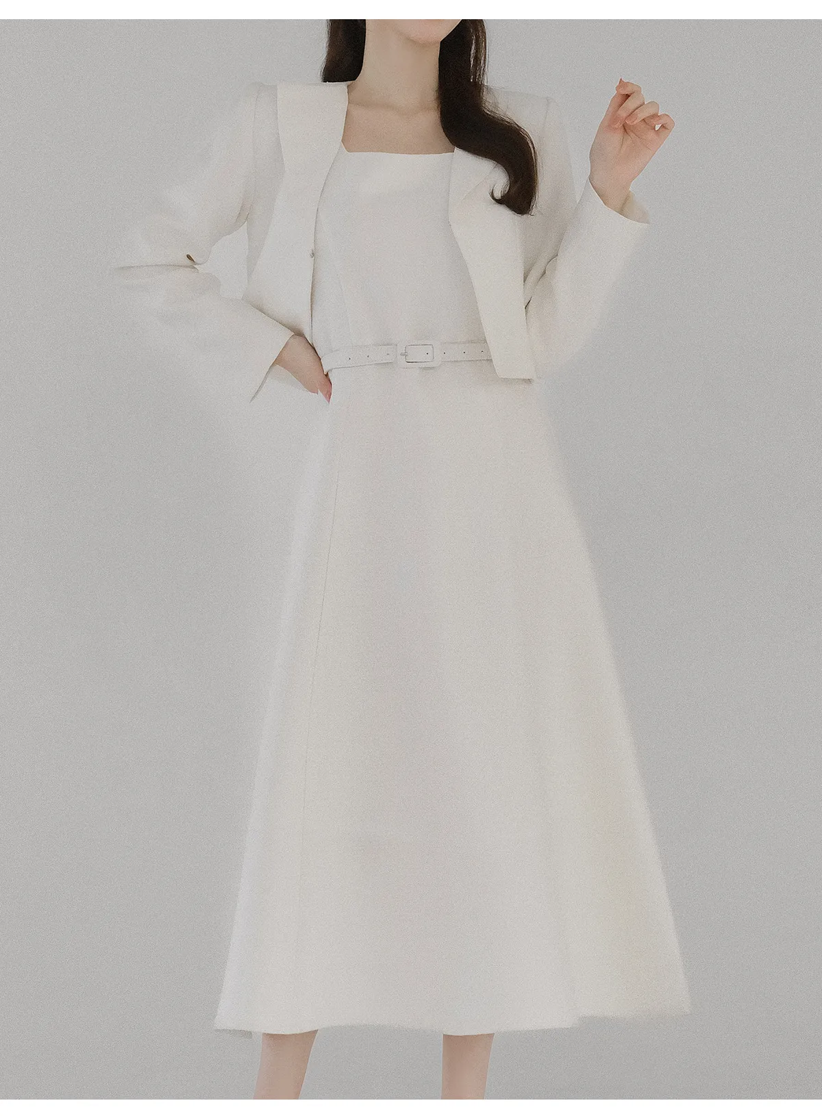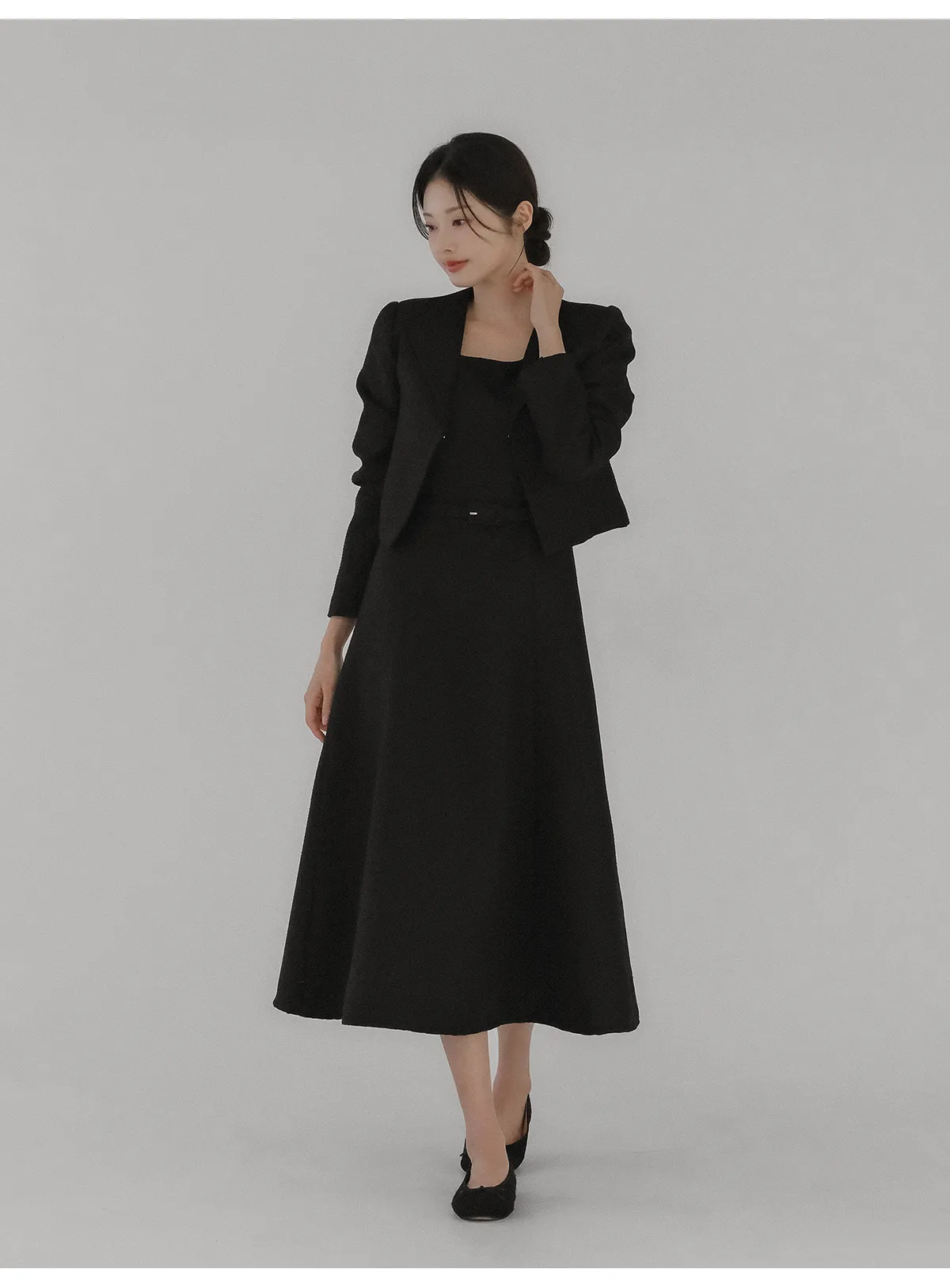 ツイードグリッタースクエアネックパール調ボタン肩パッドクロップドロング長袖タックフレアAラインフェイクポケットヒドゥンジッパーツーピース(トップス、ボトムス)スカートジャケット