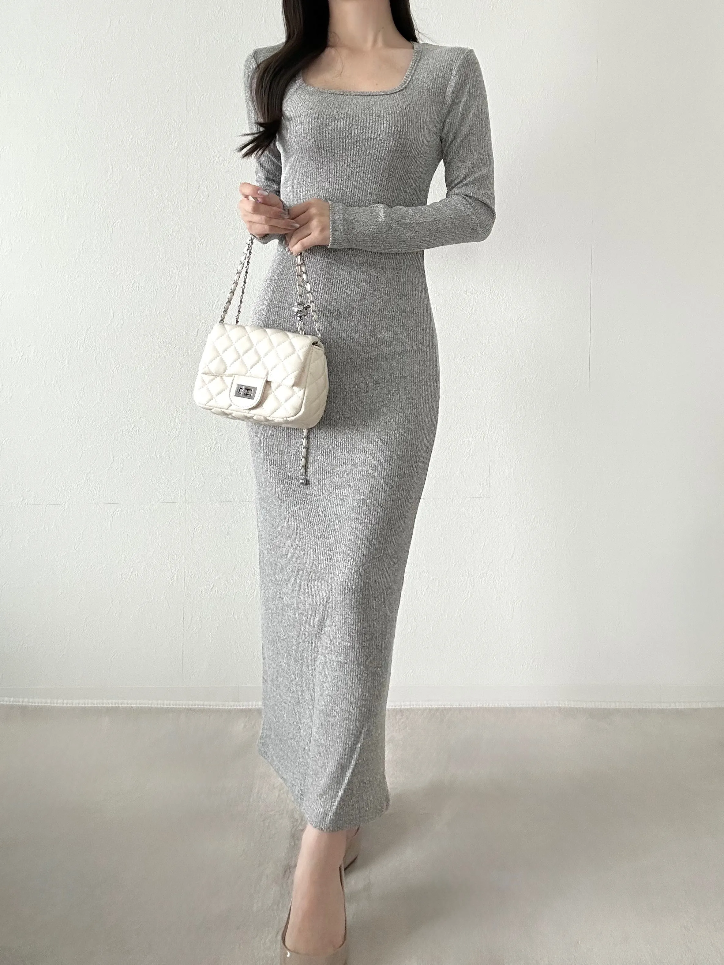 リブアクリルロング無地ショルダーバッグ