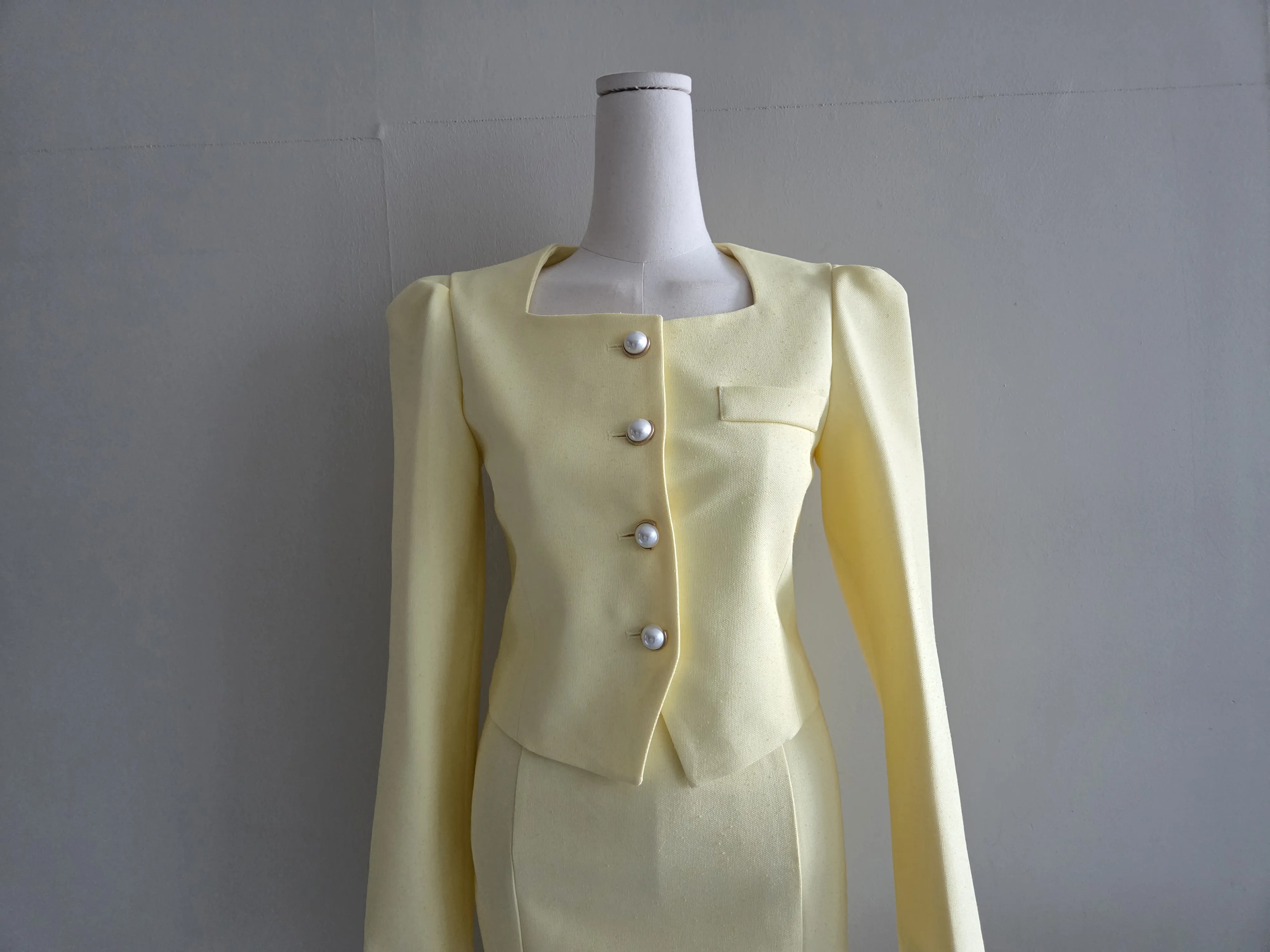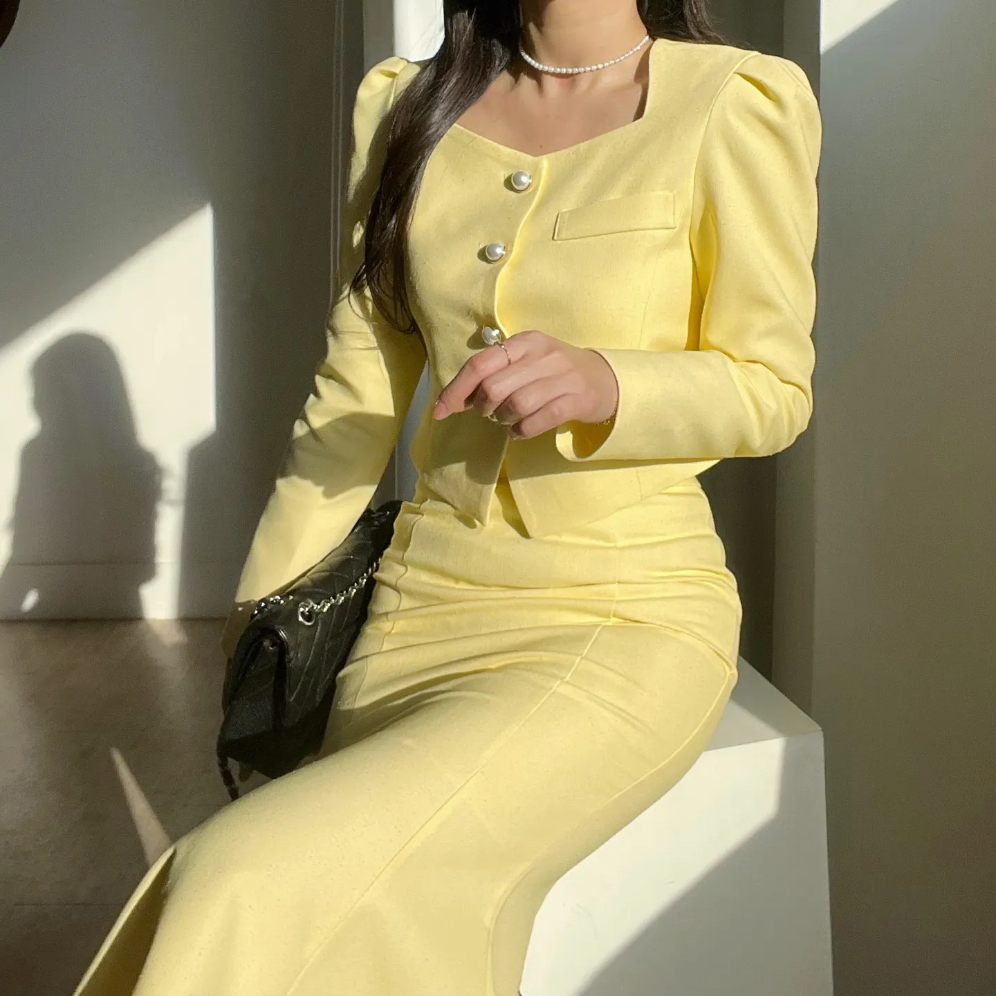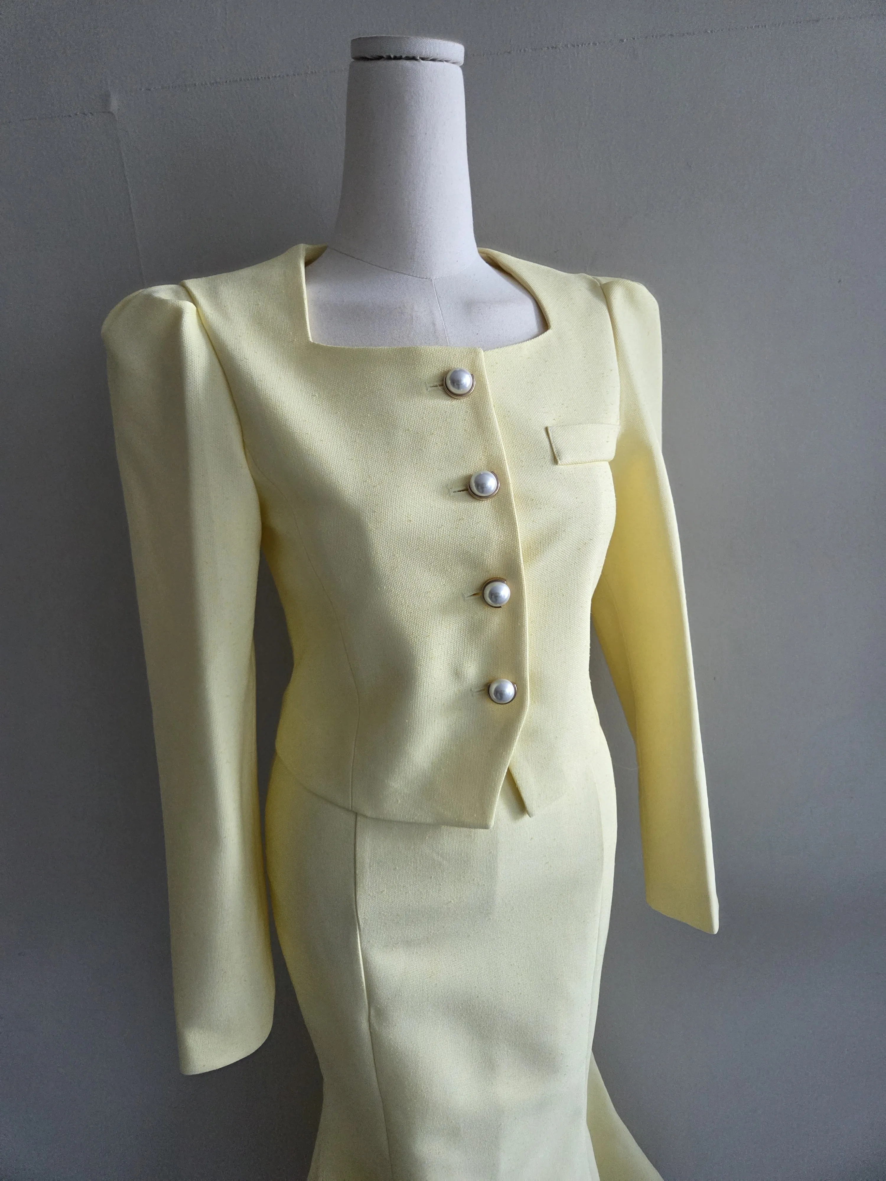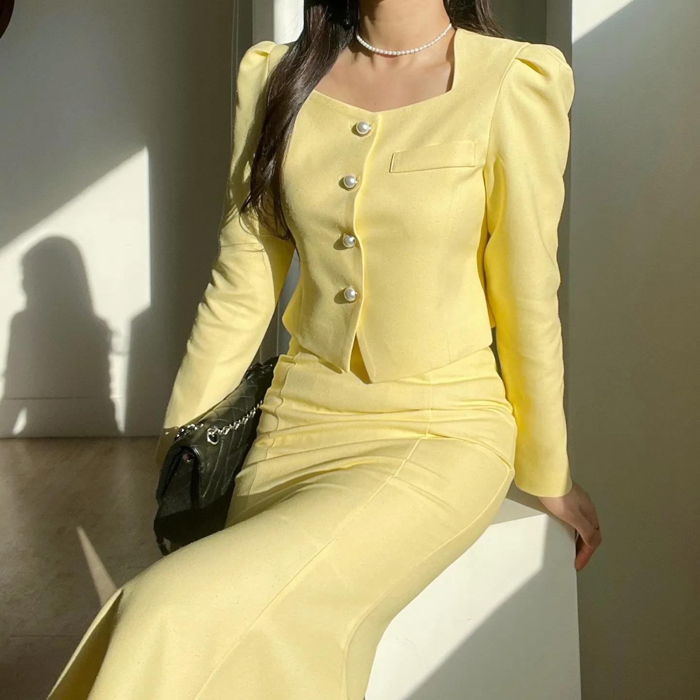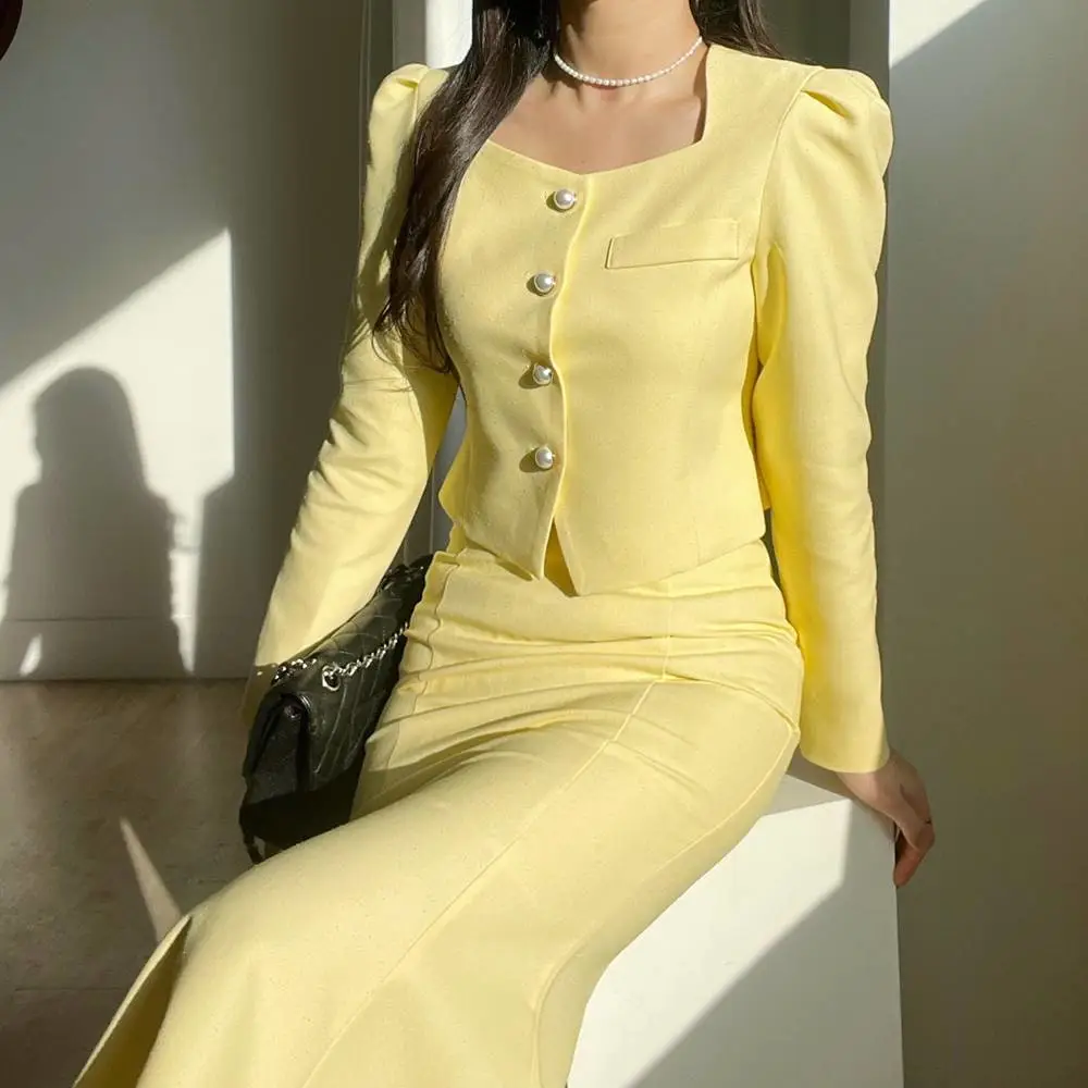 カラー肩パッドパール調ボタンクロップド長袖パフスリーブラインロングAラインフレアヒドゥンジッパー無地ジャケットスカートツーピース(トップス、ボトムス)