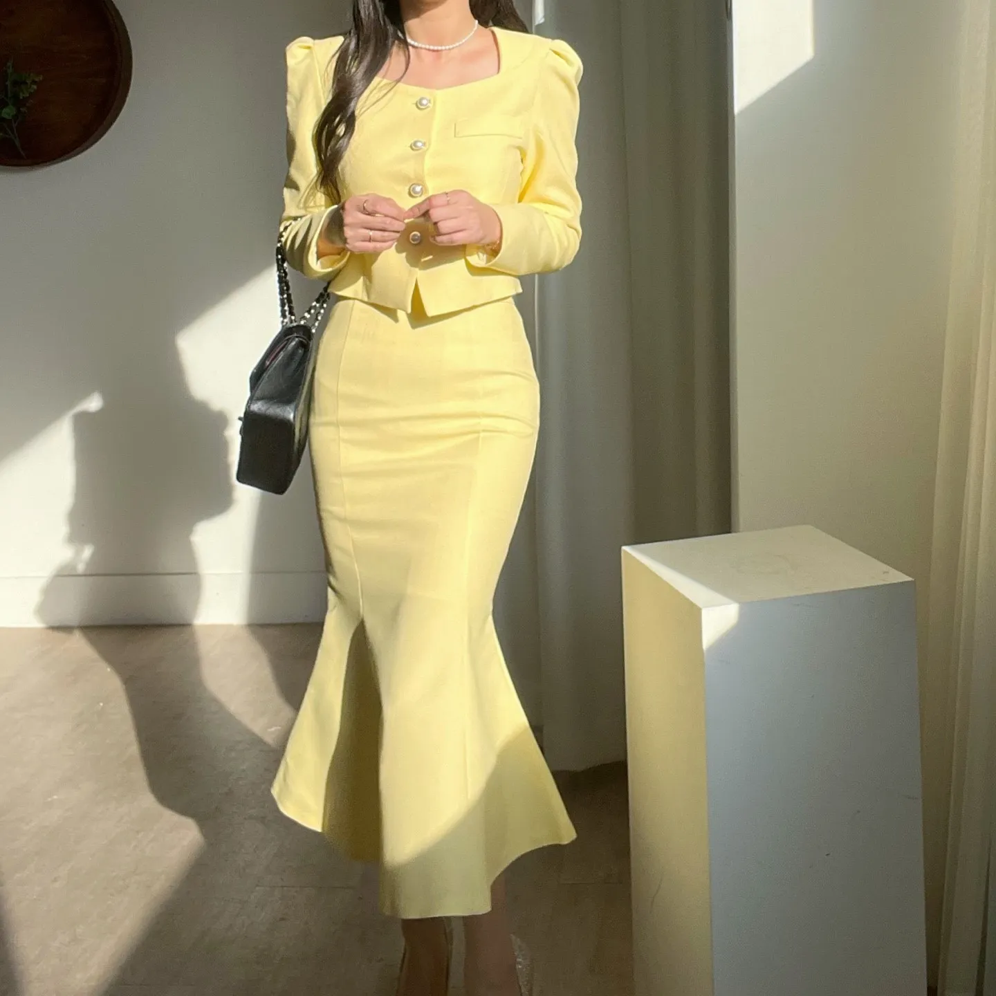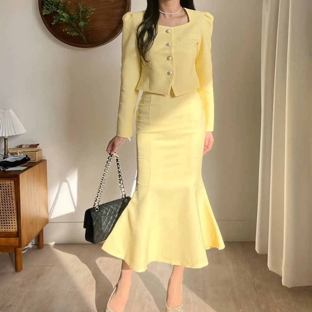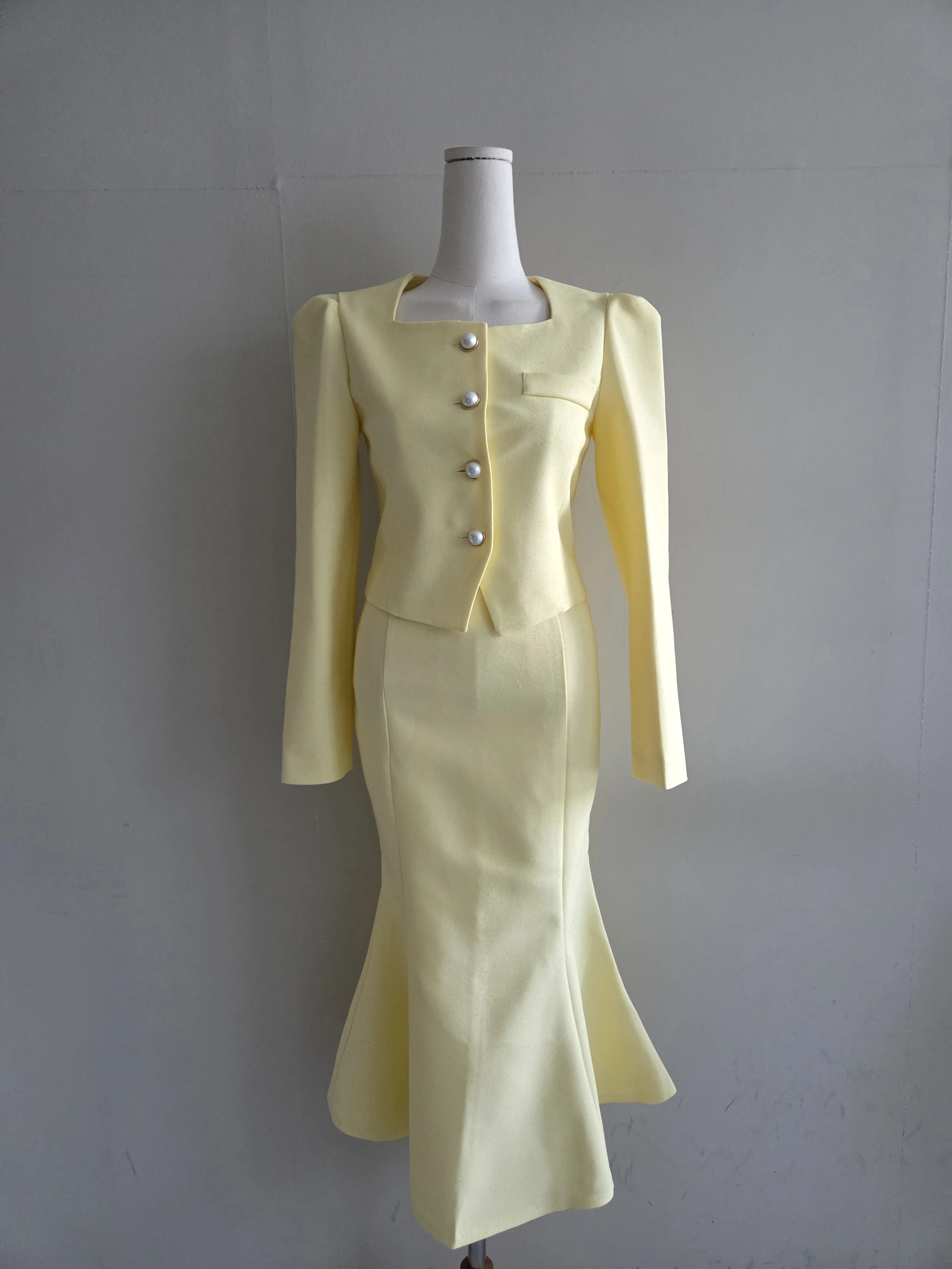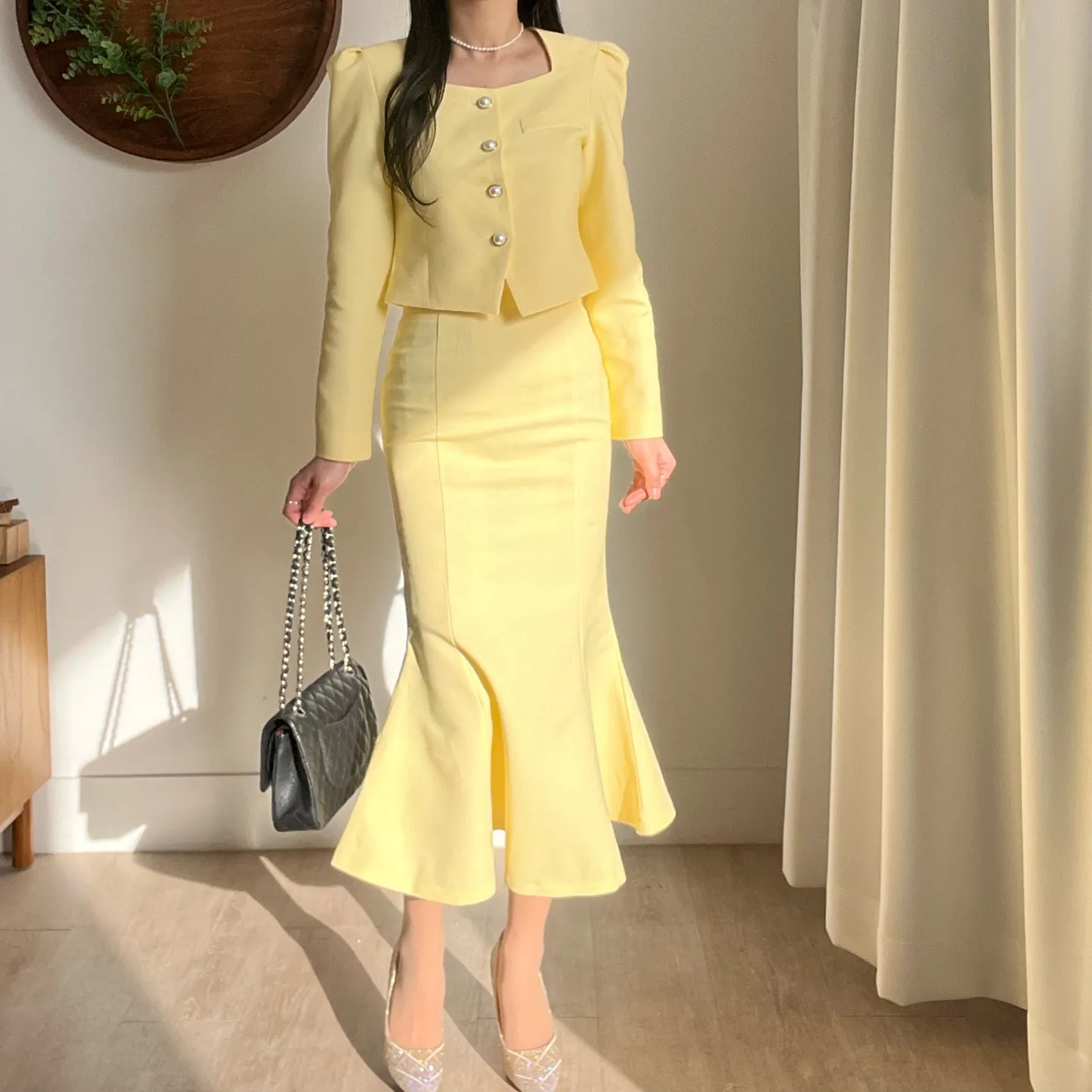 カラー肩パッドパール調ボタンクロップド長袖パフスリーブラインロングAラインフレアヒドゥンジッパー無地ジャケットスカートツーピース(トップス、ボトムス)