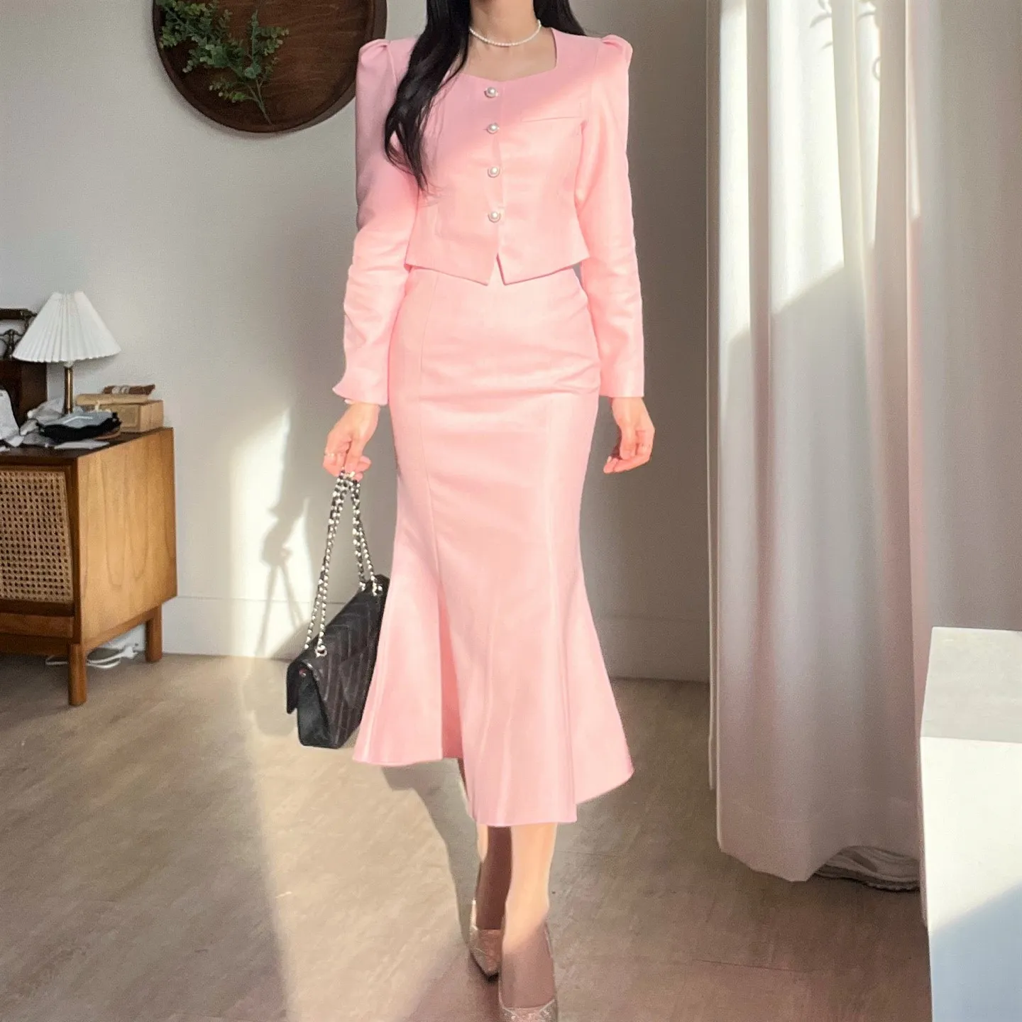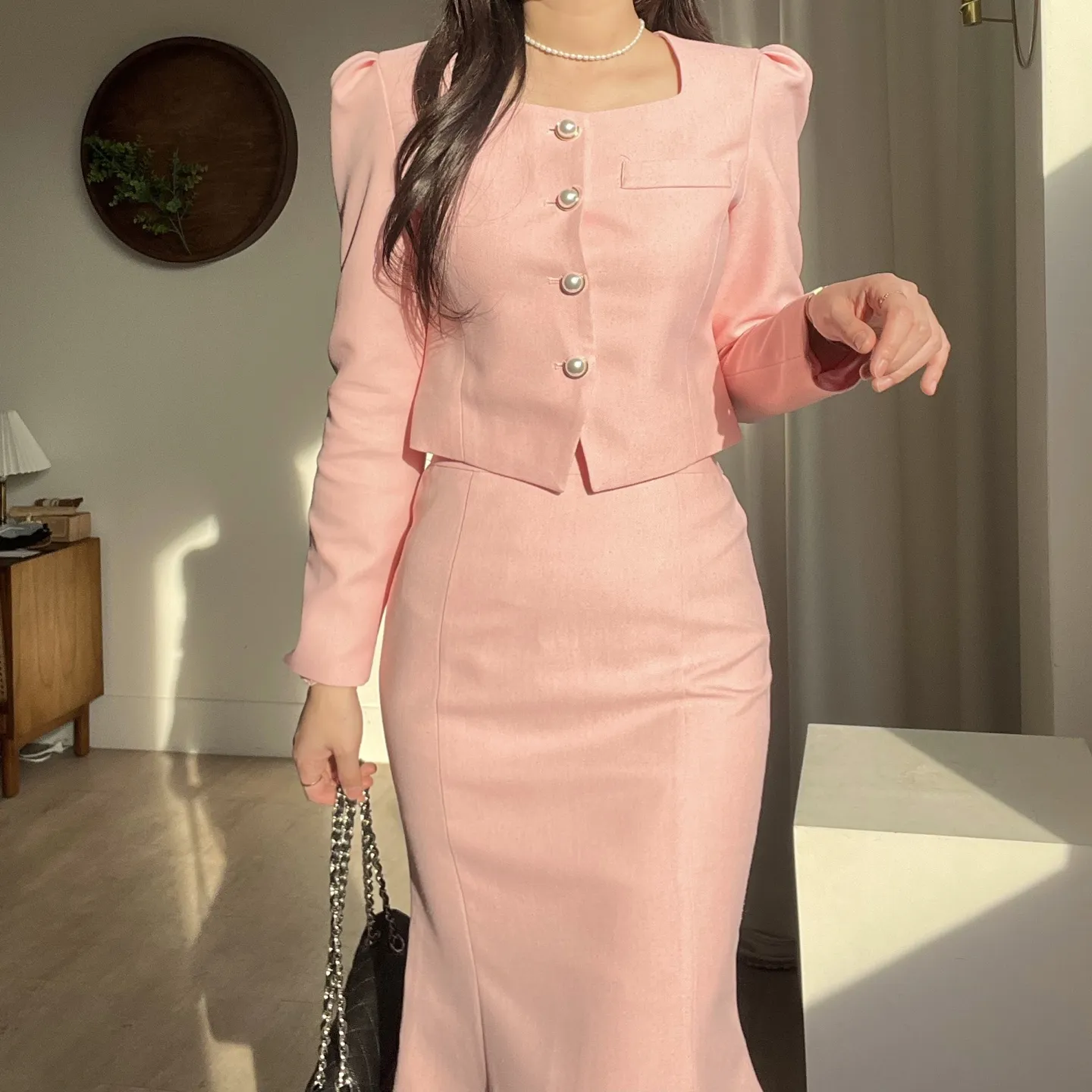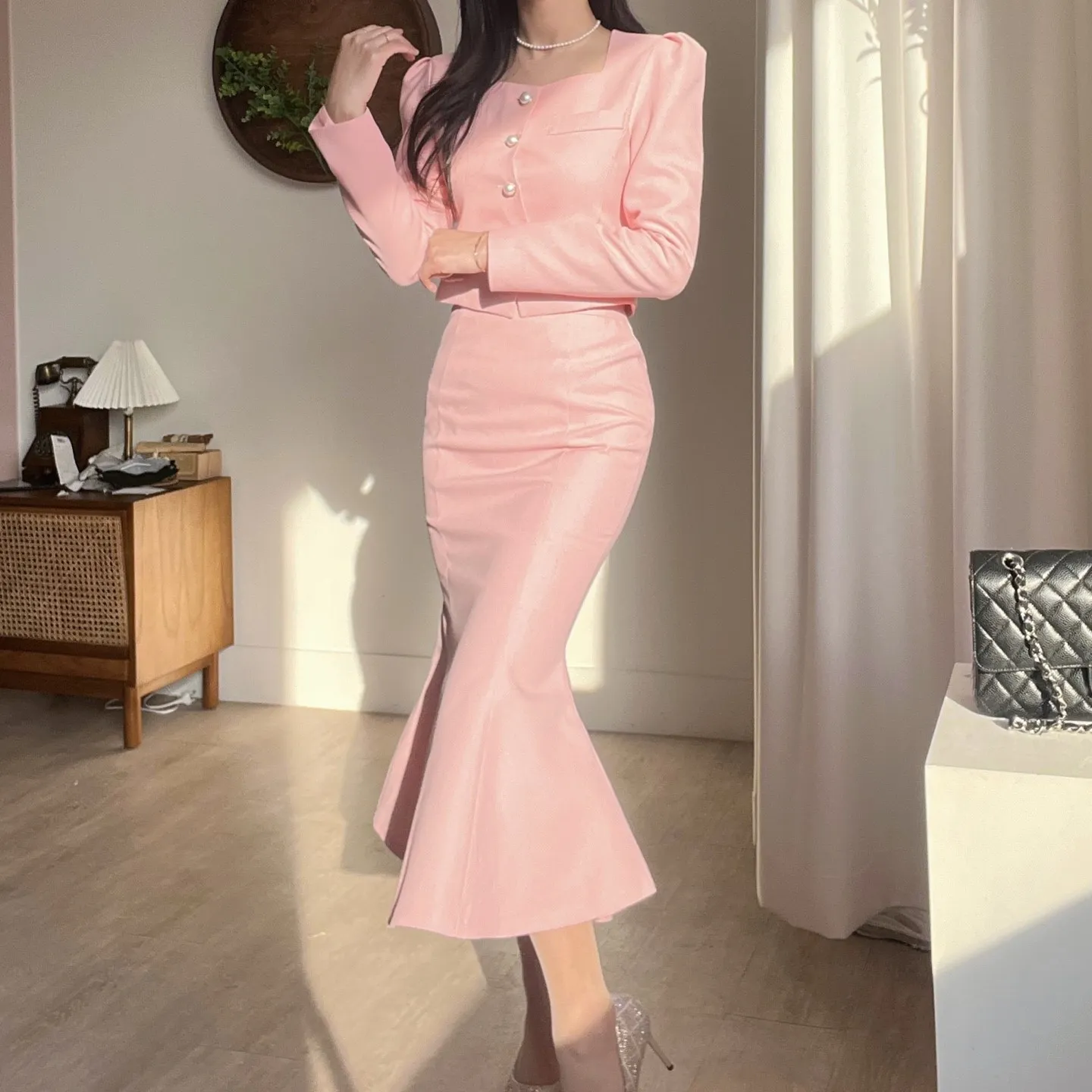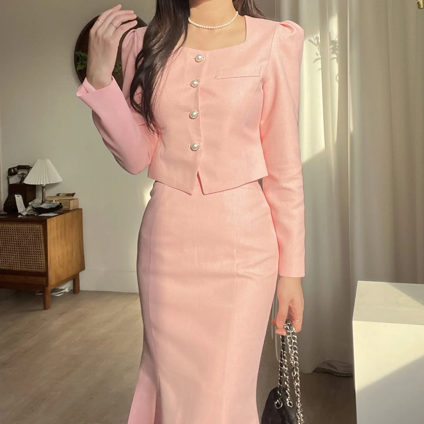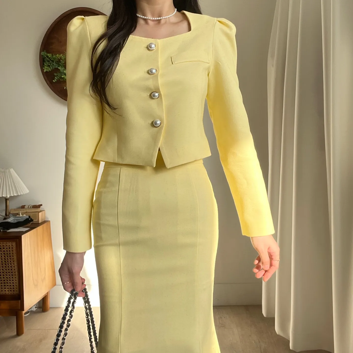 カラー肩パッドパール調ボタンクロップド長袖パフスリーブラインロングAラインフレアヒドゥンジッパー無地ジャケットスカートツーピース(トップス、ボトムス)