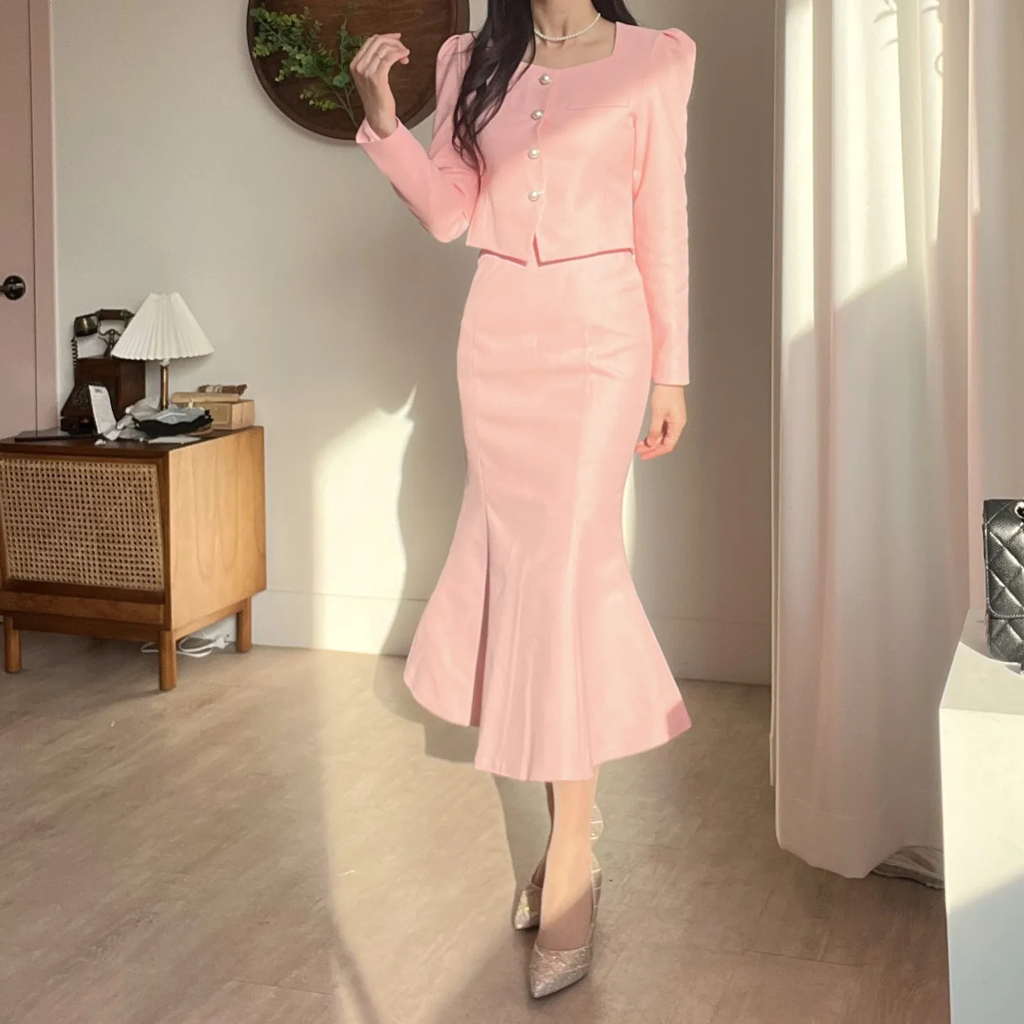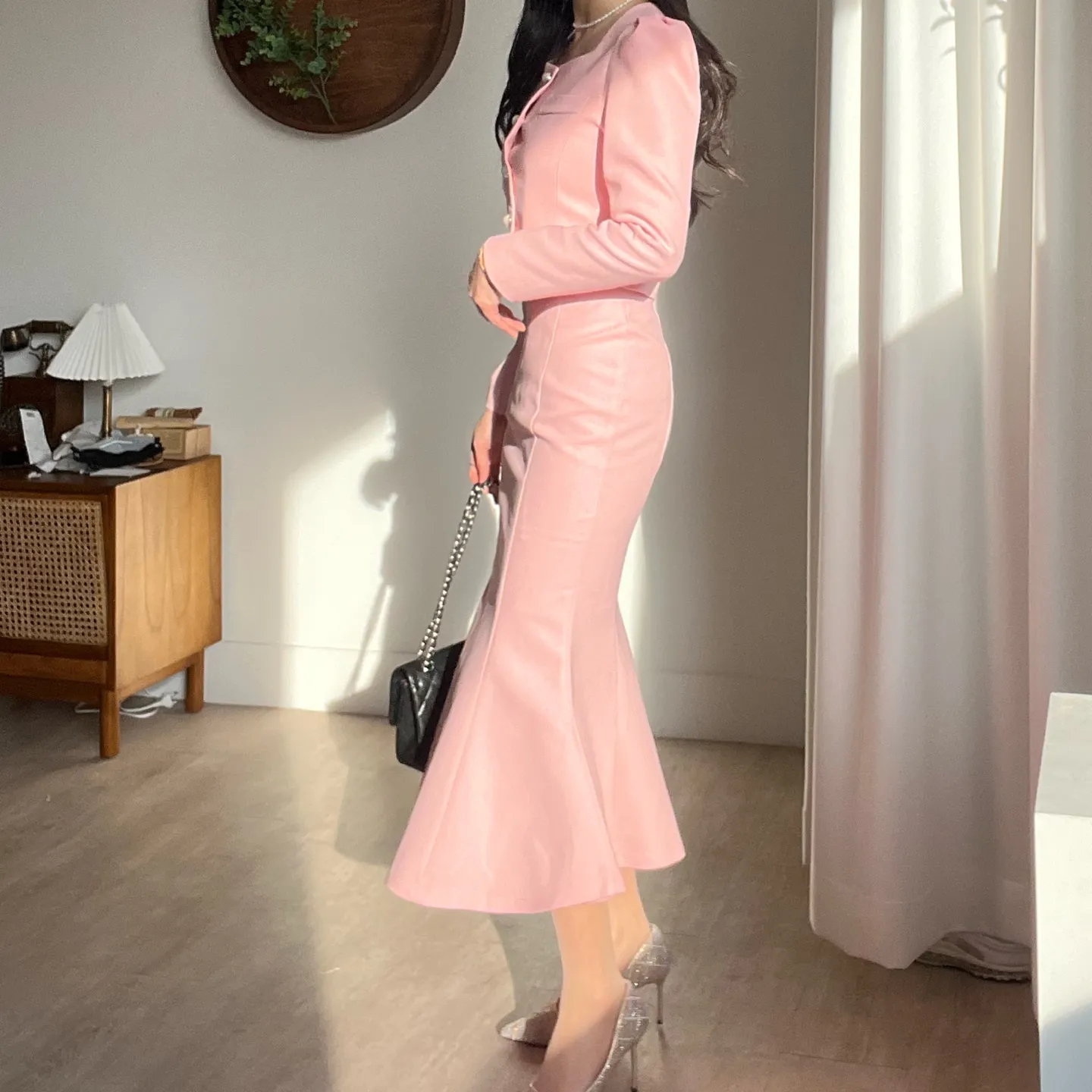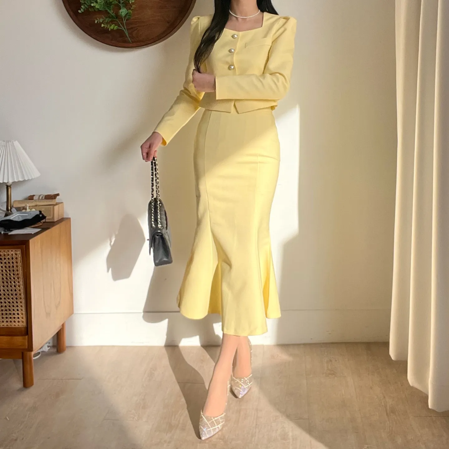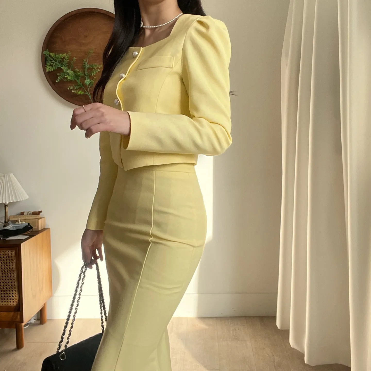 カラー肩パッドパール調ボタンクロップド長袖パフスリーブラインロングAラインフレアヒドゥンジッパー無地ジャケットスカートツーピース(トップス、ボトムス)