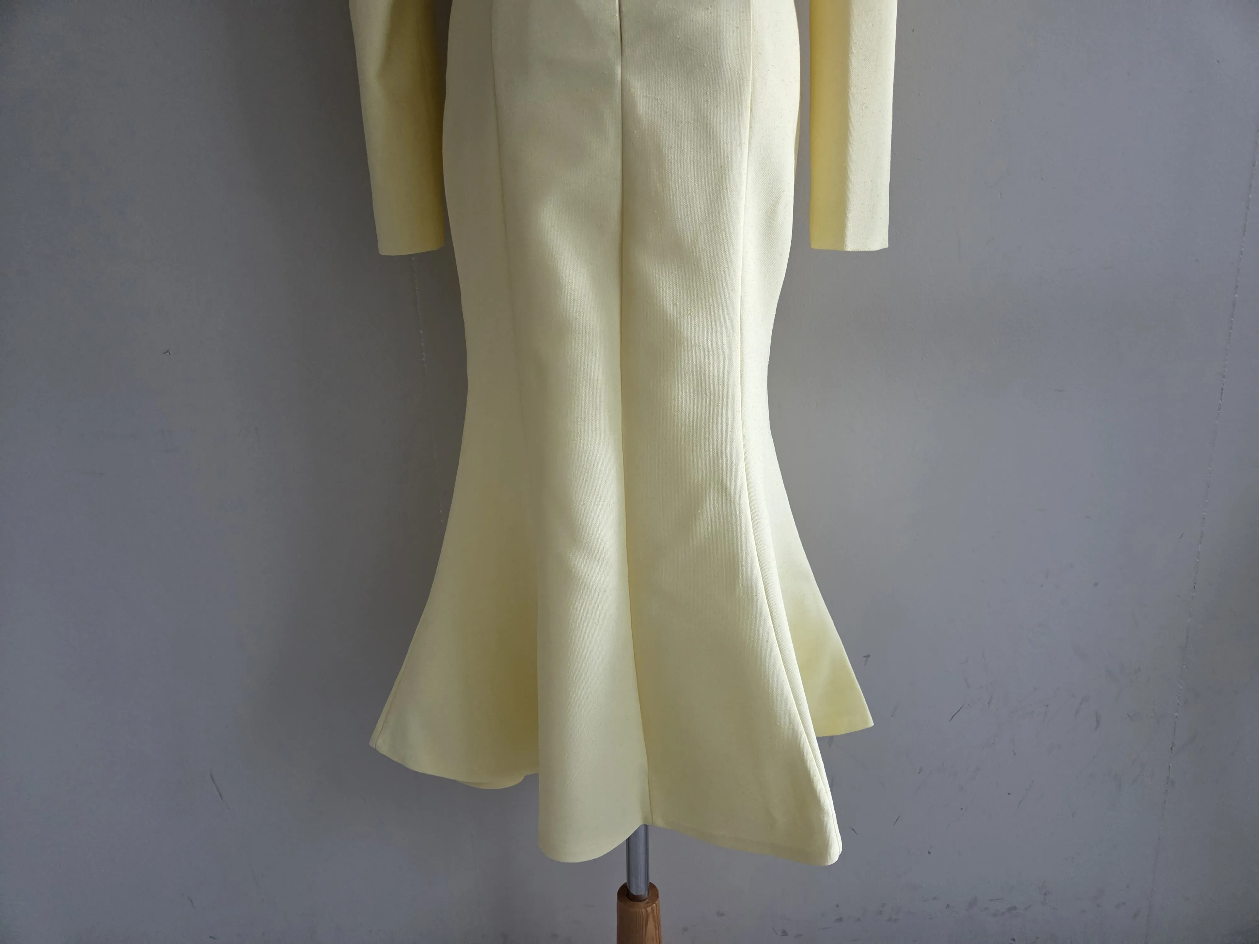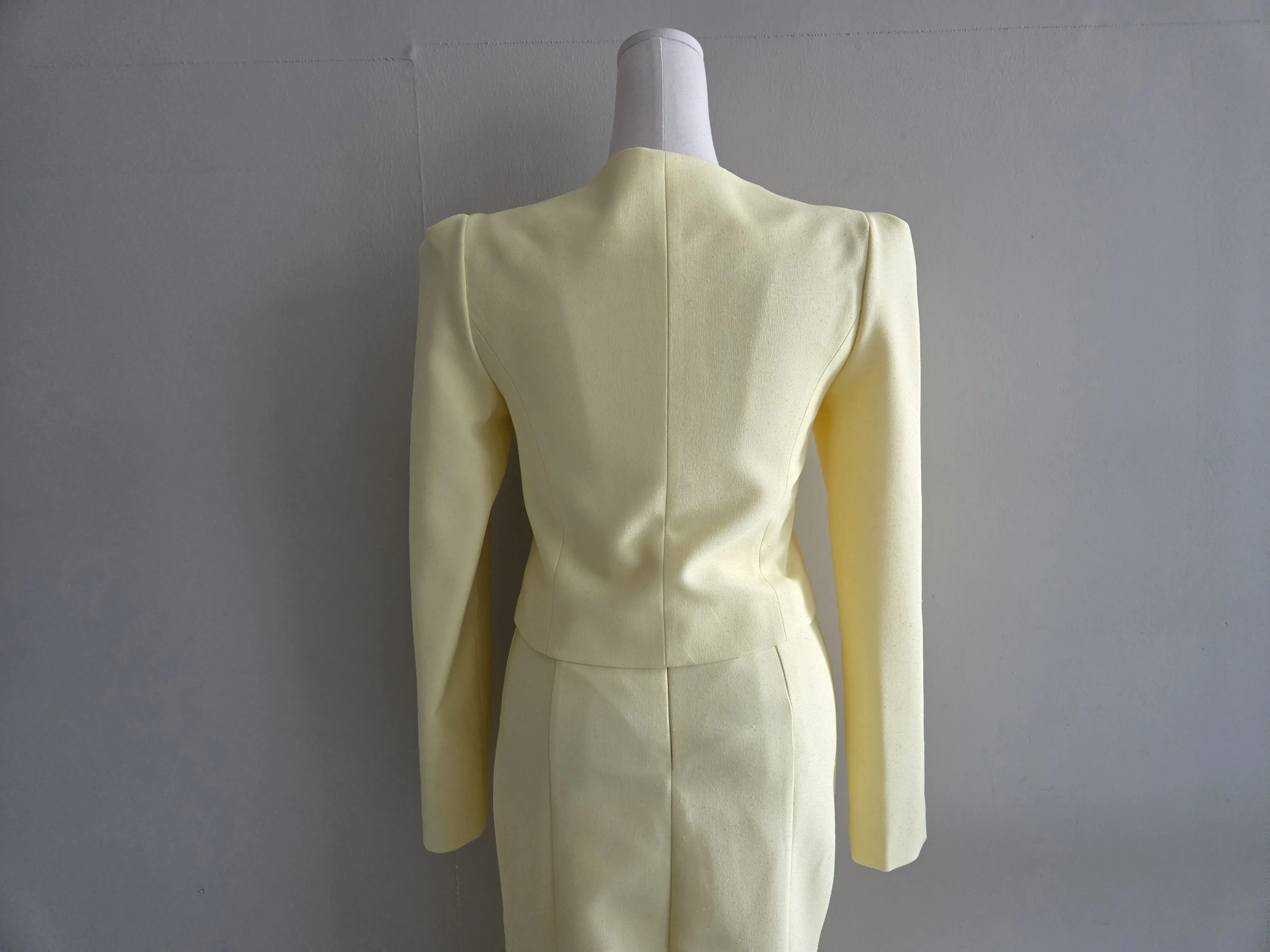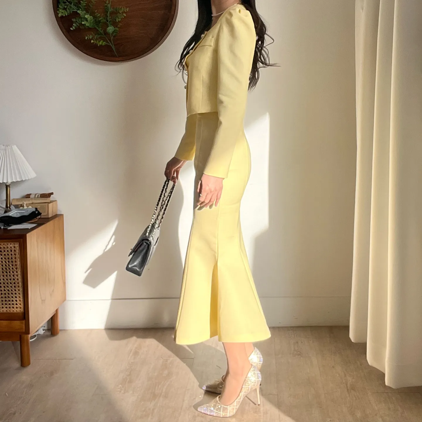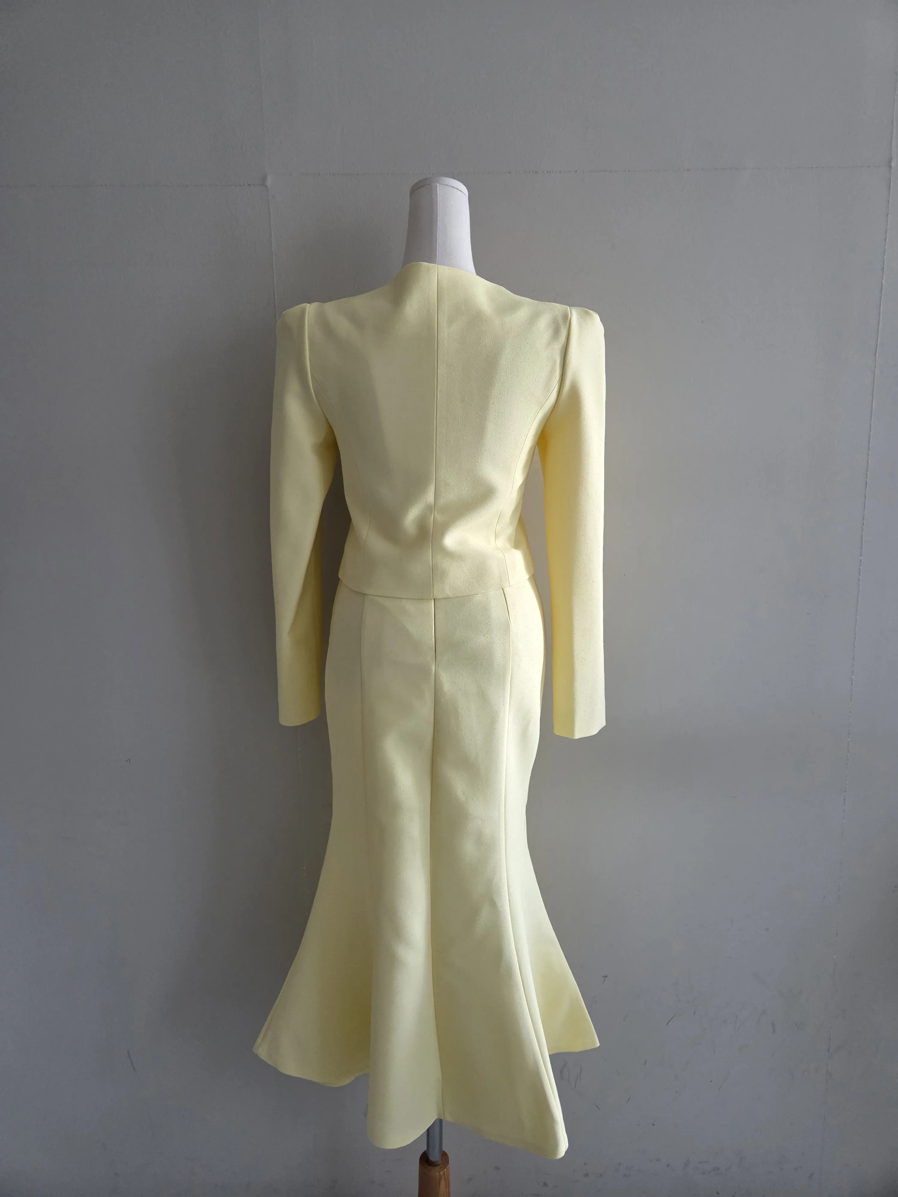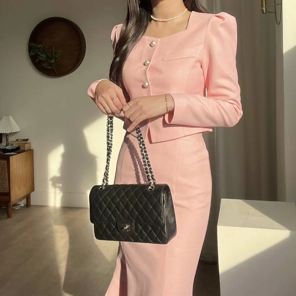 カラー肩パッドパール調ボタンクロップド長袖パフスリーブラインロングAラインフレアヒドゥンジッパー無地ジャケットスカートツーピース(トップス、ボトムス)