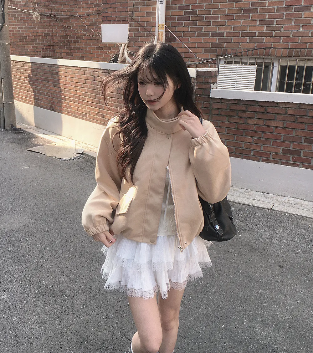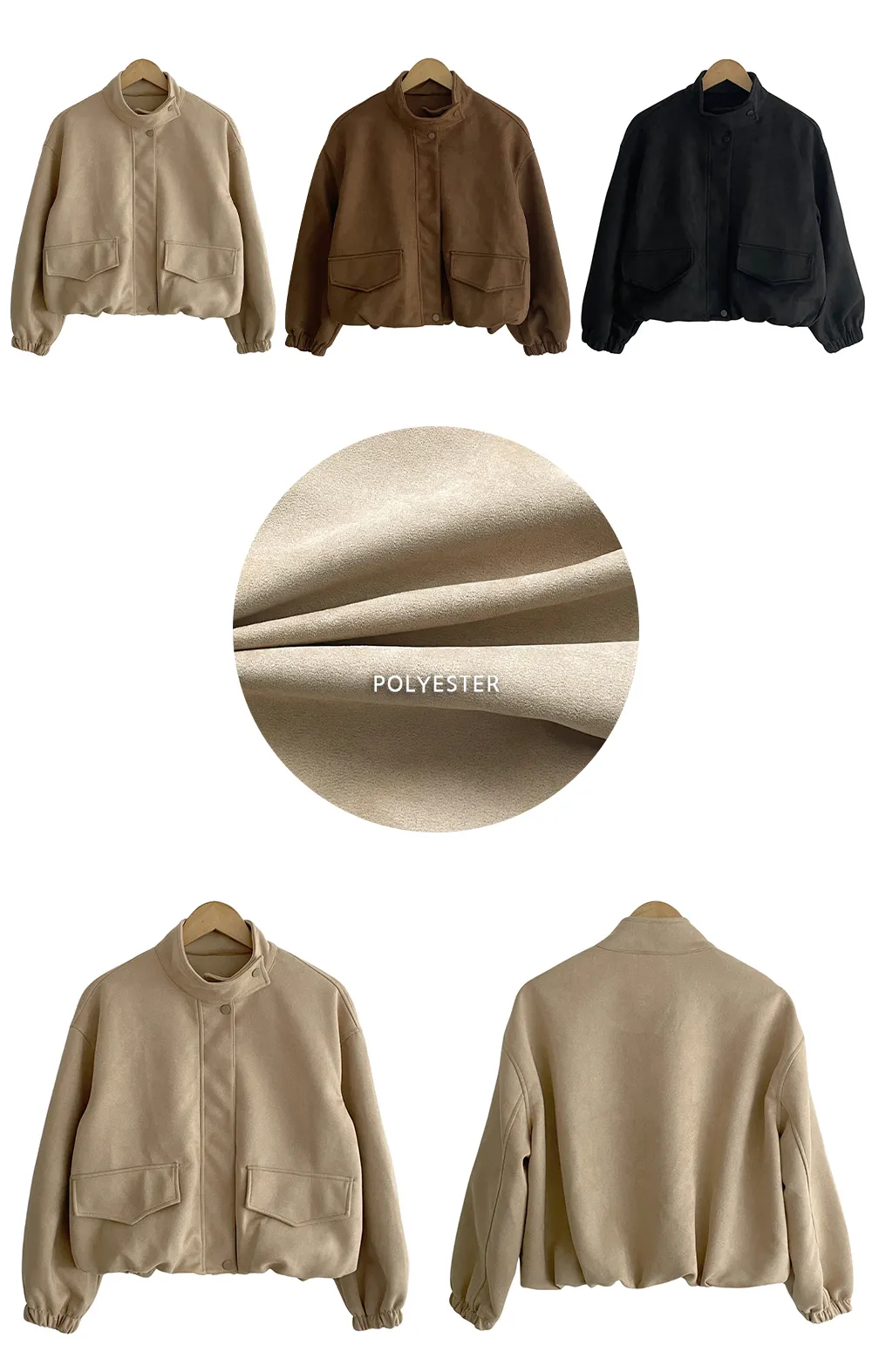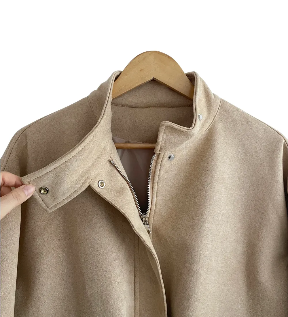 コットンジップアップハイネックドローストリングスリットピンタックゴムオーバーサイズロングルーズフラップポケットスナップボタンハーフドロップショルダー無地ジャンパー[選べる丈]