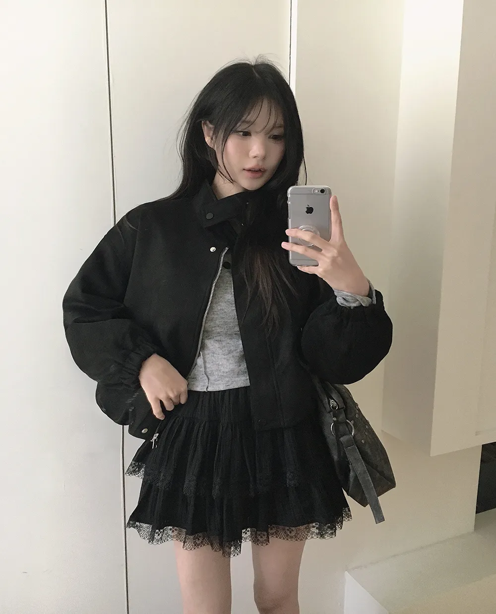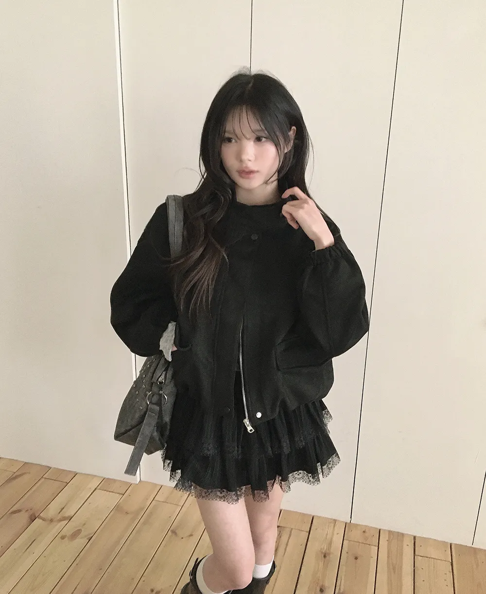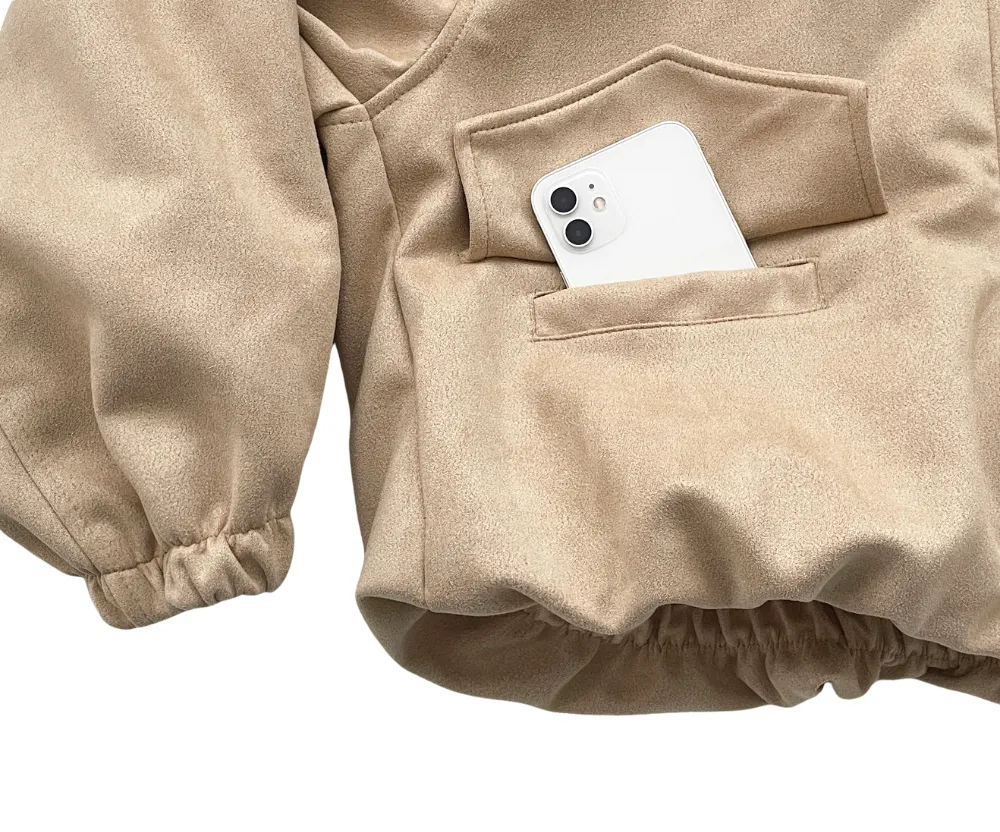 コットンジップアップハイネックドローストリングスリットピンタックゴムオーバーサイズロングルーズフラップポケットスナップボタンハーフドロップショルダー無地ジャンパー[選べる丈]