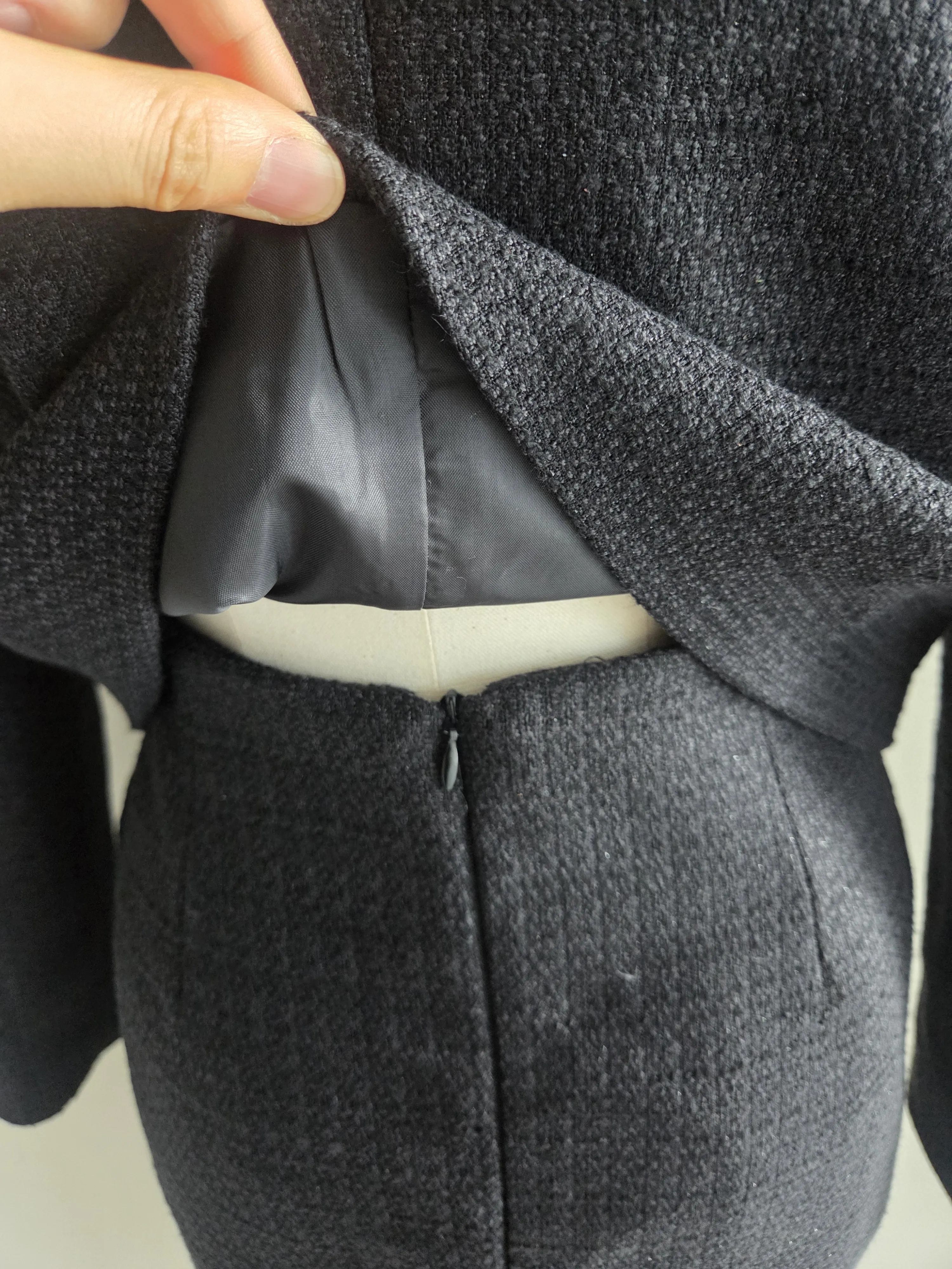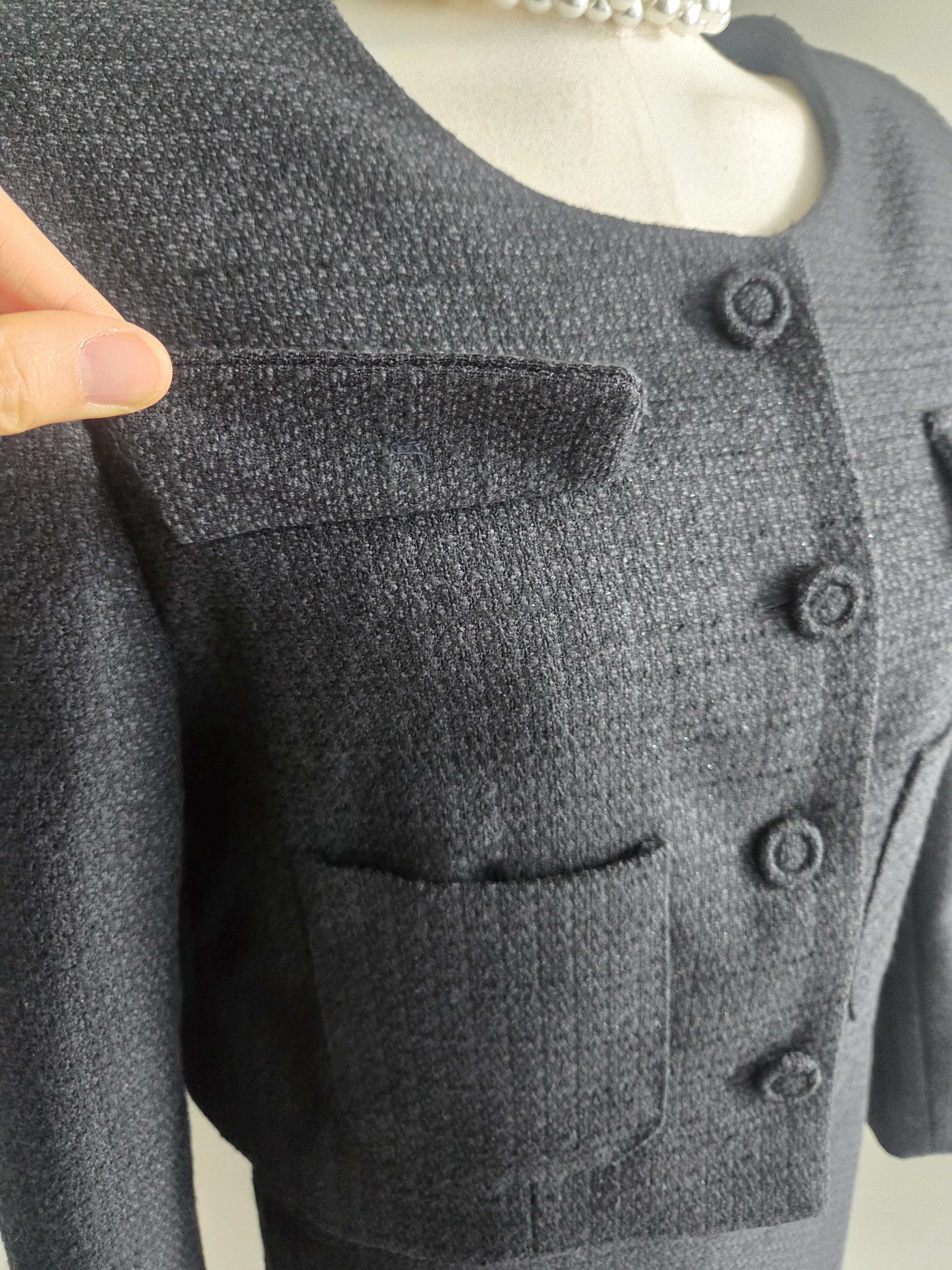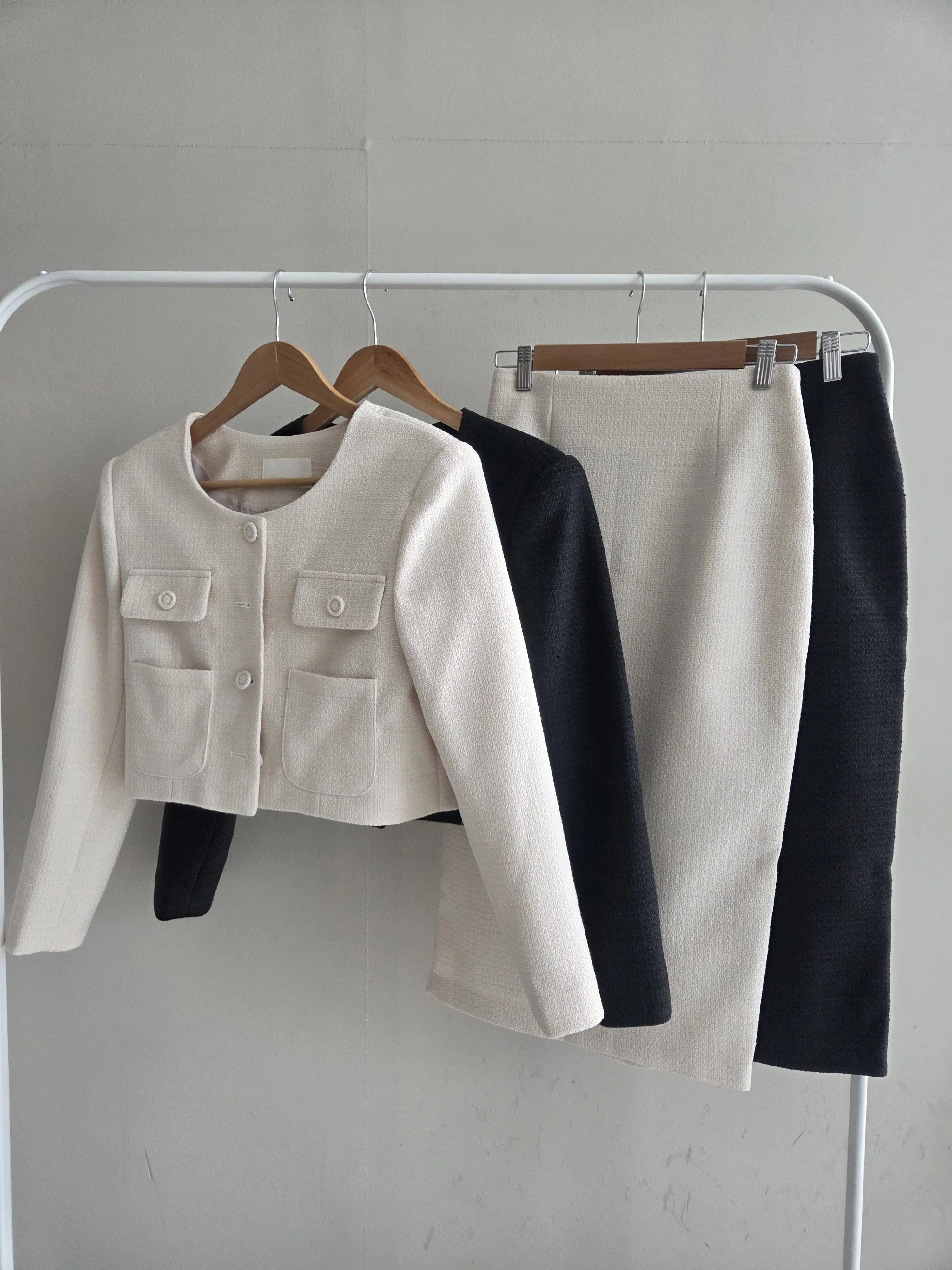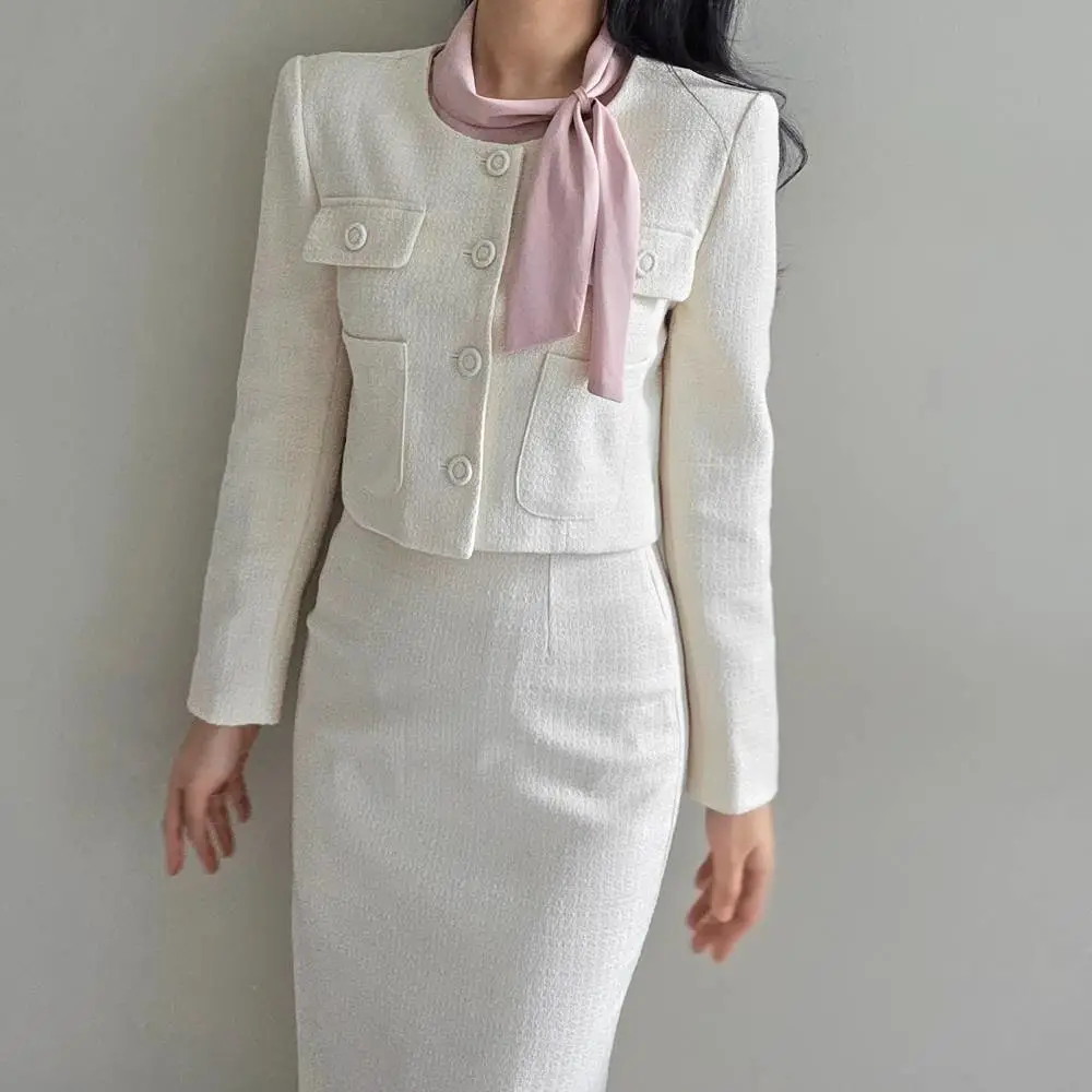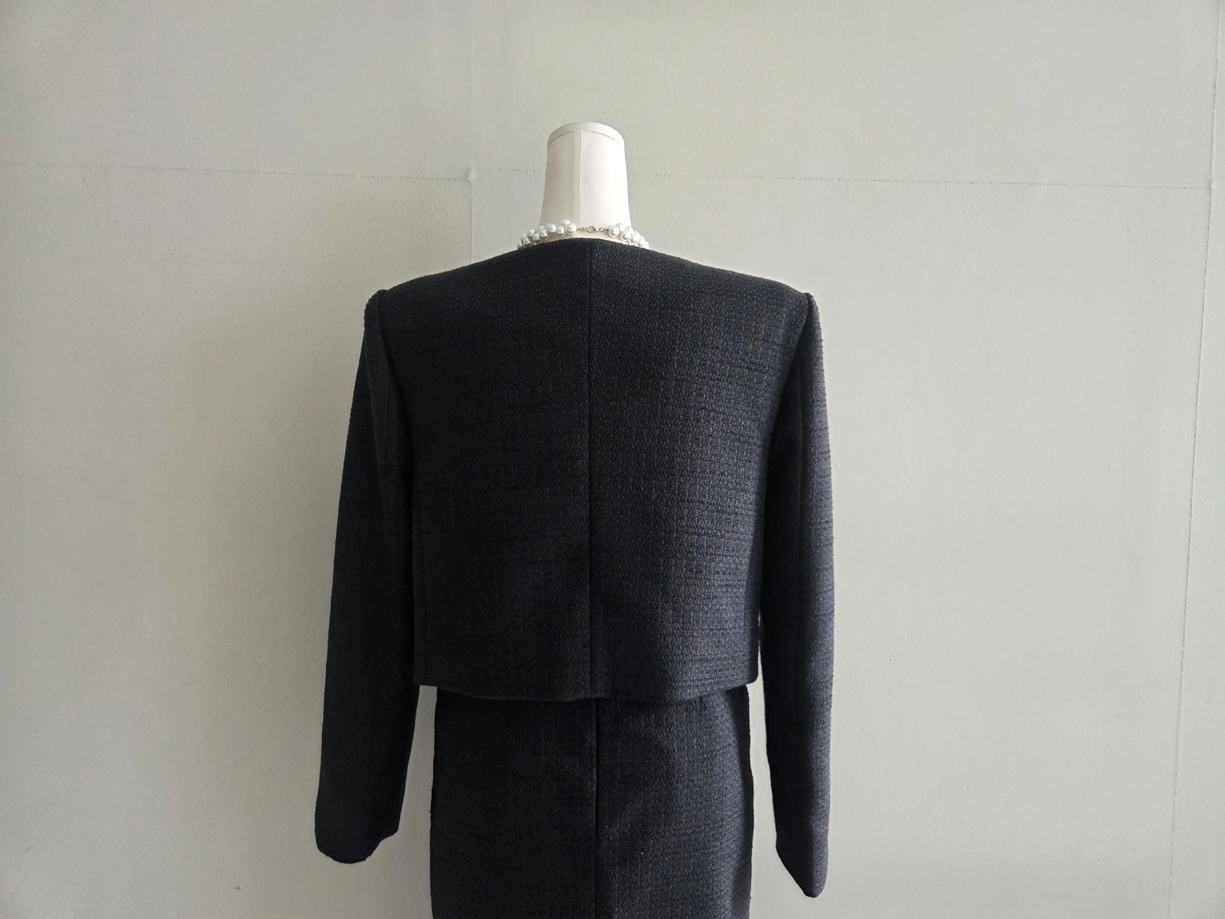 ツイードノーカラー肩パッドパフスリーブショートロング長袖フレアAラインダブルボタンヒドゥンジッパーツーピース(トップス、ボトムス)スカートダブルジャケット