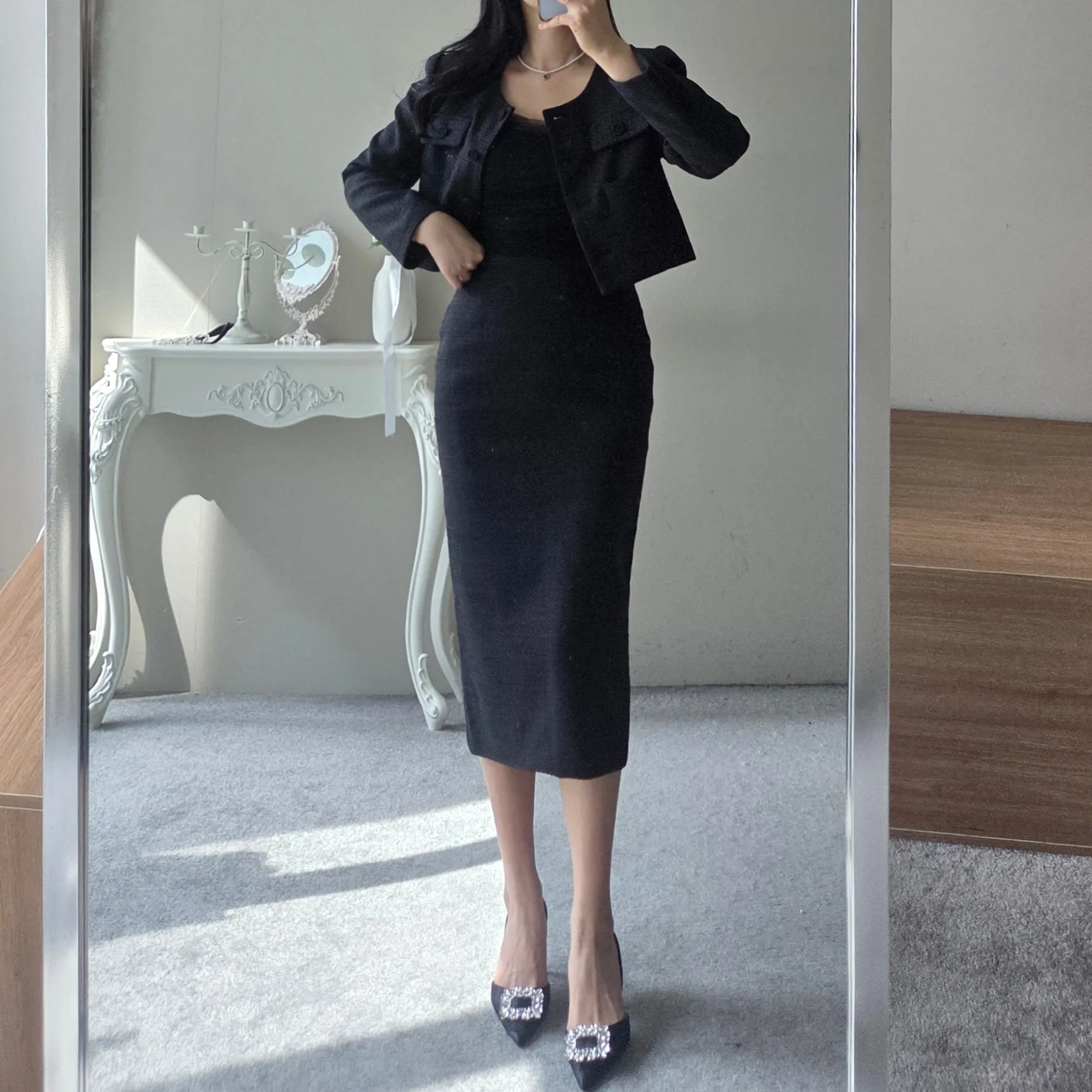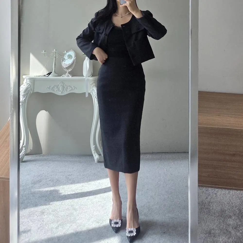 ラップスリット肩パッドペプラムスリムミディビジューボタンダブルボタンハーフヒドゥンジッパー無地ツーピース(トップス、ボトムス)スカートダブルジャケット