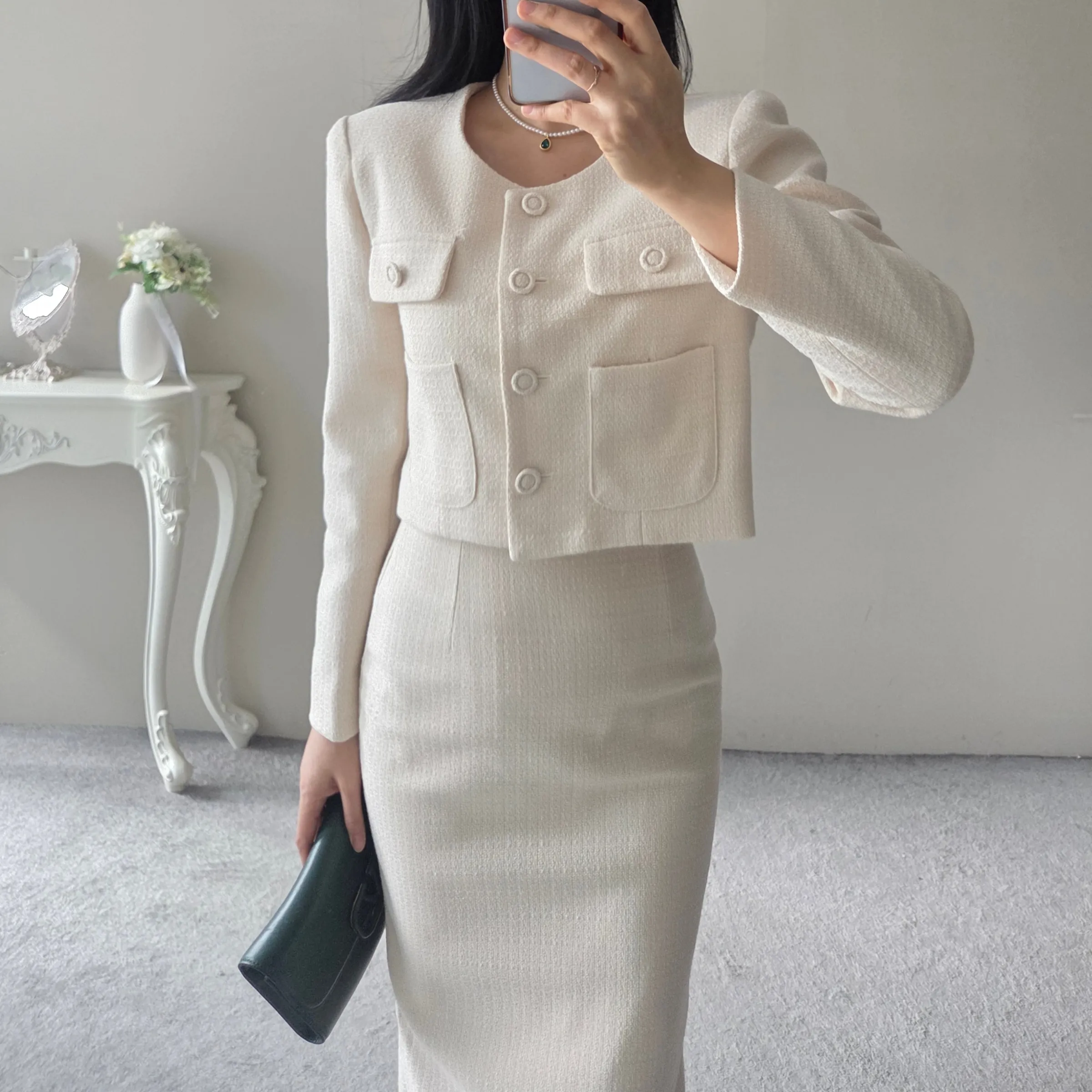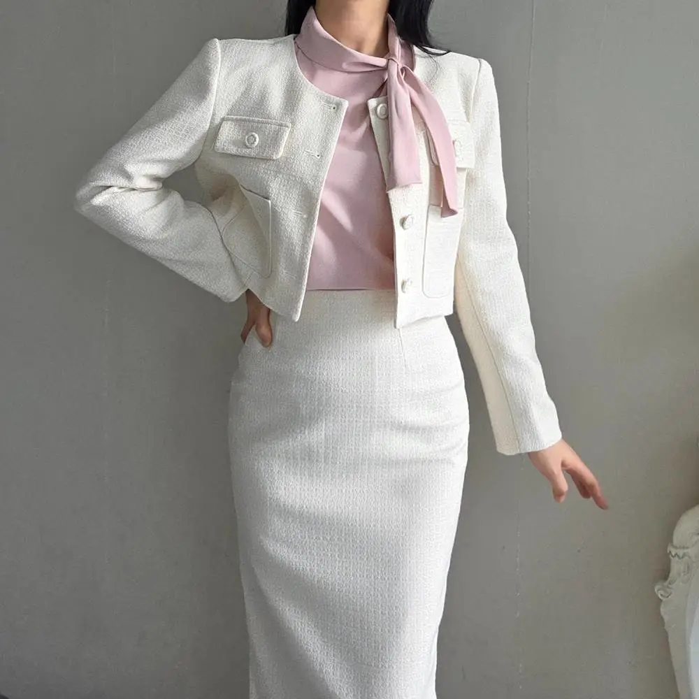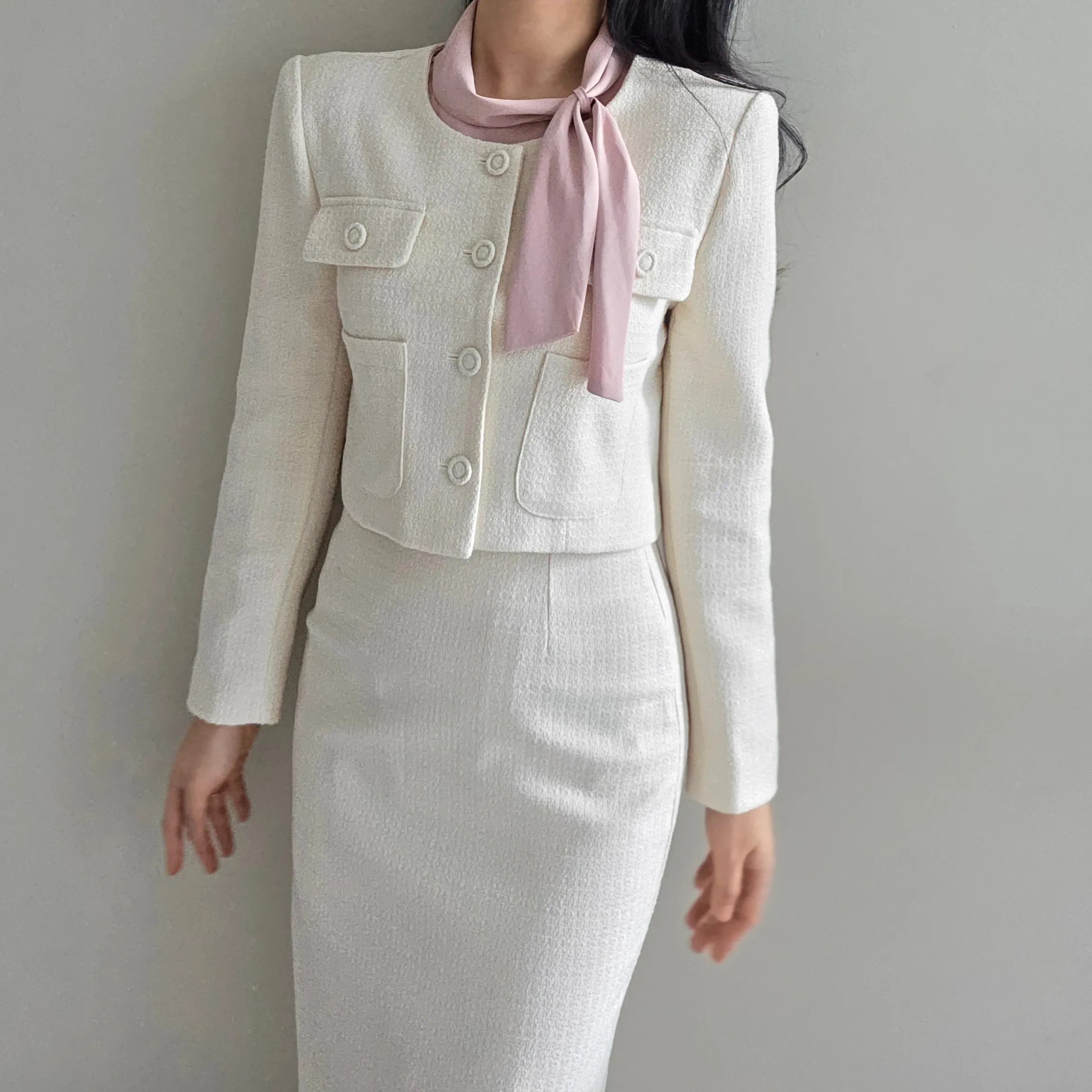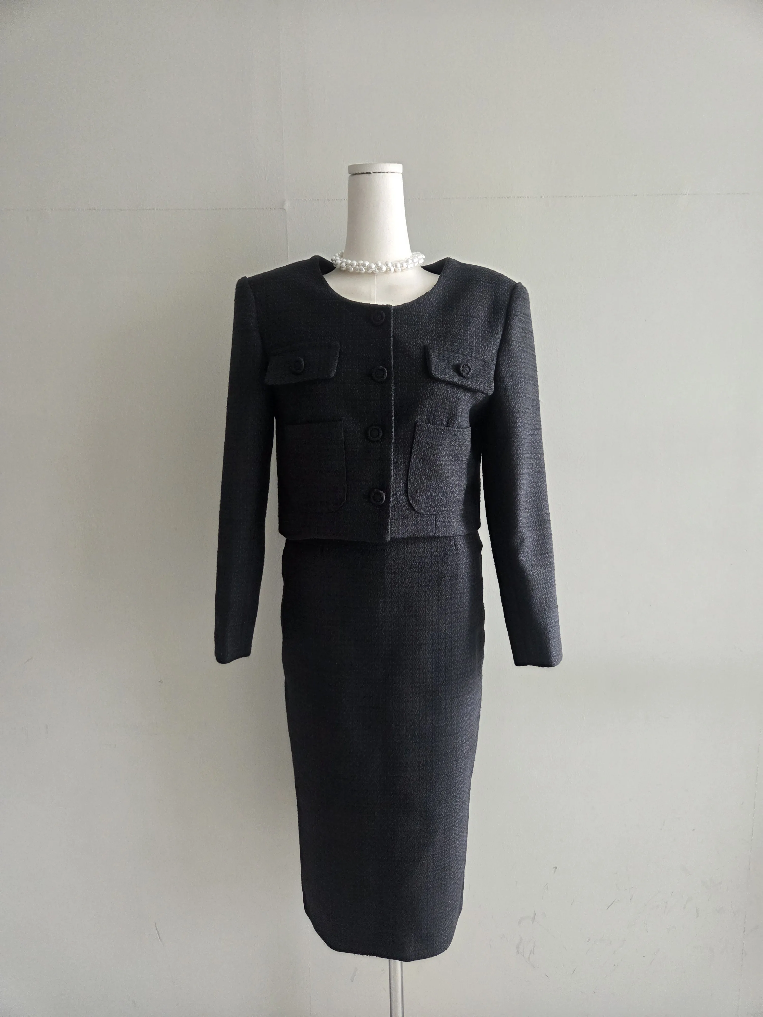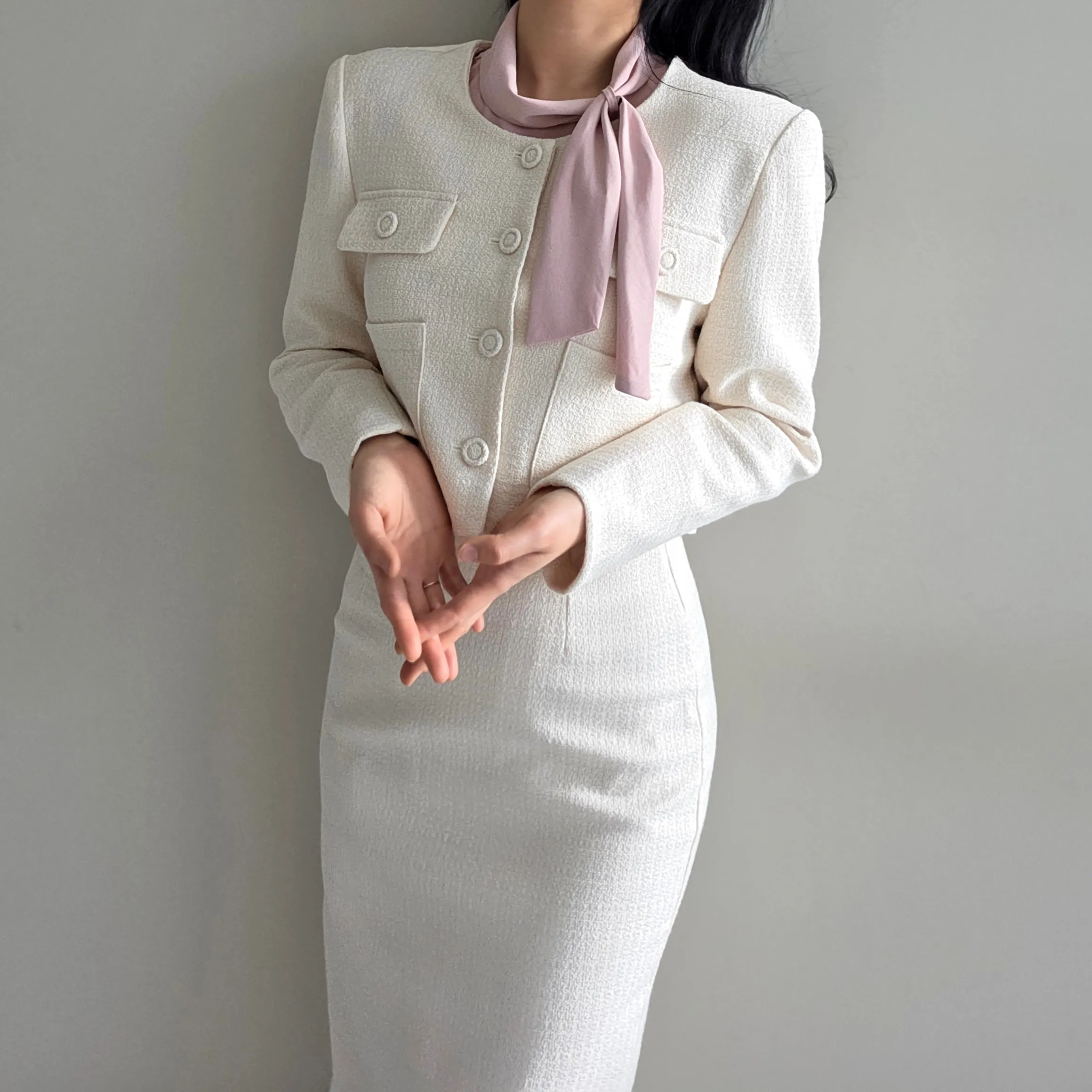 ラウンドネックノーカラースリットハイウエスト肩パッドペプラムスリムHライン長袖タックシークレットボタンダブルボタン無地ツーピース(トップス、ボトムス)スカートダブルジャケット