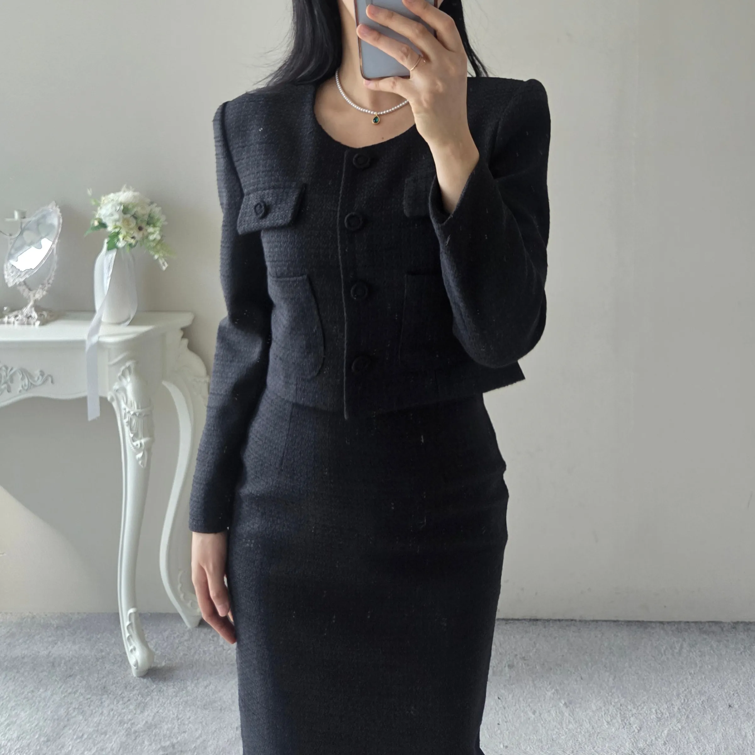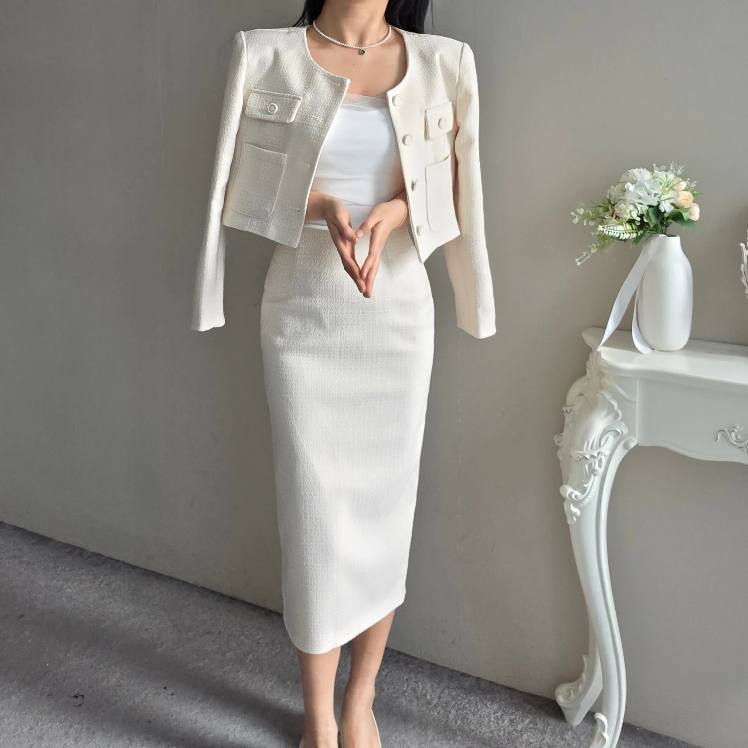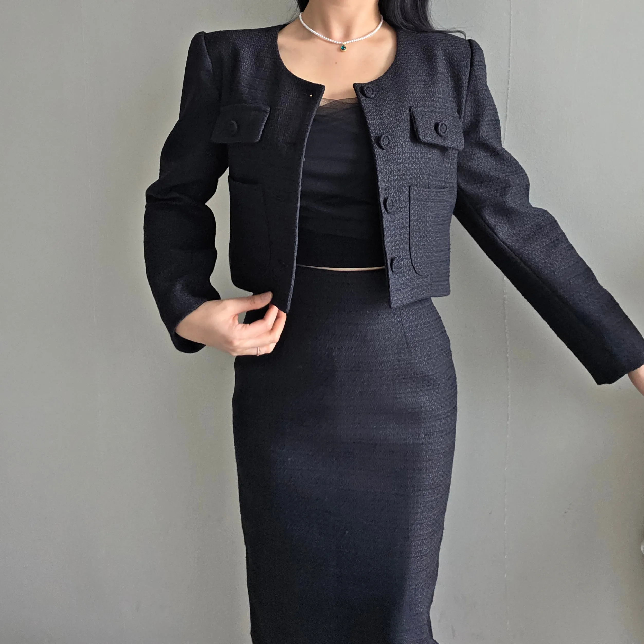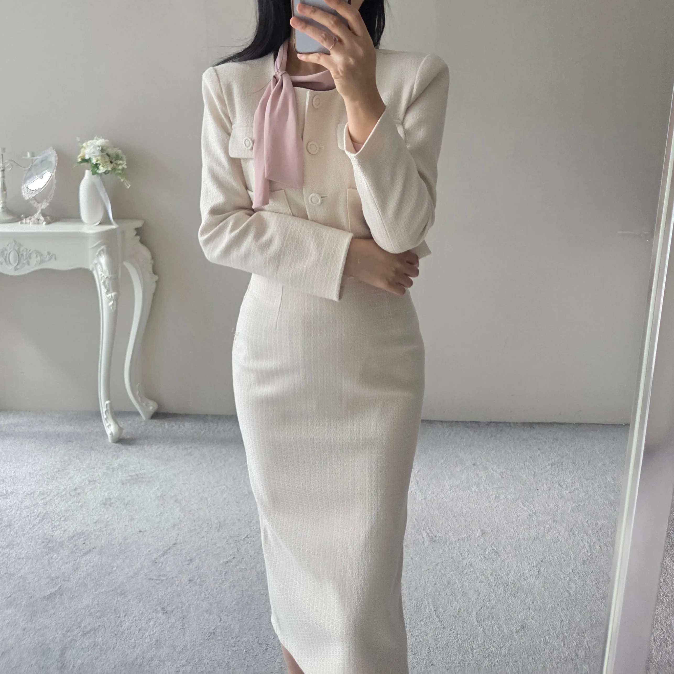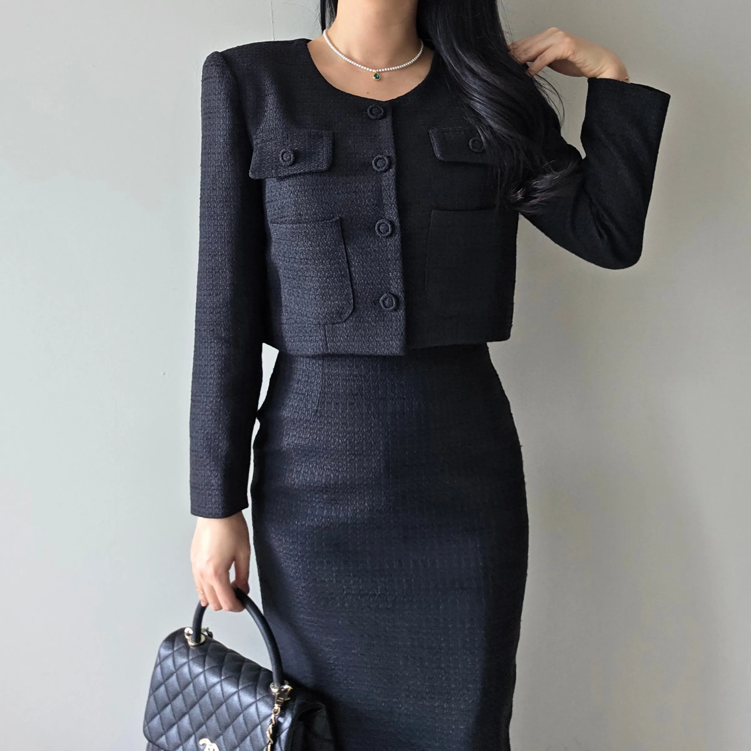 ラウンドネックノーカラースリットハイウエスト肩パッドペプラムスリムHライン長袖タックシークレットボタンダブルボタン無地ツーピース(トップス、ボトムス)スカートダブルジャケット