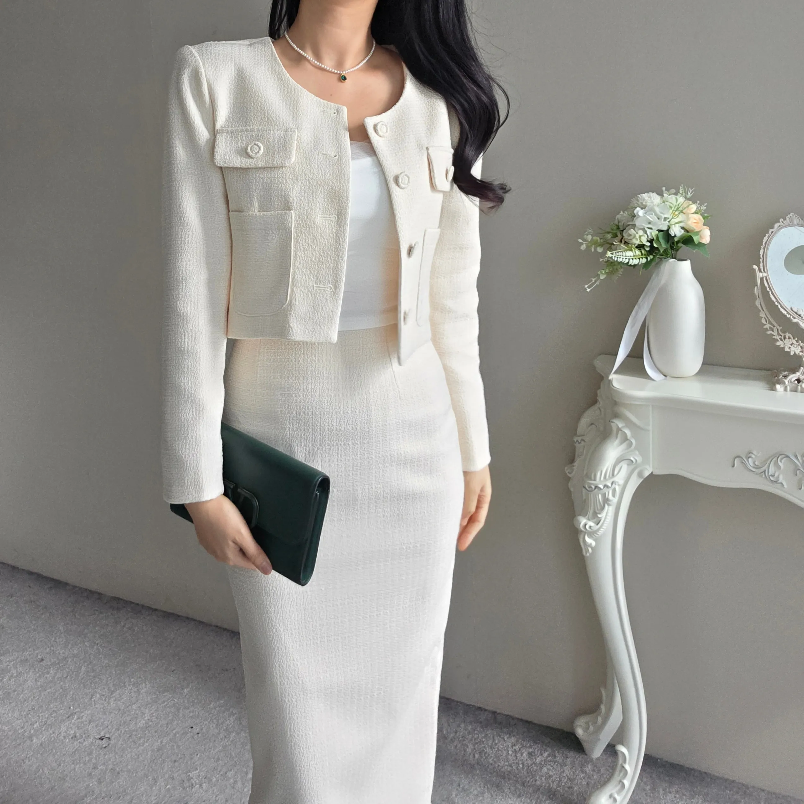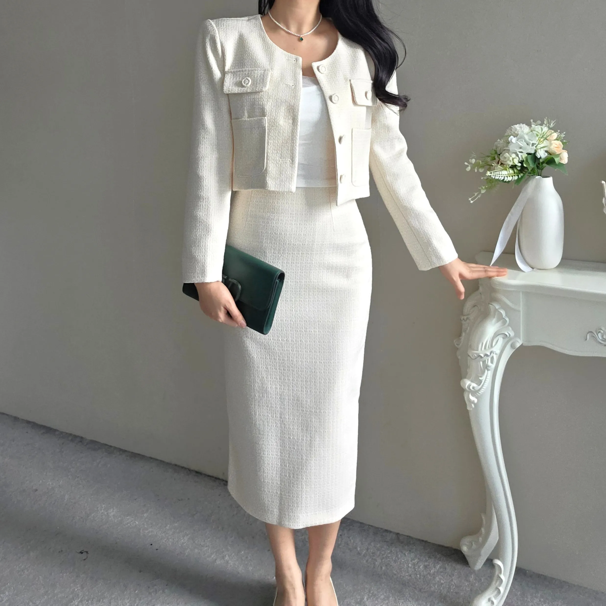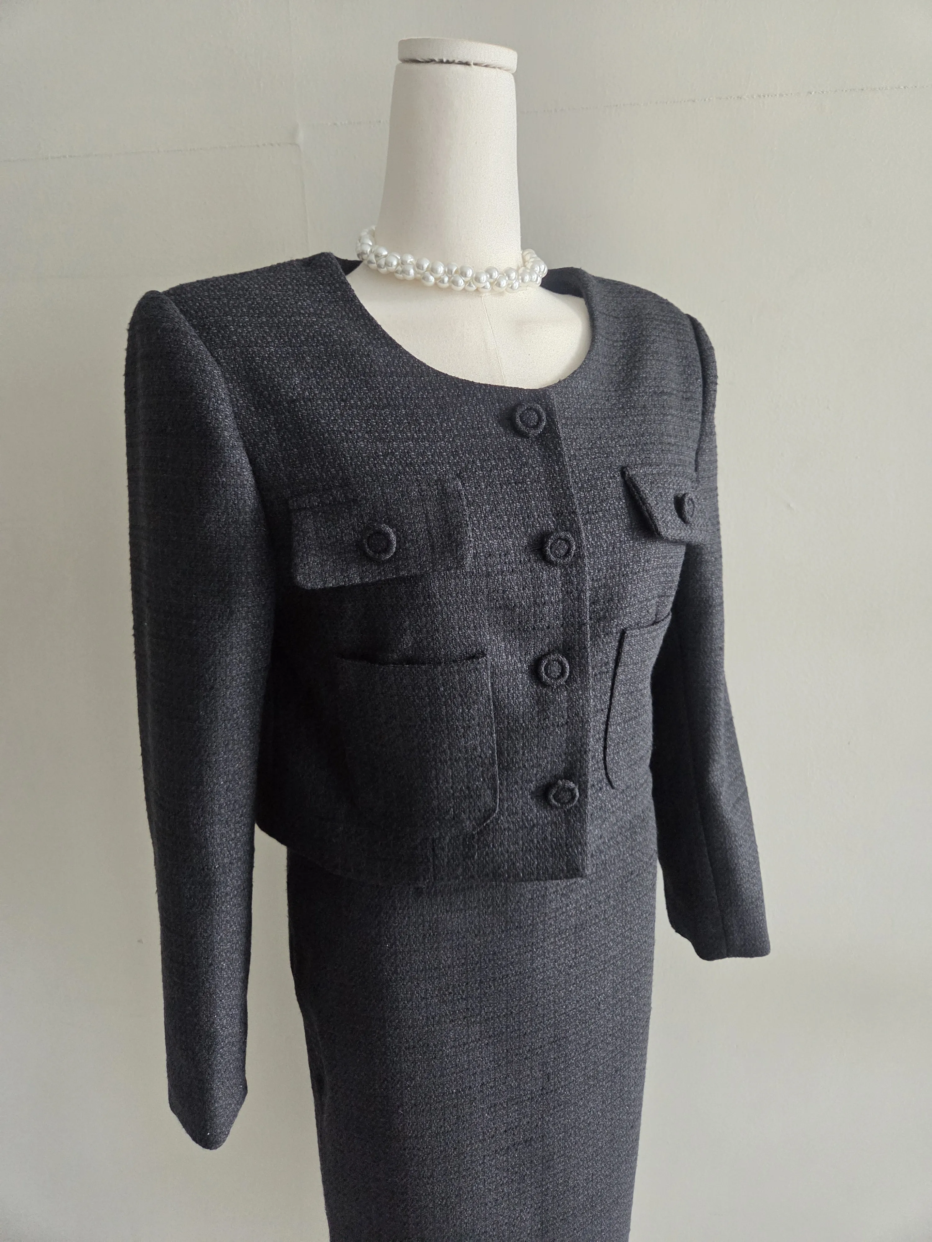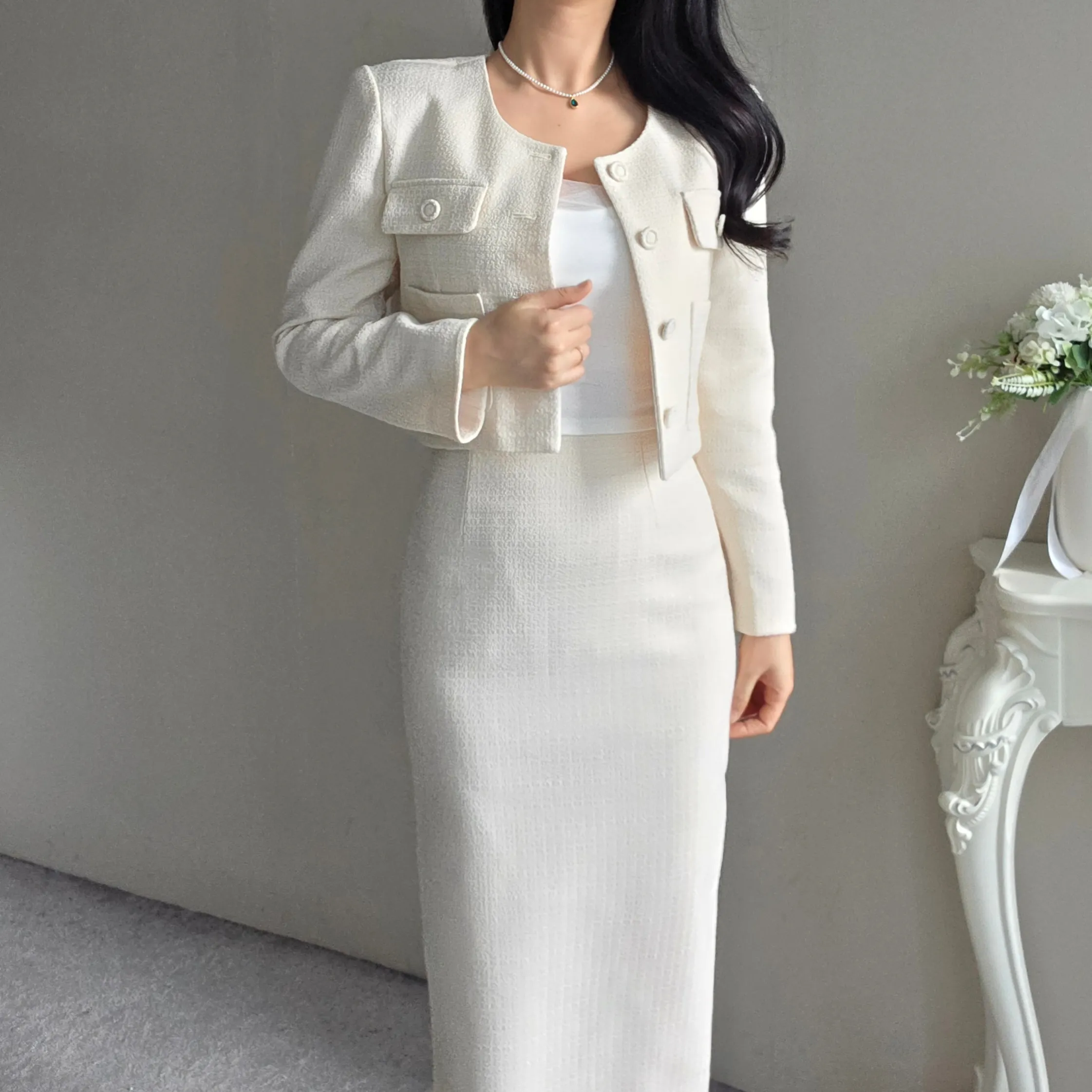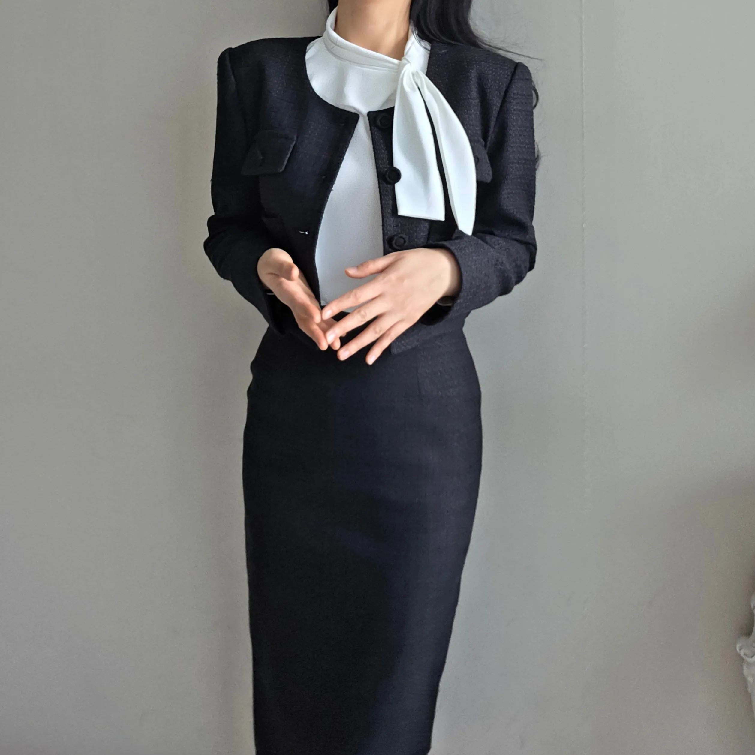 ラウンドネックノーカラースリットハイウエスト肩パッドペプラムスリムHライン長袖タックシークレットボタンダブルボタン無地ツーピース(トップス、ボトムス)スカートダブルジャケット