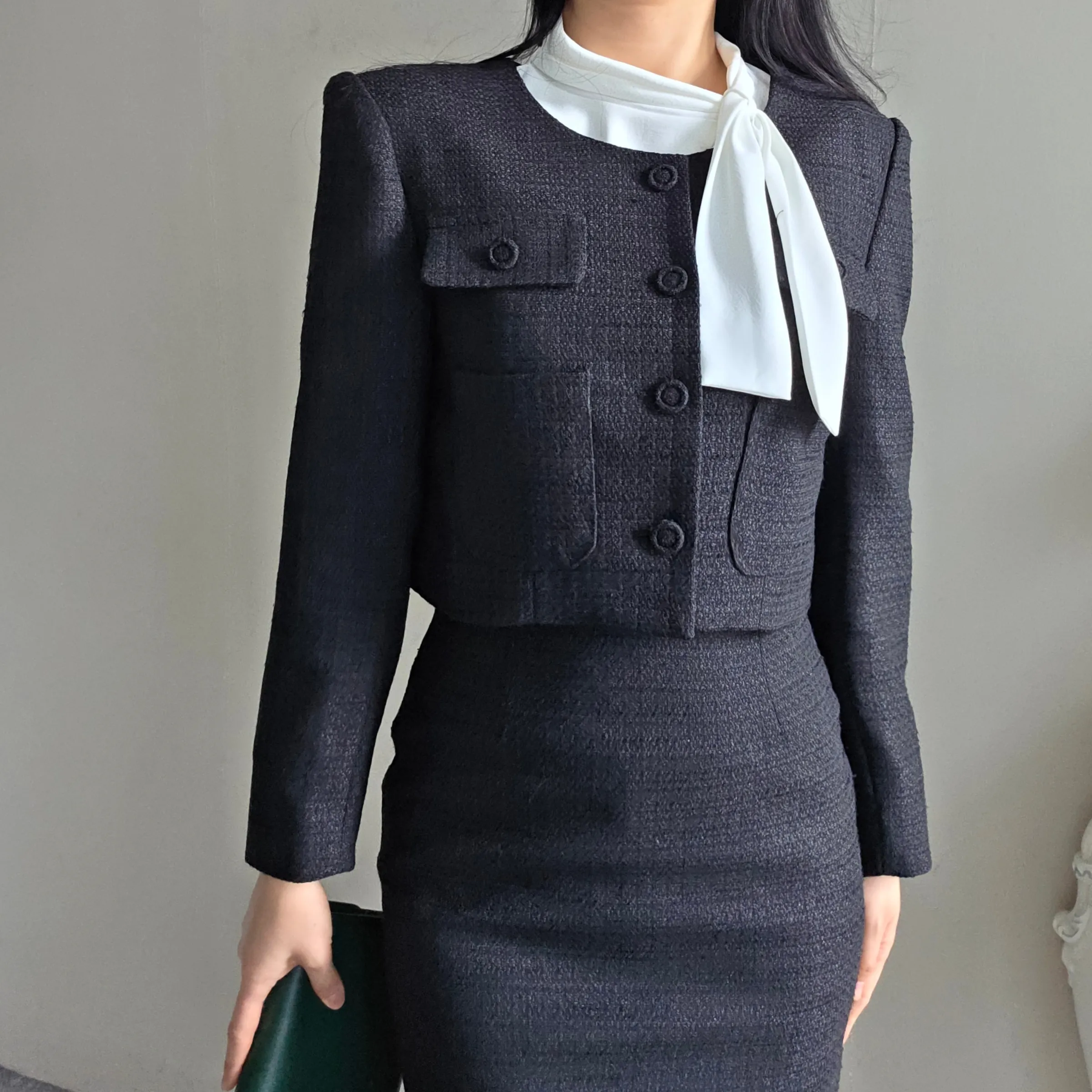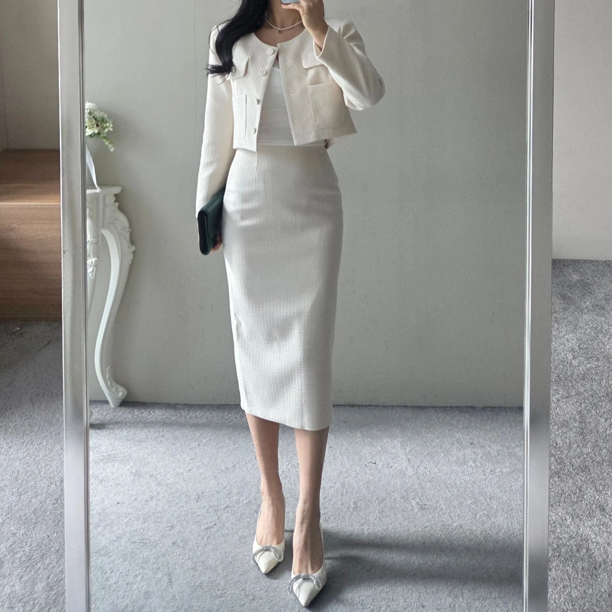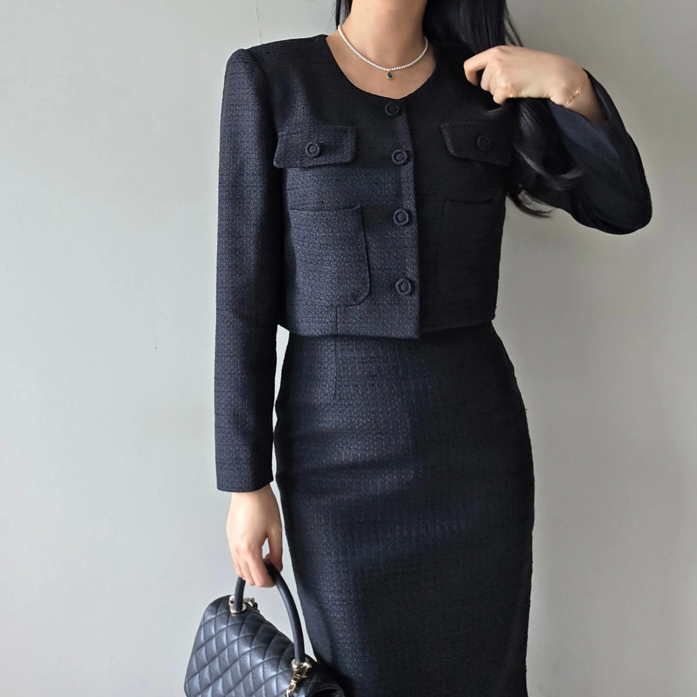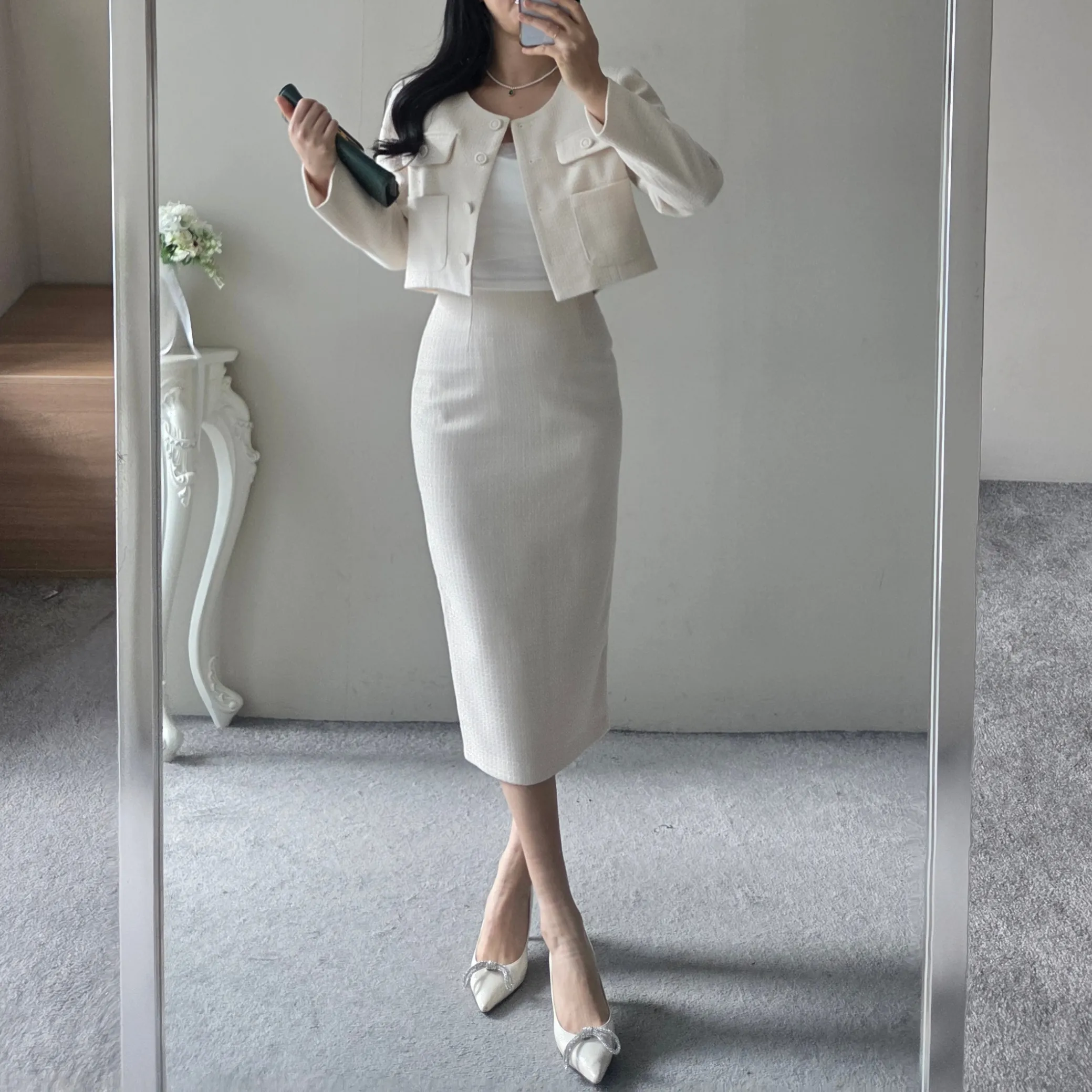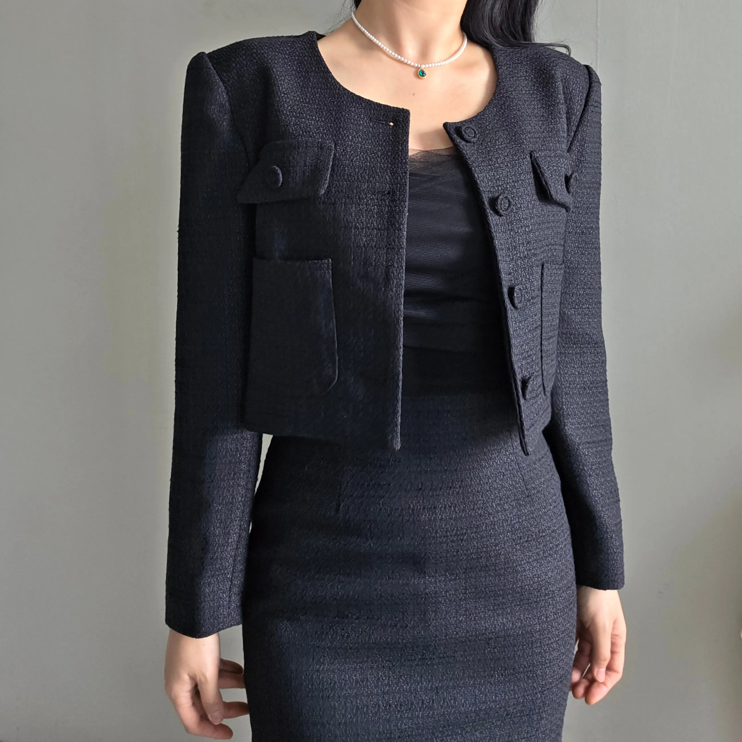 ラウンドネックノーカラースリットハイウエスト肩パッドペプラムスリムHライン長袖タックシークレットボタンダブルボタン無地ツーピース(トップス、ボトムス)スカートダブルジャケット