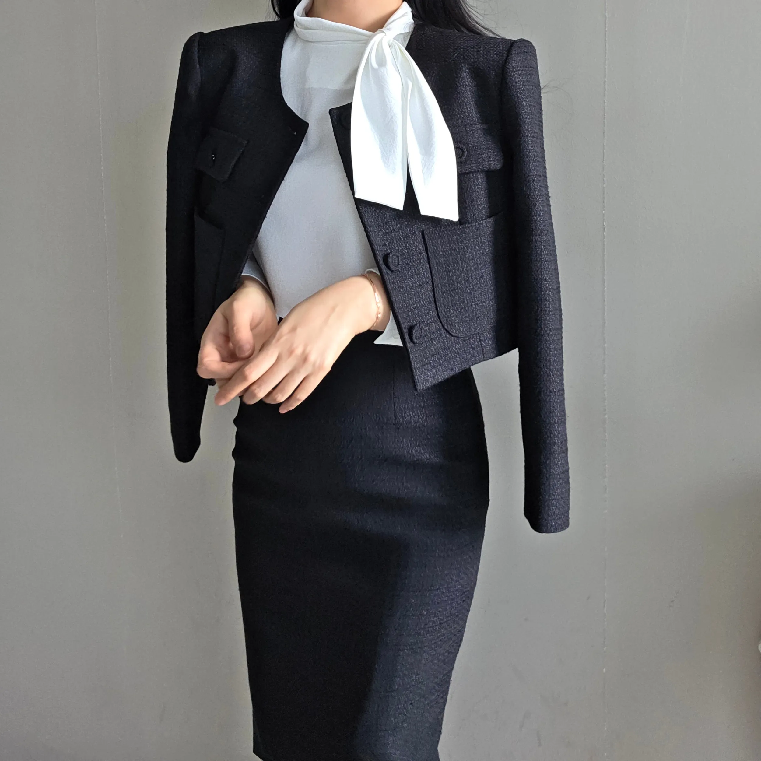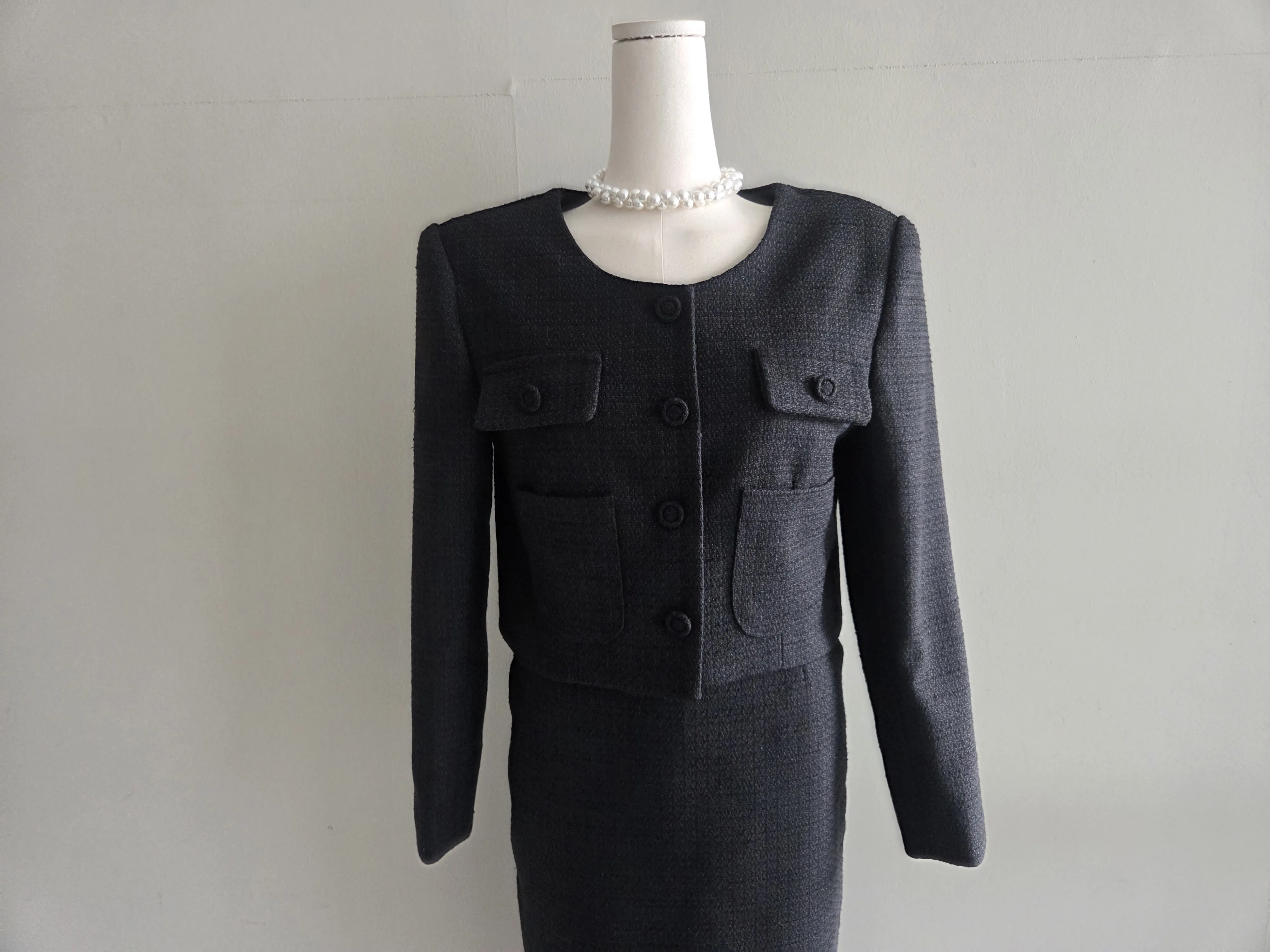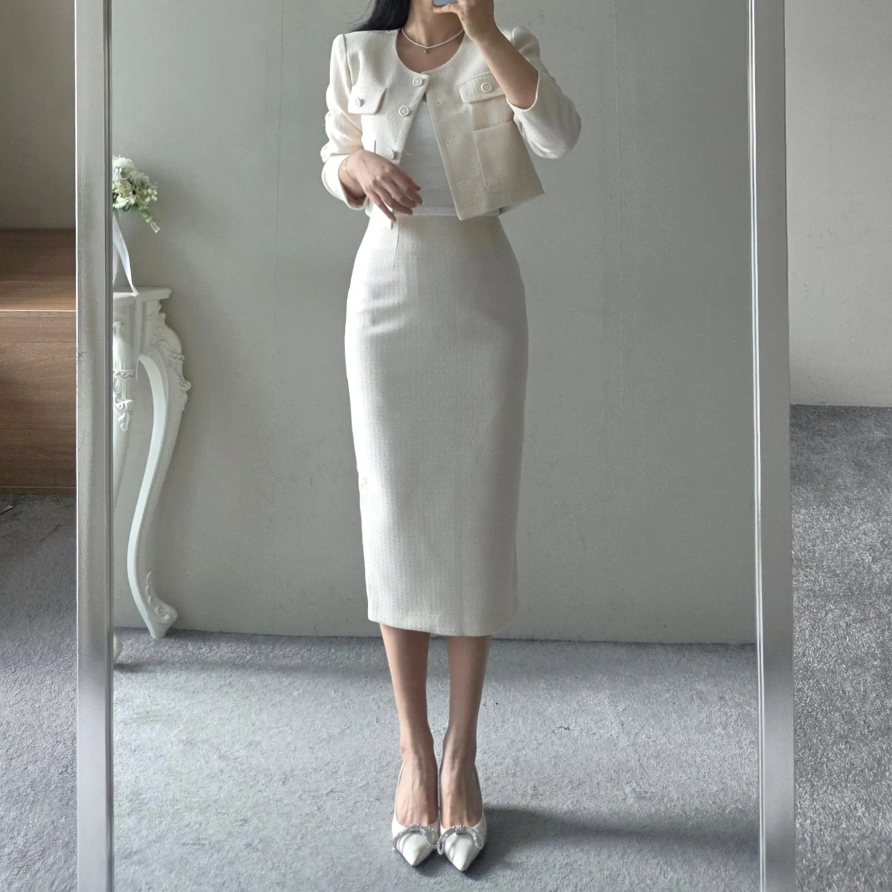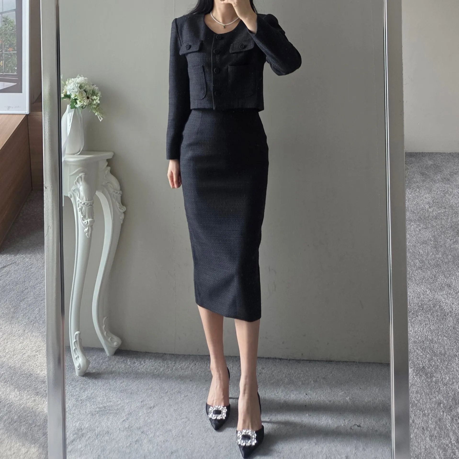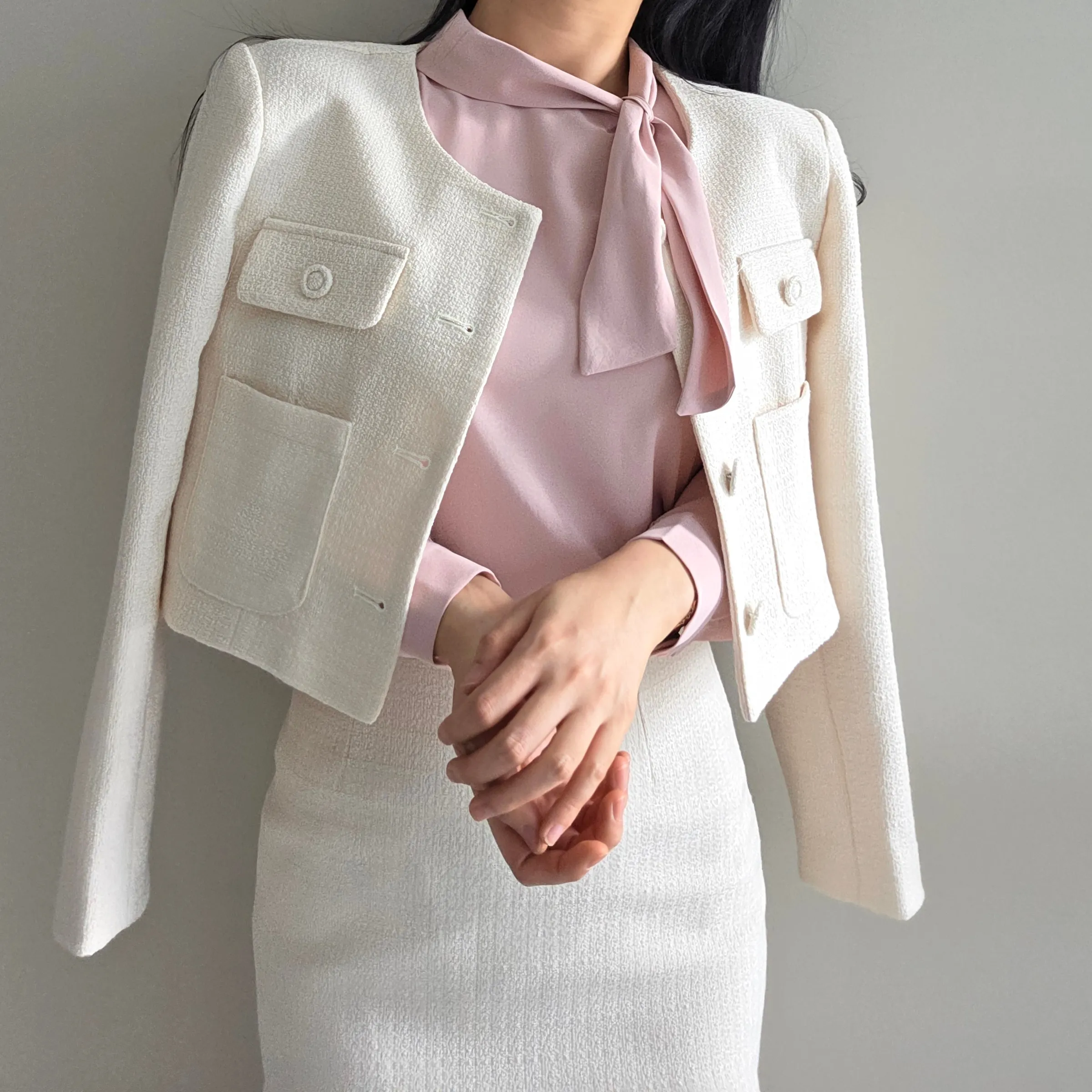 ラウンドネックノーカラースリットハイウエスト肩パッドペプラムスリムHライン長袖タックシークレットボタンダブルボタン無地ツーピース(トップス、ボトムス)スカートダブルジャケット