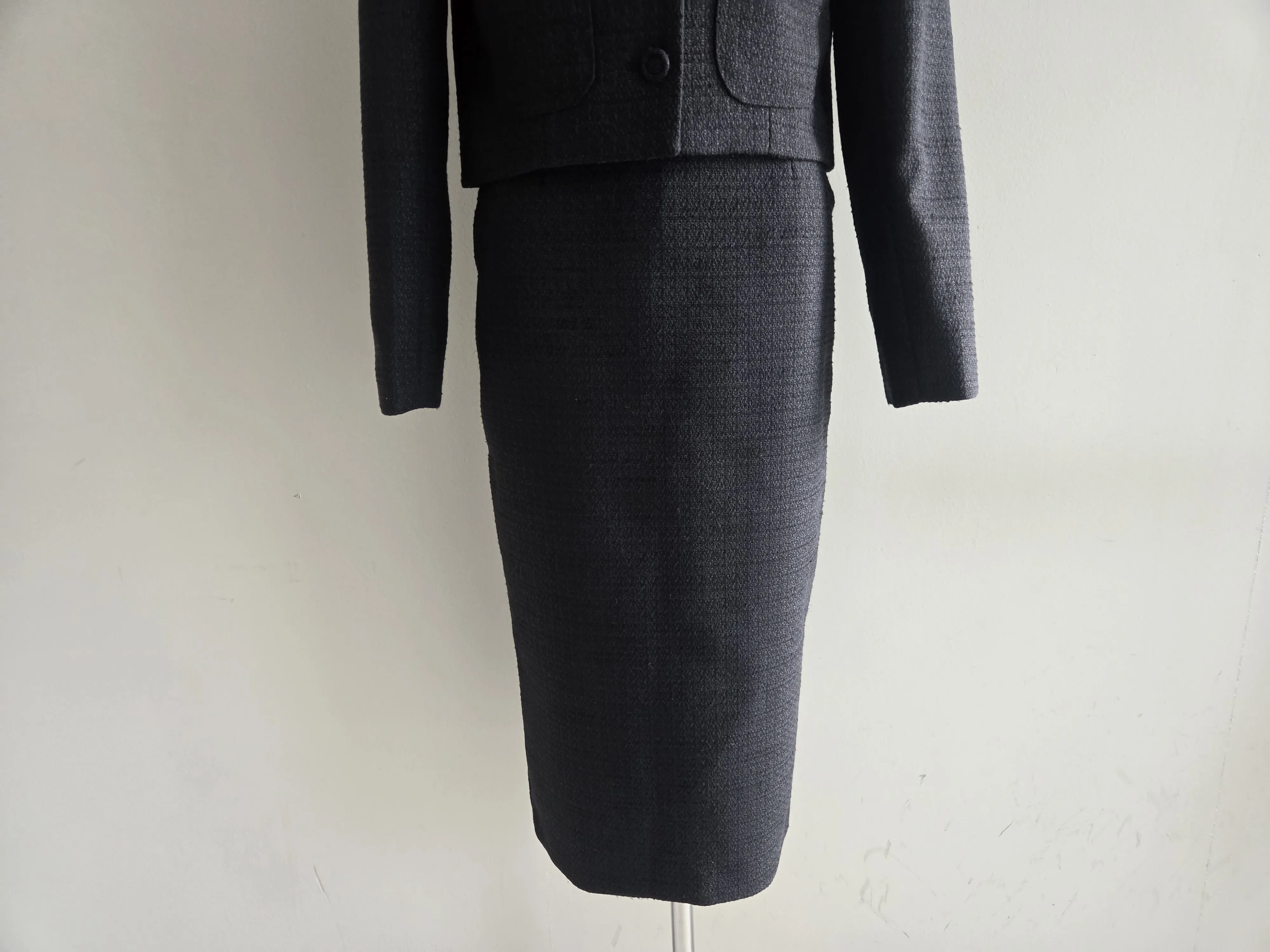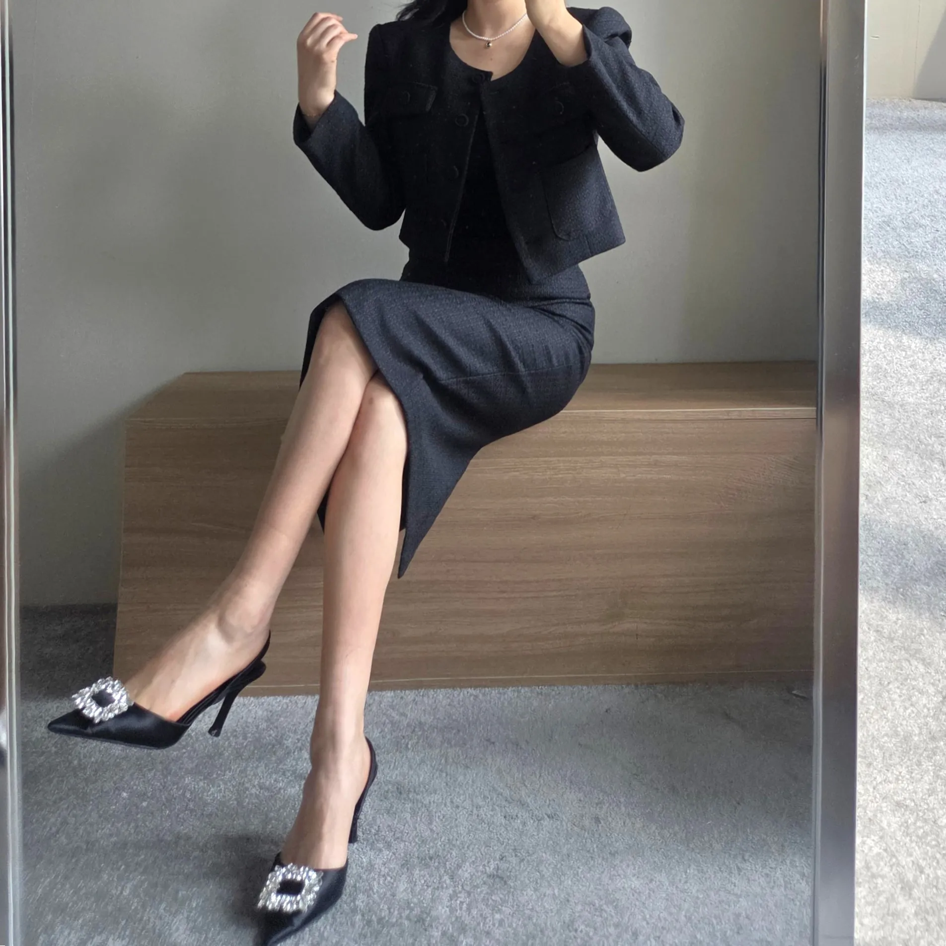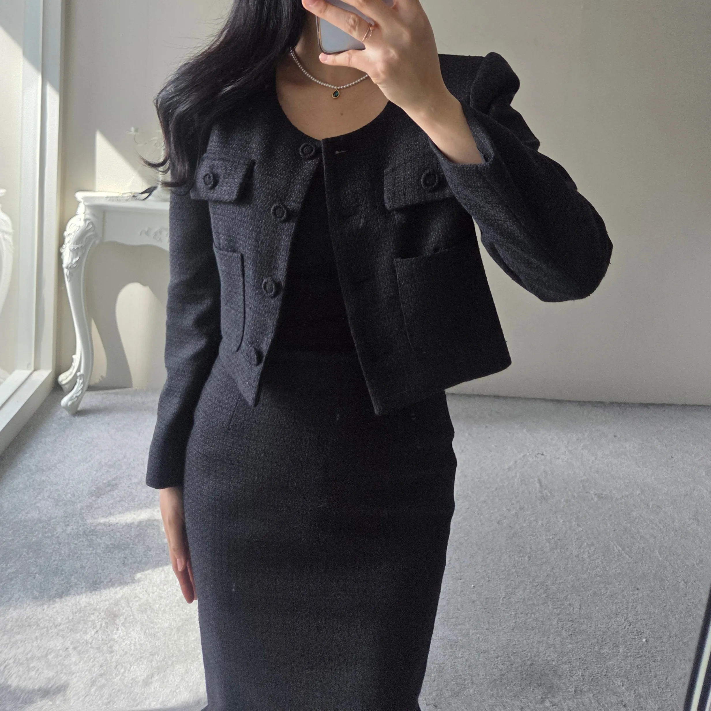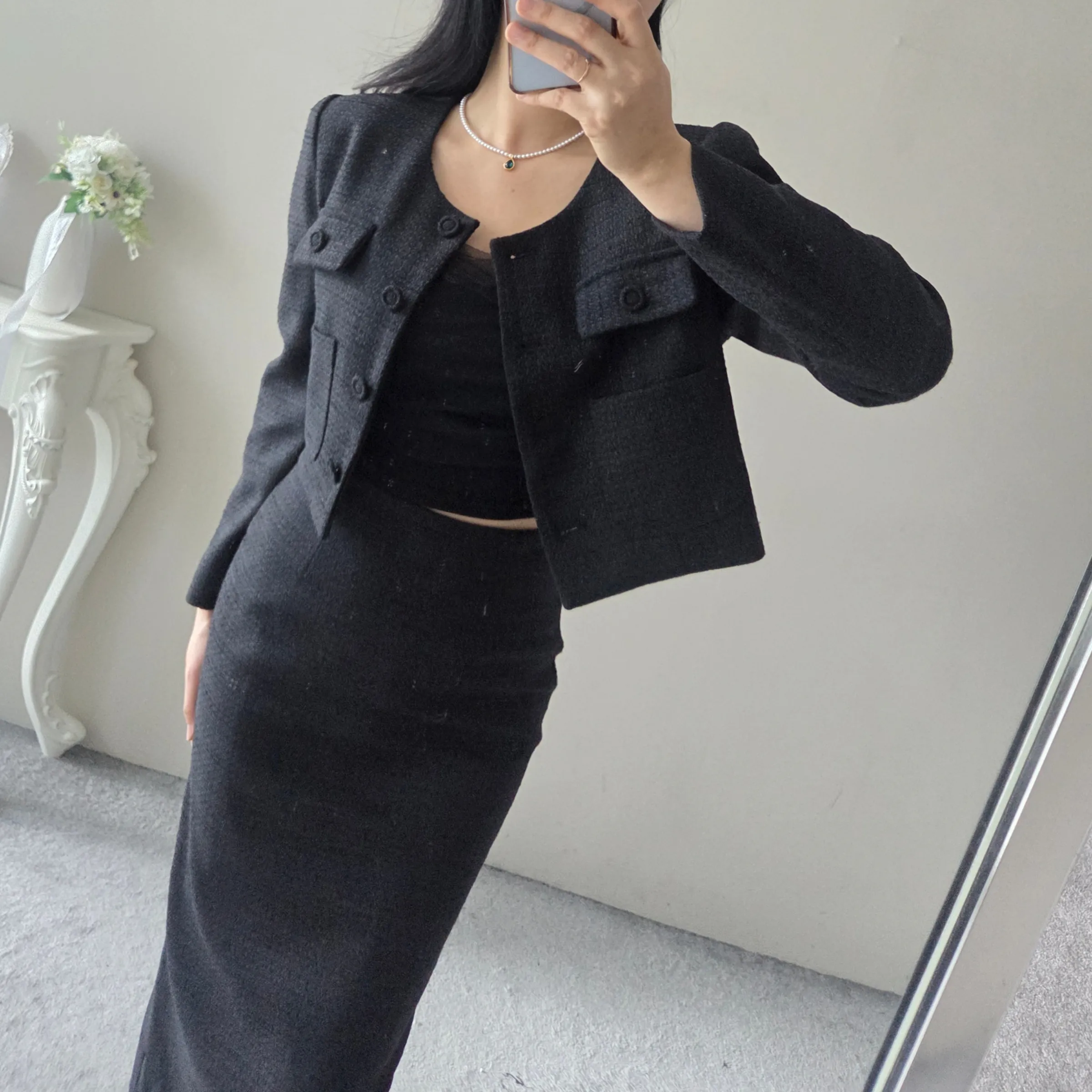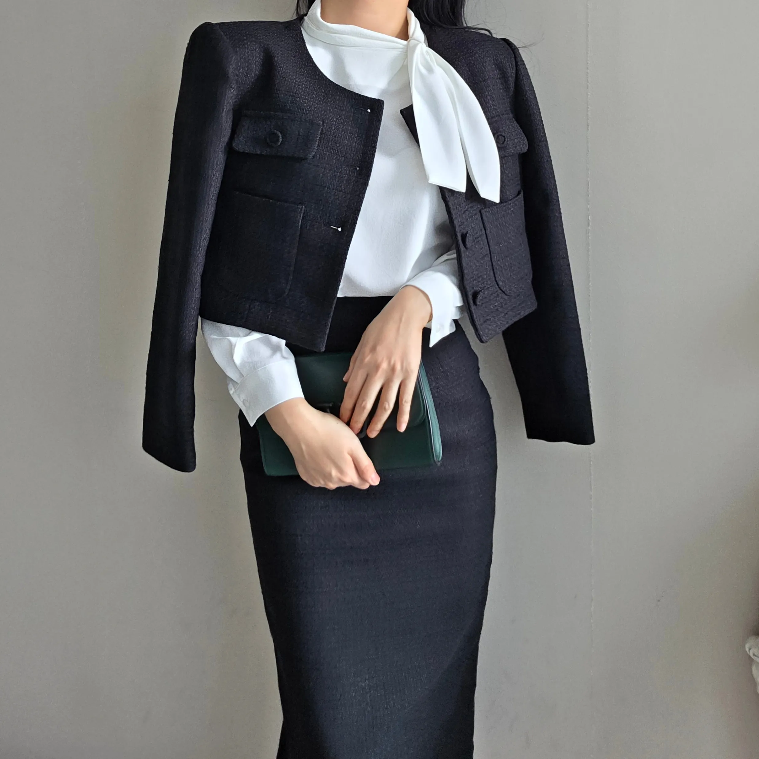ラウンドネックノーカラースリットハイウエスト肩パッドペプラムスリムHライン長袖タックシークレットボタンダブルボタン無地ツーピース(トップス、ボトムス)スカートダブルジャケット