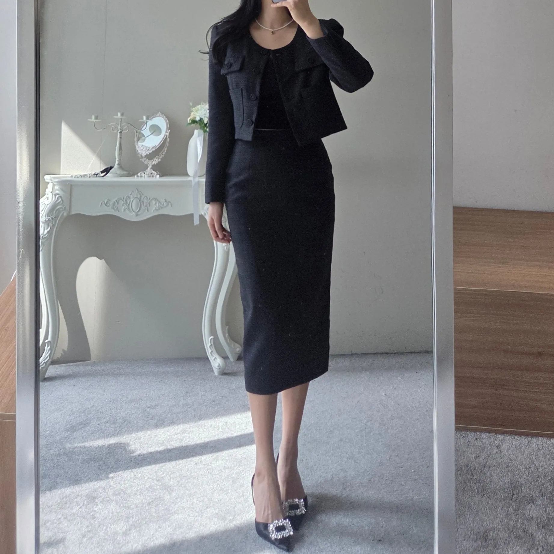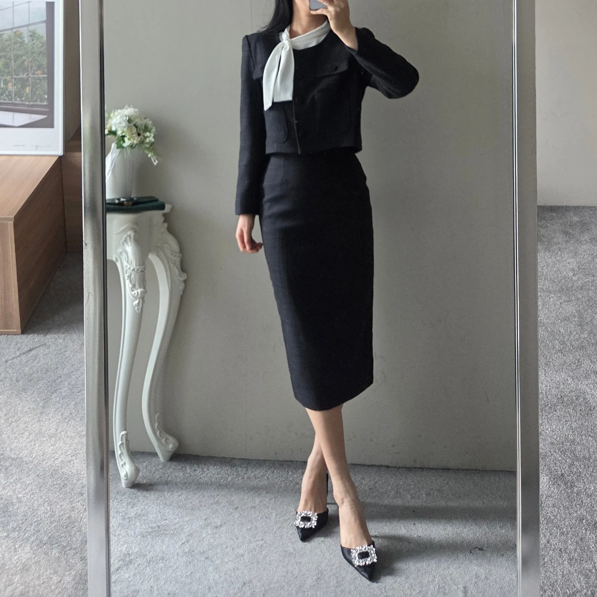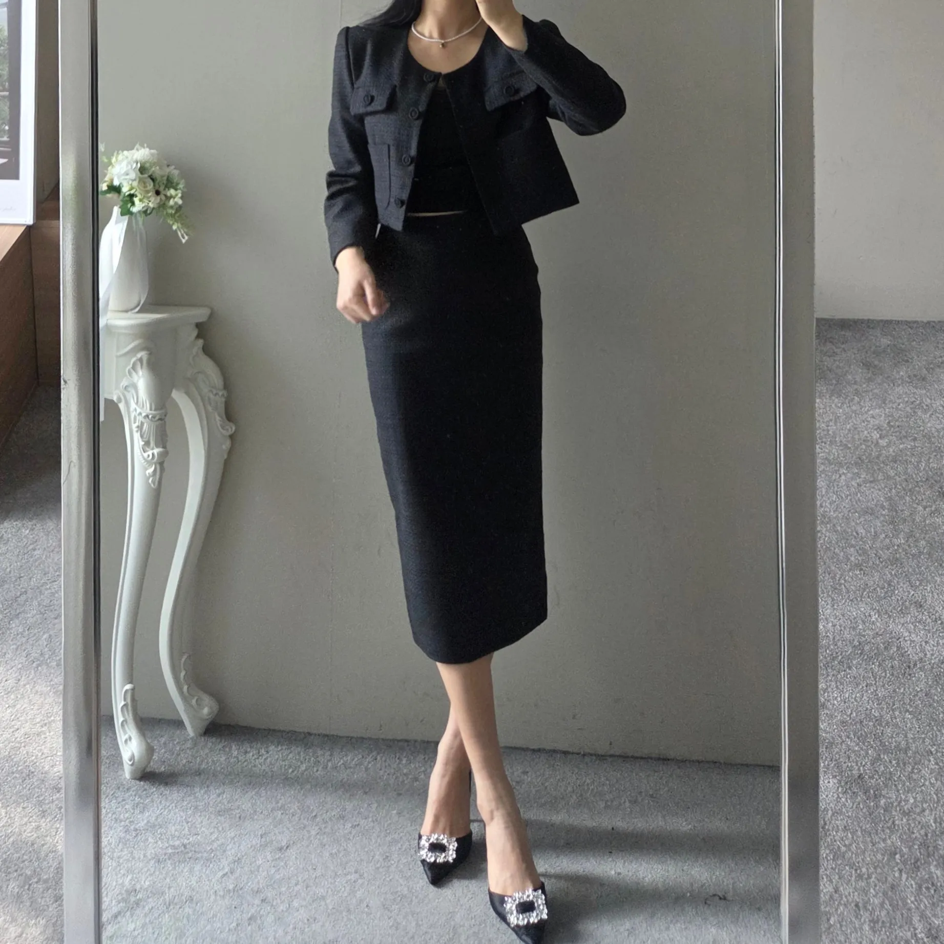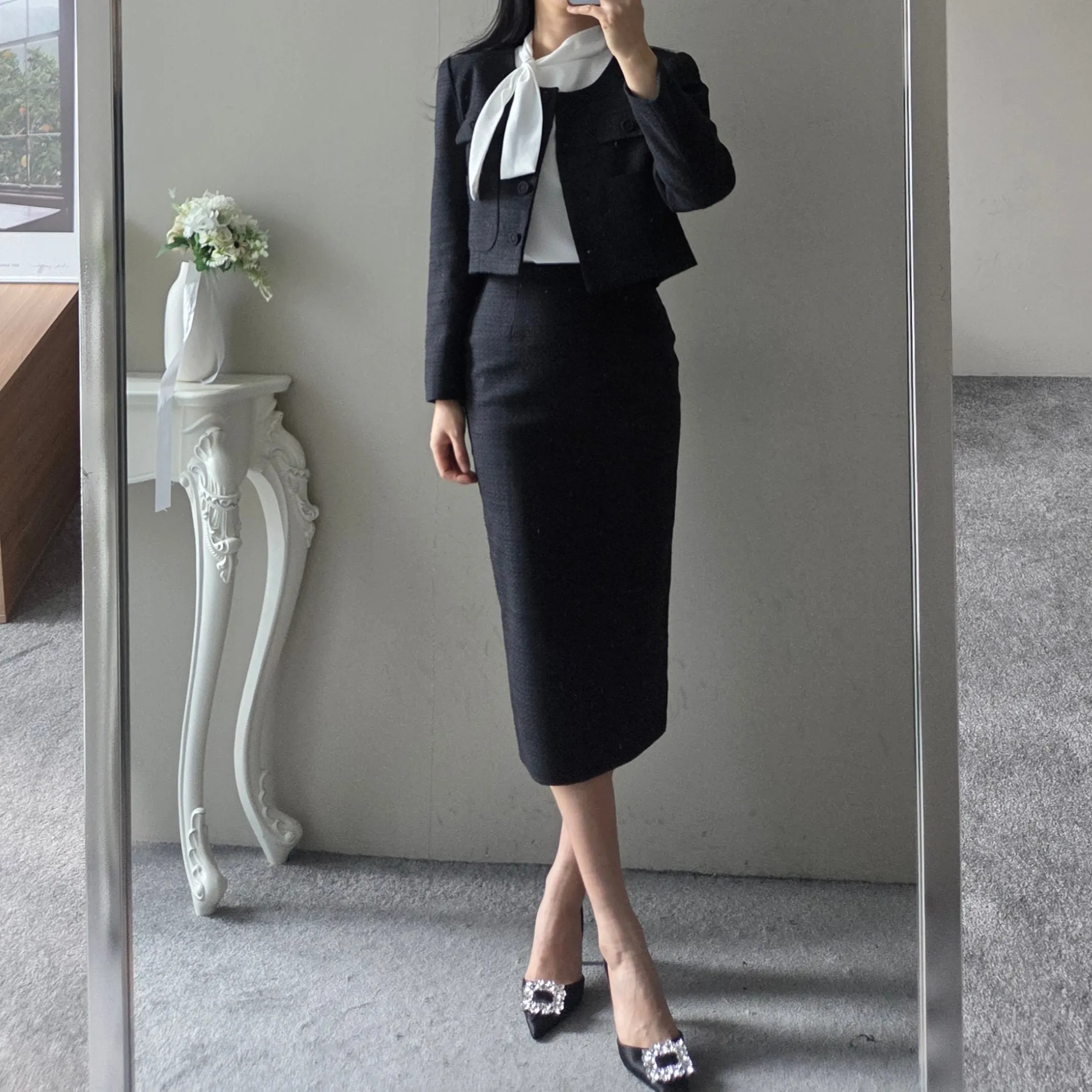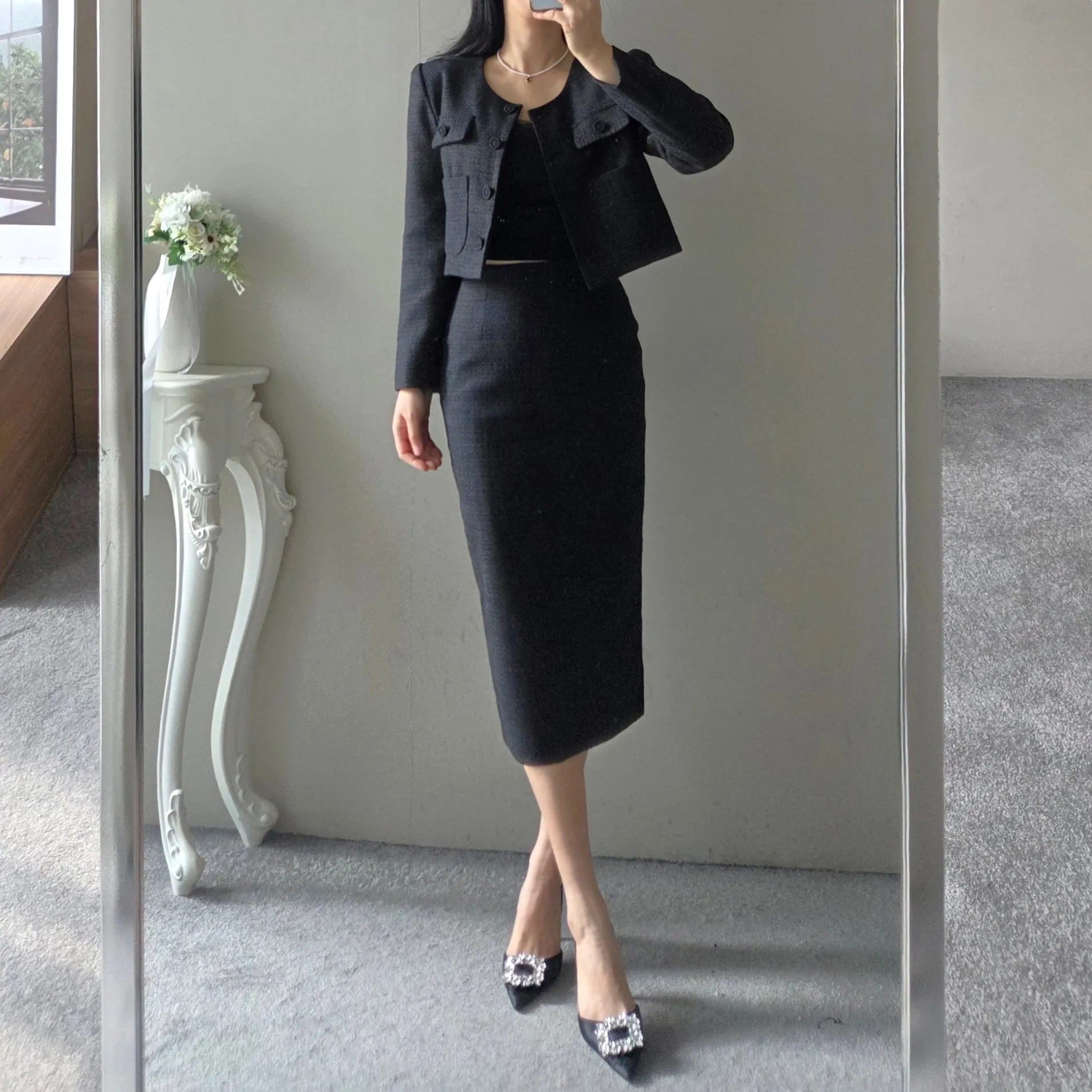 ラウンドネックノーカラースリットハイウエスト肩パッドペプラムスリムHライン長袖タックシークレットボタンダブルボタン無地ツーピース(トップス、ボトムス)スカートダブルジャケット