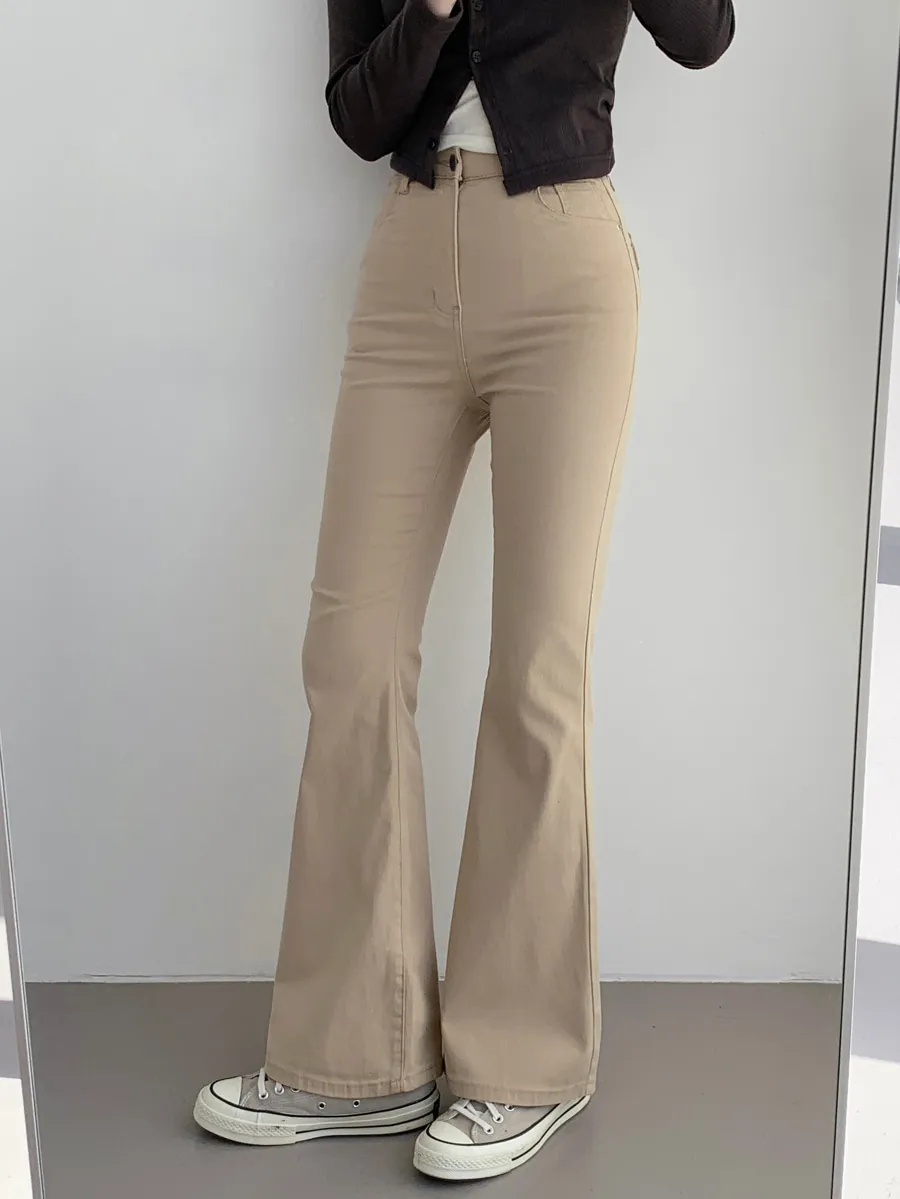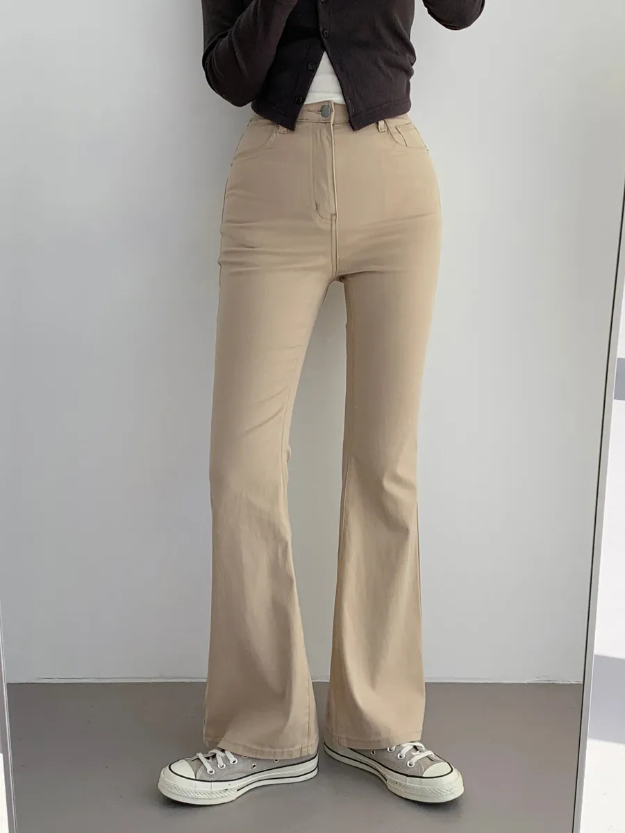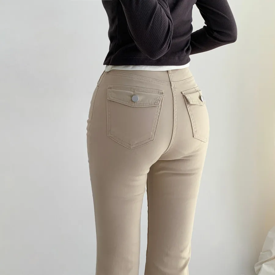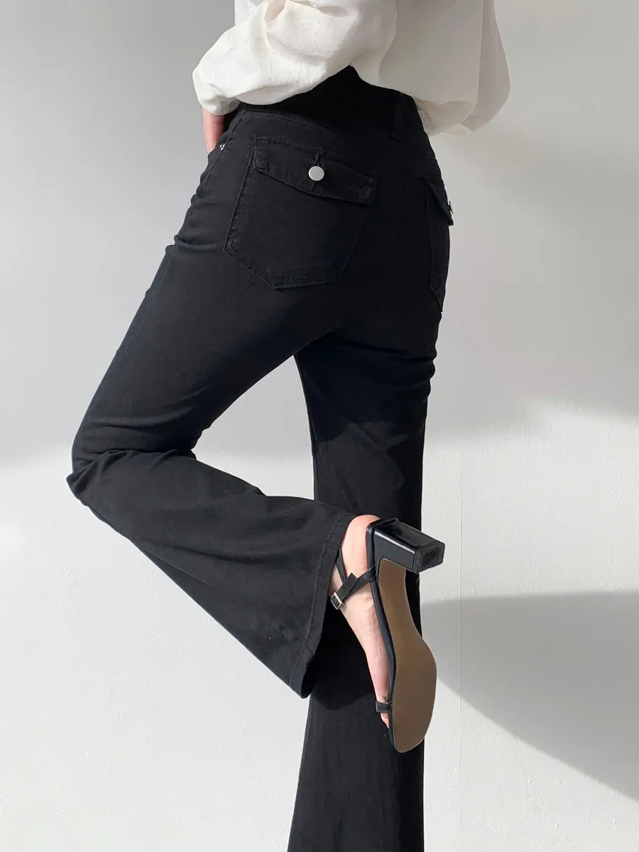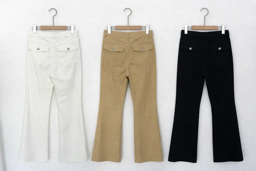 ジップアップバックルドローストリングポケットローライズウエストゴムフラップポケットリベットスナップボタンバックポケットブーツカット無地パンツ[選べる丈]