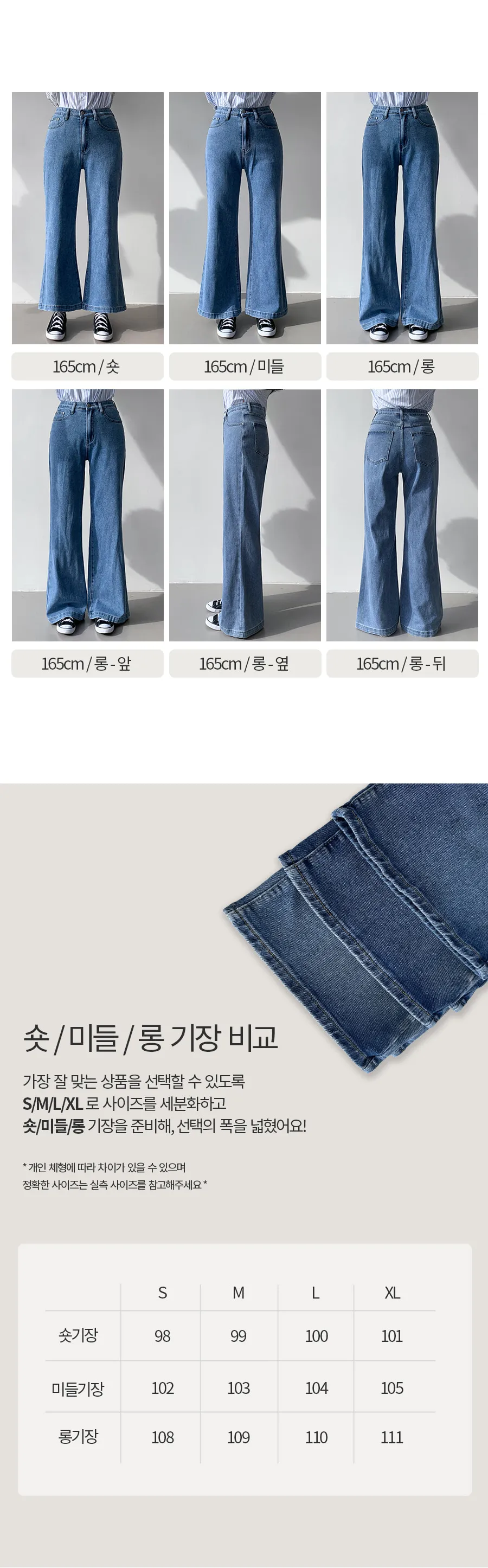 | Size | ウエスト | ヒップ | 裾幅 | わたり | 股上 | 着丈 |