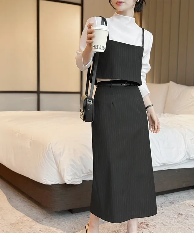 ラップスリット肩パッドペプラムスリムミディビジューボタンダブルボタンハーフヒドゥンジッパー無地ツーピース(トップス、ボトムス)スカートダブルジャケット