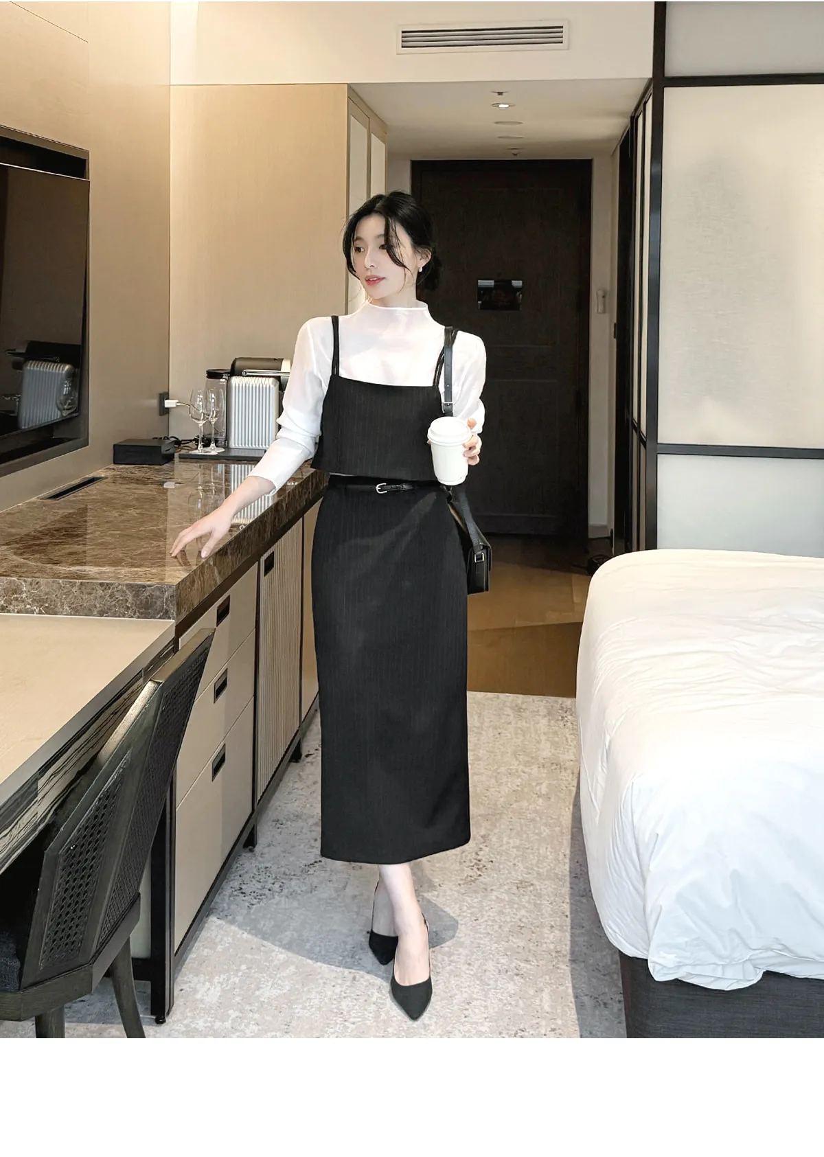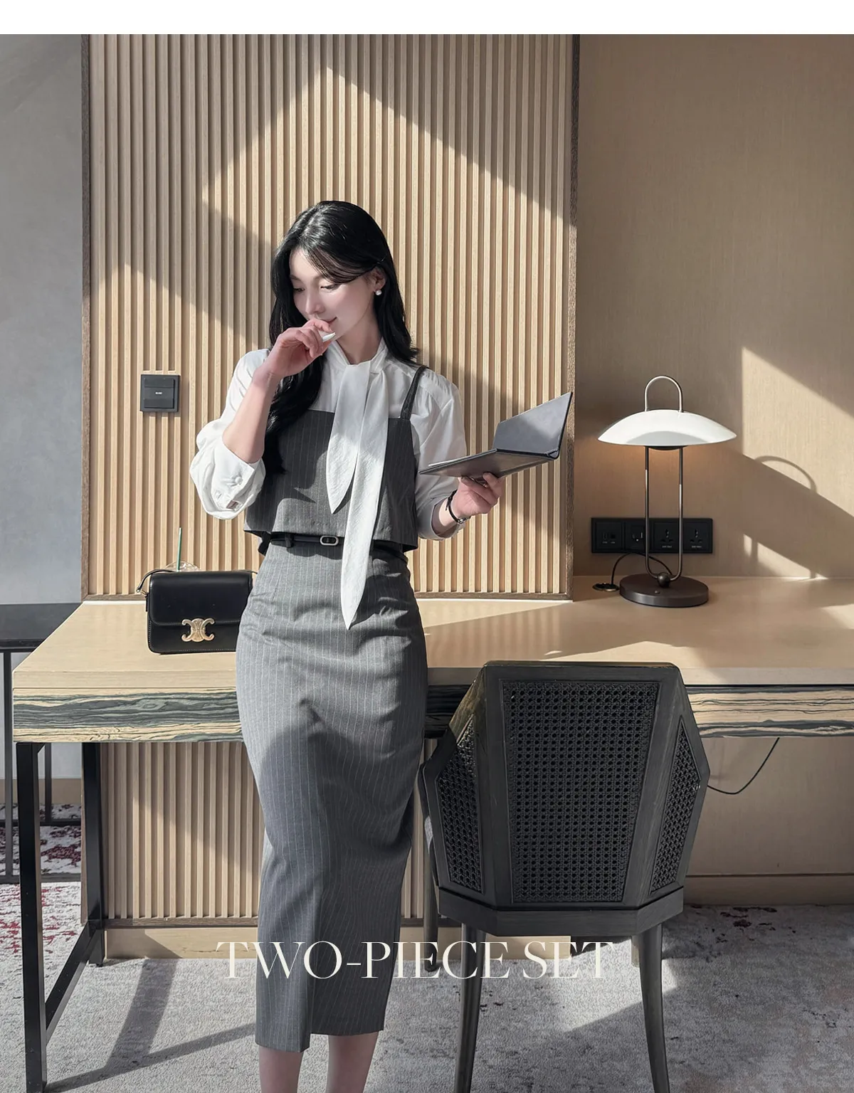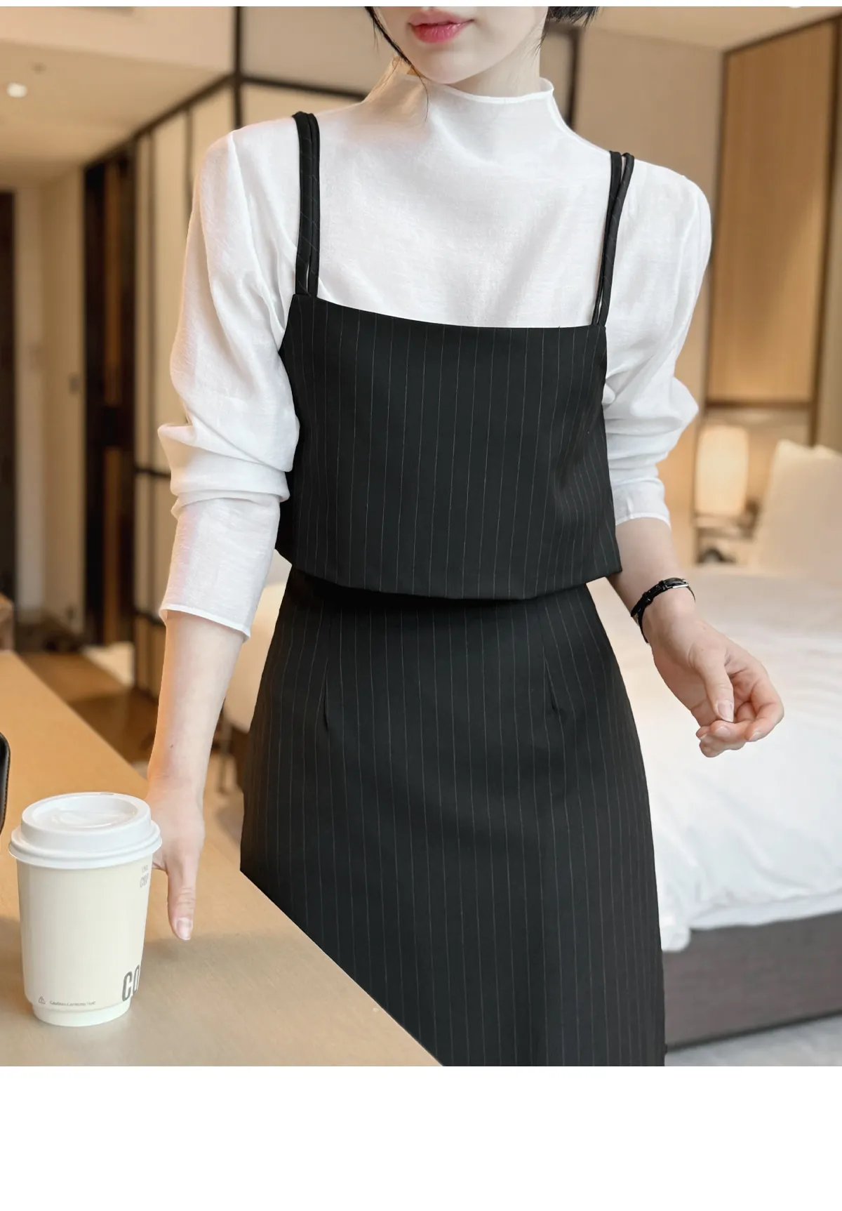 ラウンドネックノーカラースリットハイウエスト肩パッドペプラムスリムHライン長袖タックシークレットボタンダブルボタン無地ツーピース(トップス、ボトムス)スカートダブルジャケット