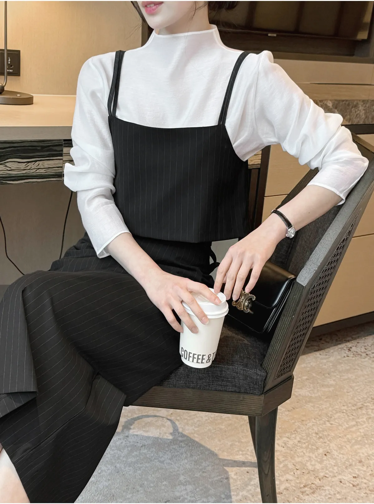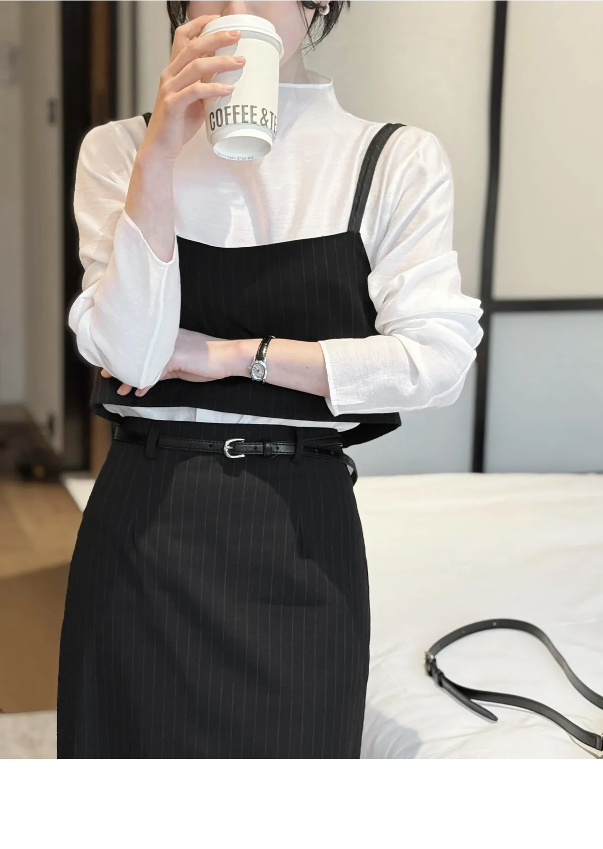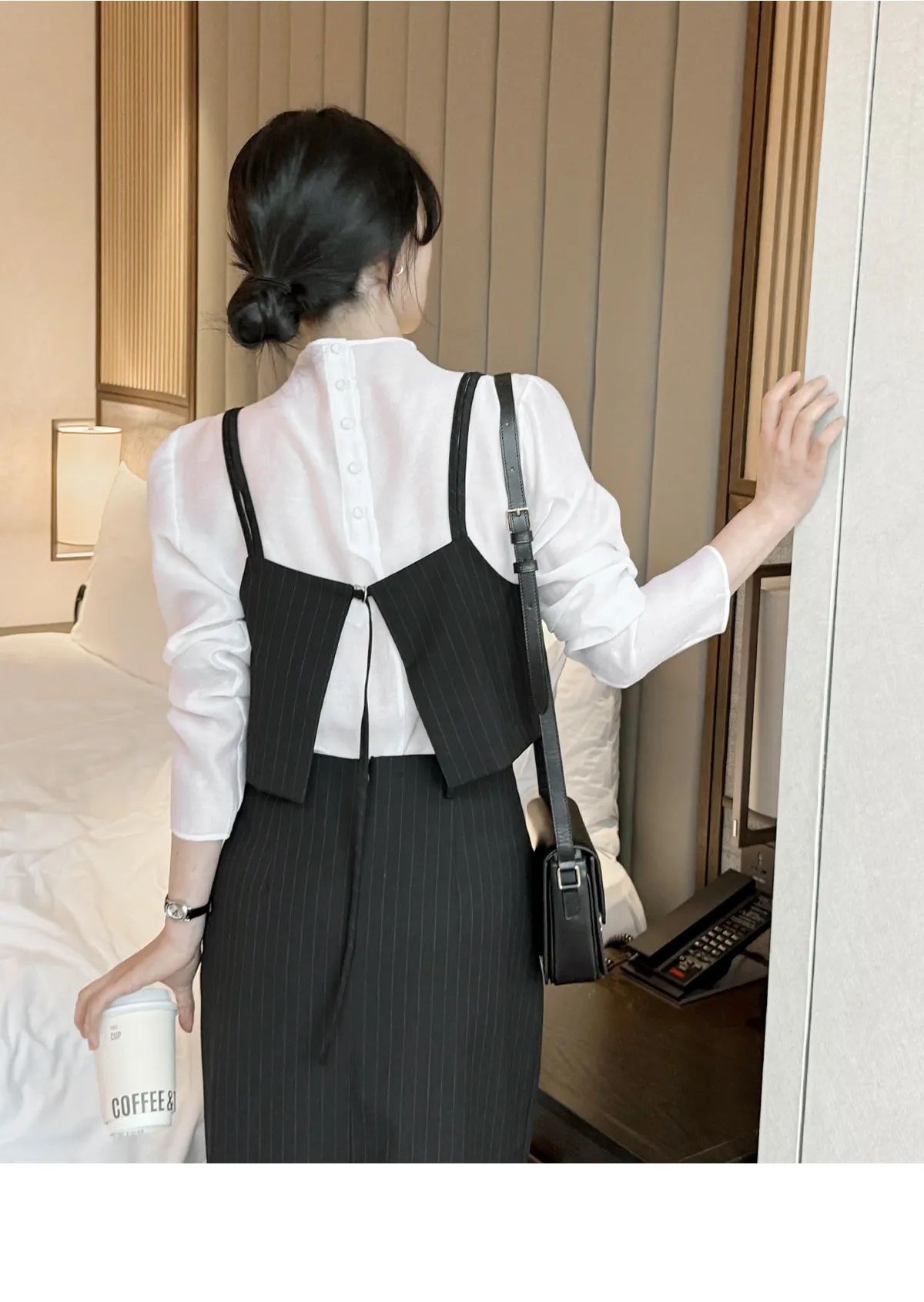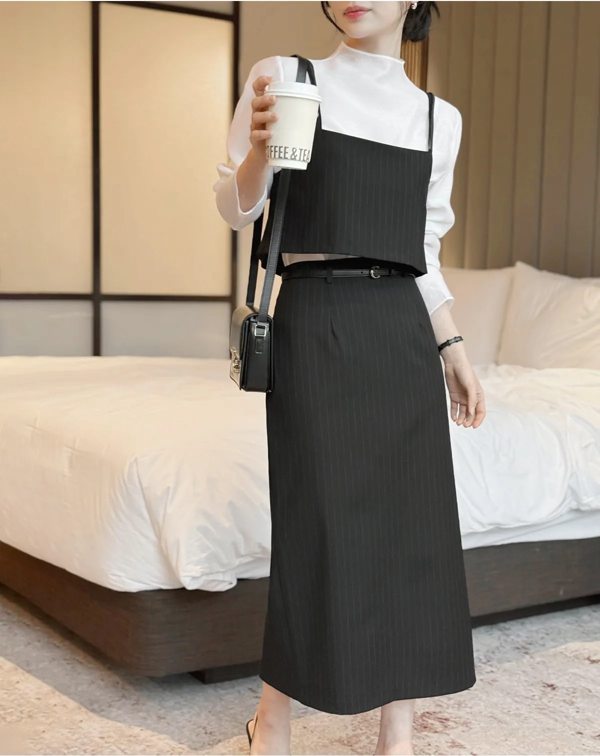 ラウンドネックノーカラースリットハイウエスト肩パッドペプラムスリムHライン長袖タックシークレットボタンダブルボタン無地ツーピース(トップス、ボトムス)スカートダブルジャケット