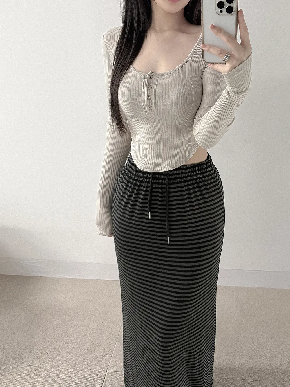 ボタンディテールとリブ素材の組み合わせで、