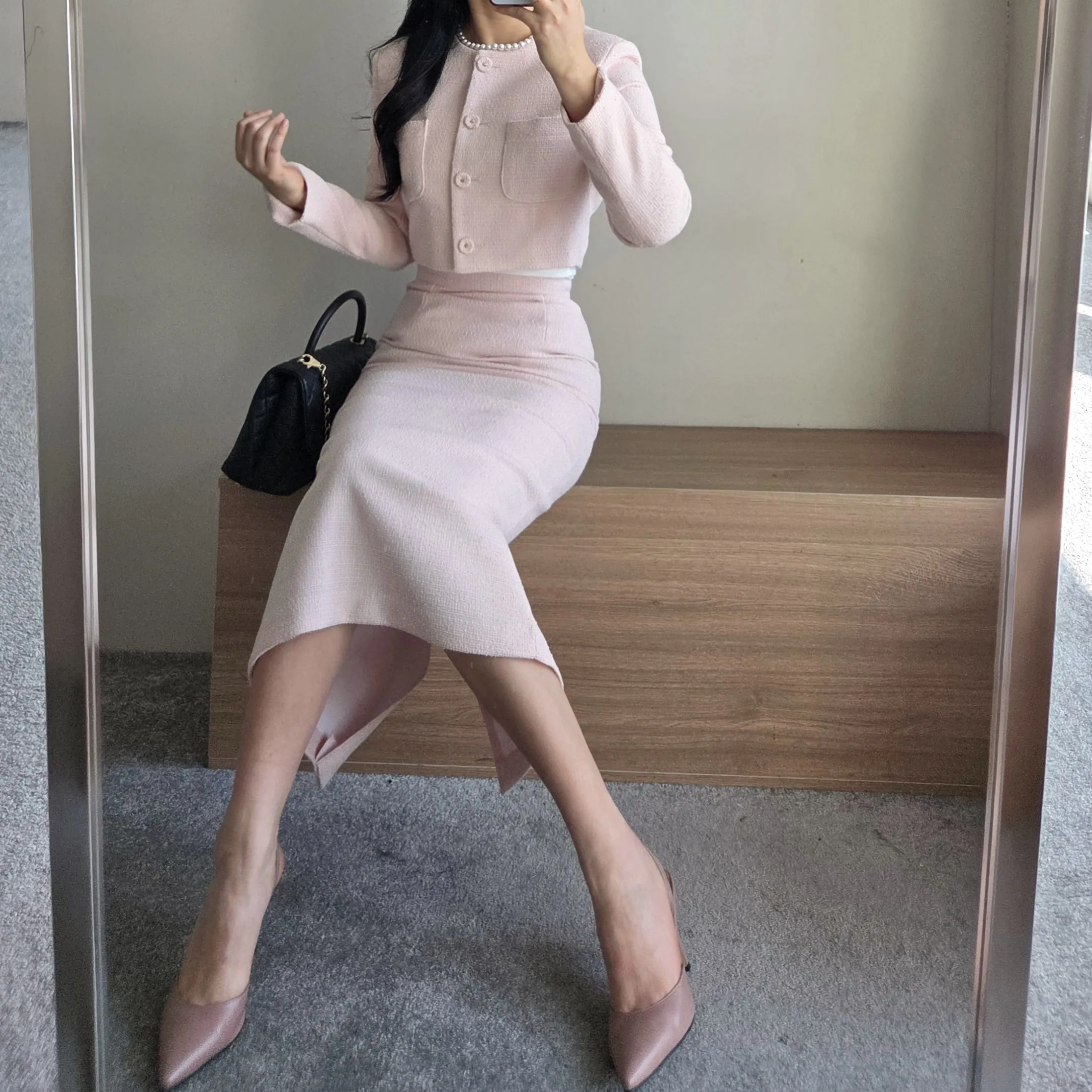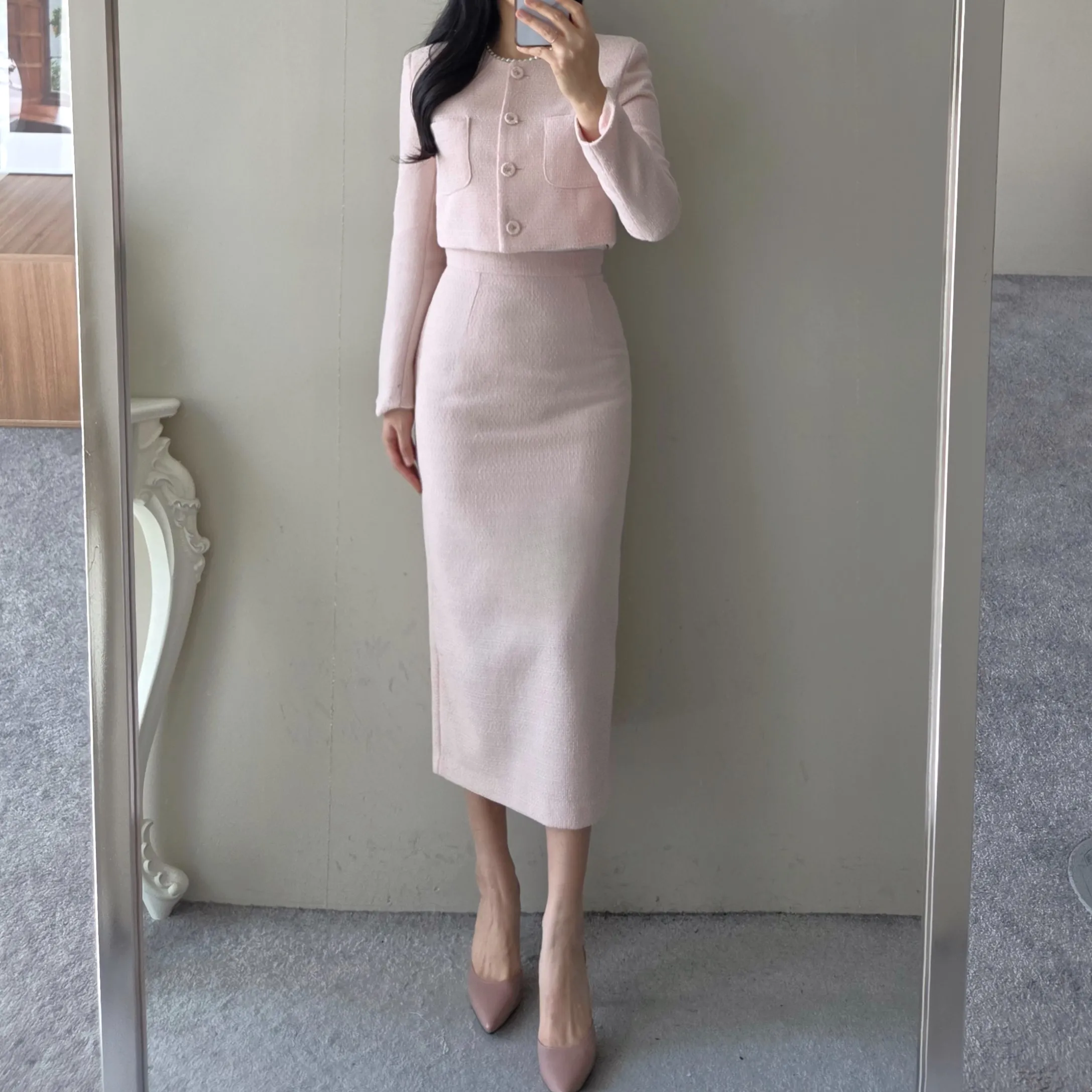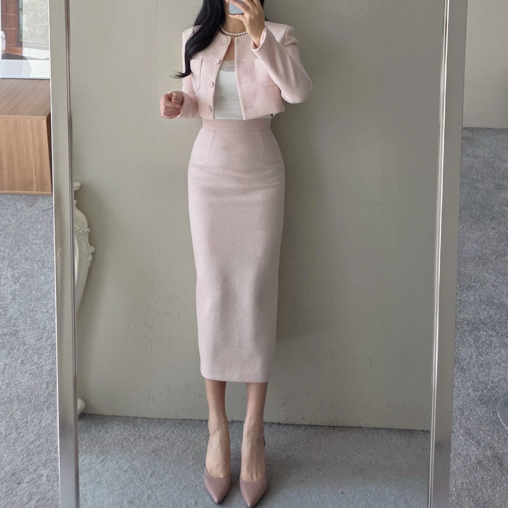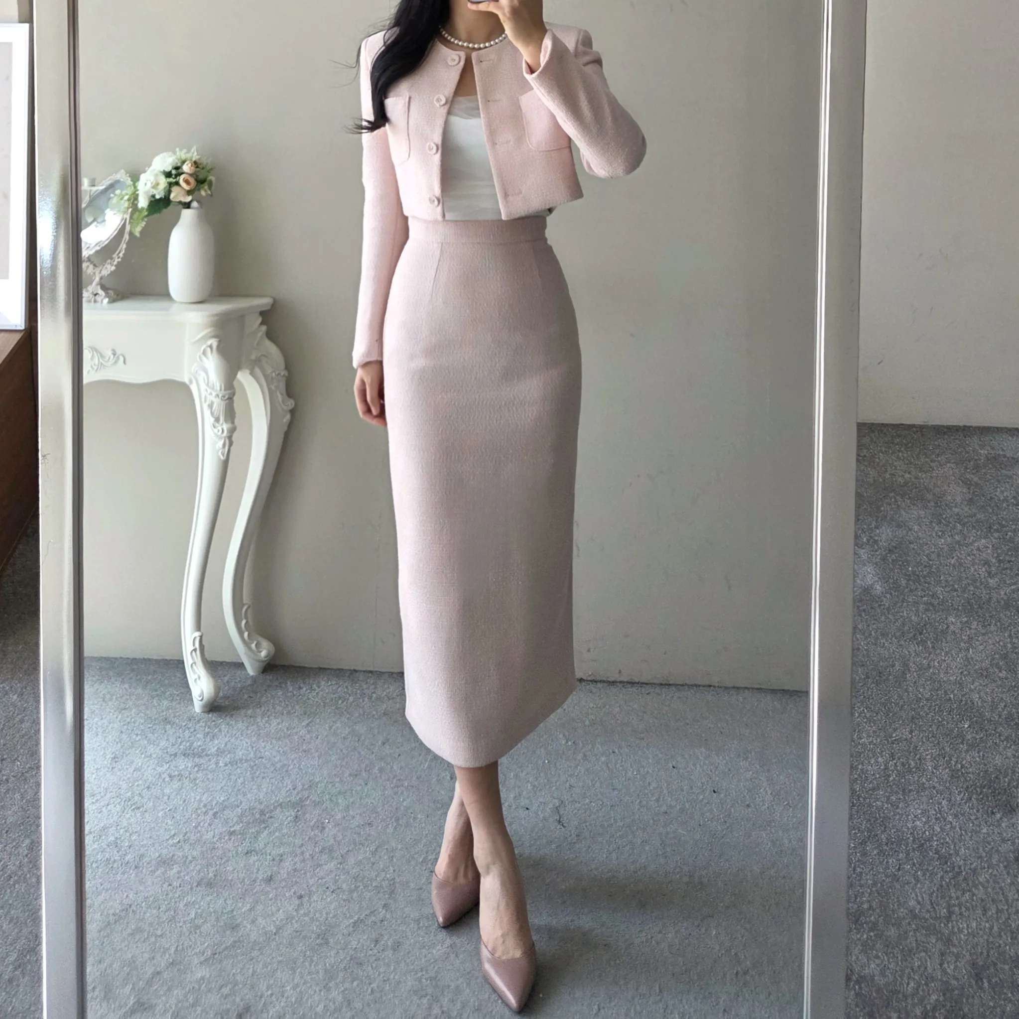 ラウンドネックノーカラースリットハイウエスト肩パッドペプラムスリムHライン長袖タックシークレットボタンダブルボタン無地ツーピース(トップス、ボトムス)スカートダブルジャケット