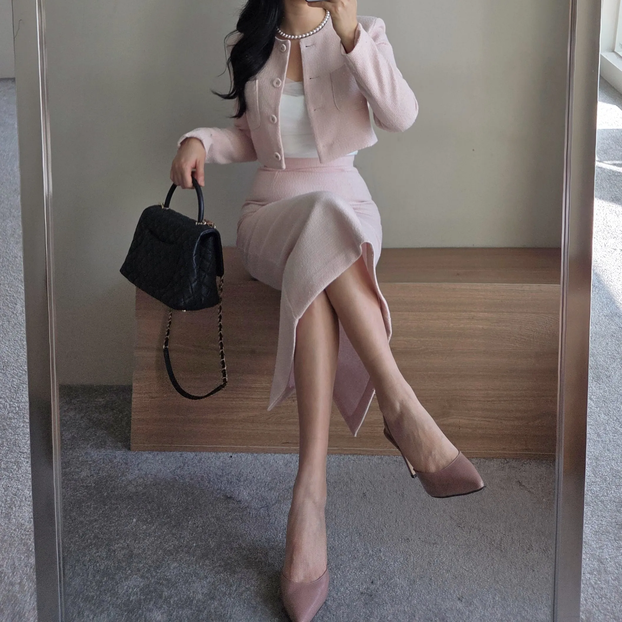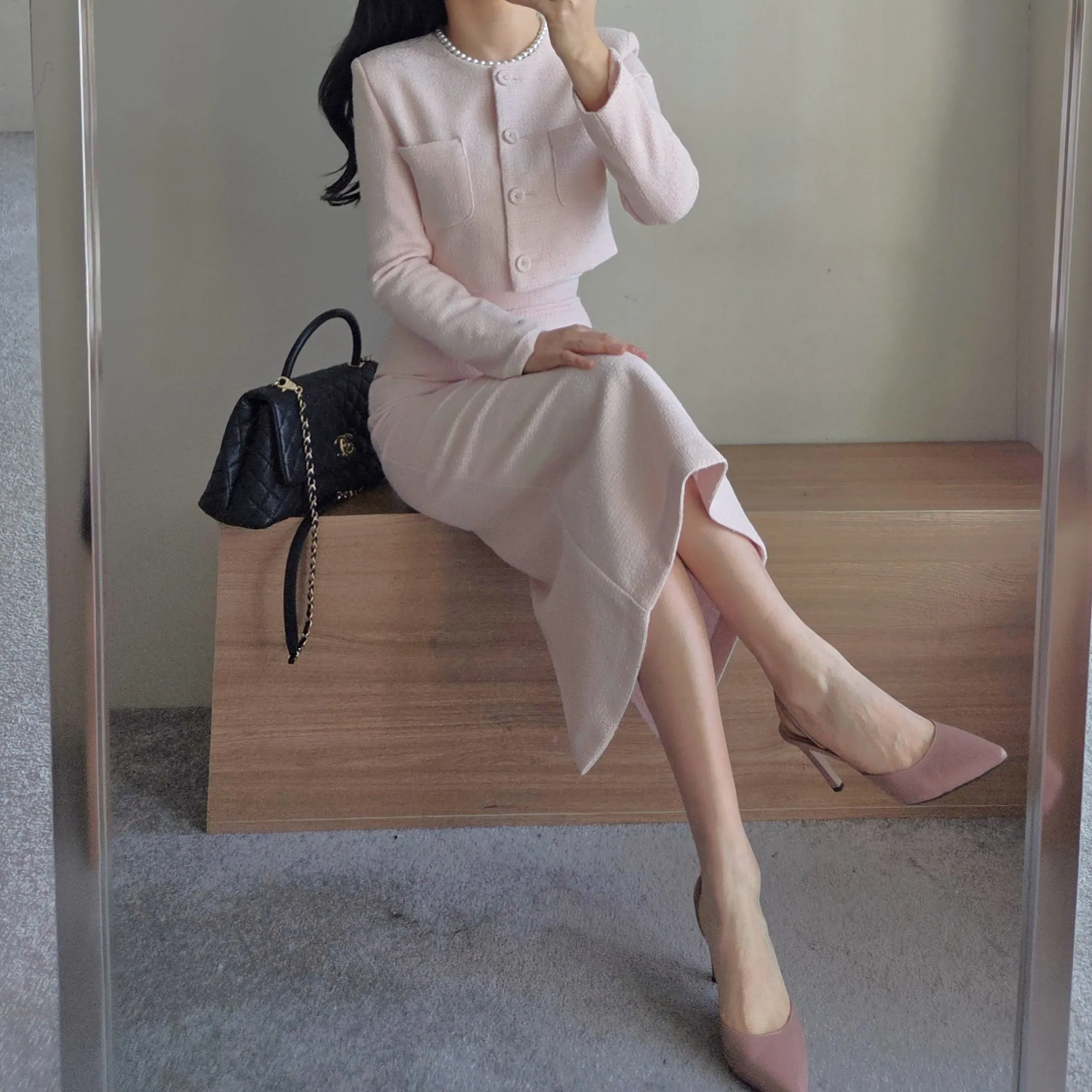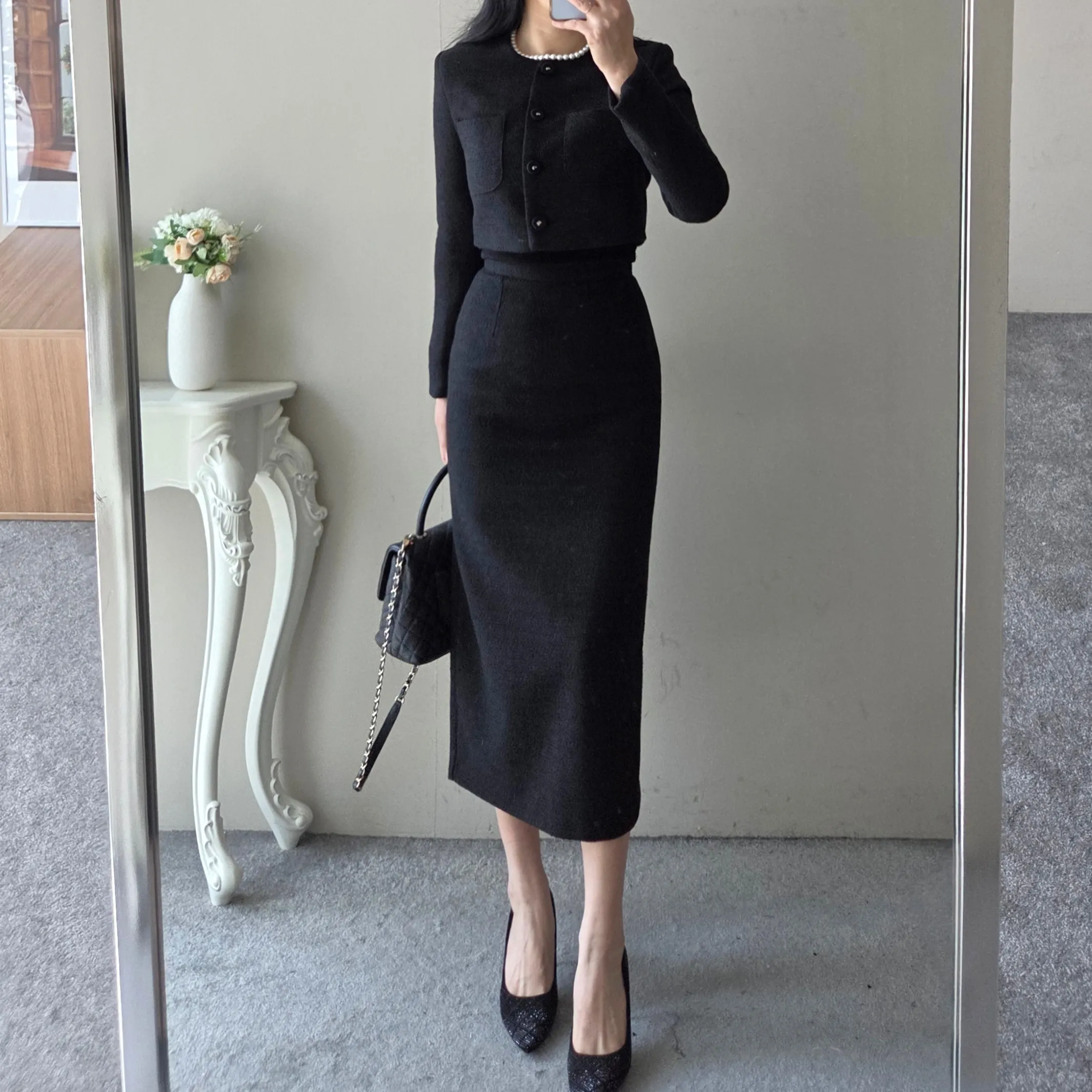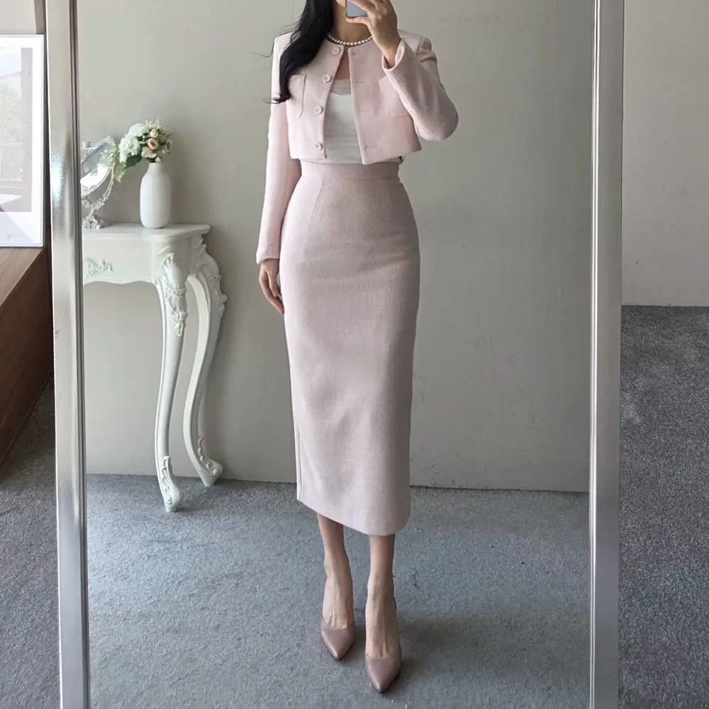 ラウンドネックノーカラースリットハイウエスト肩パッドペプラムスリムHライン長袖タックシークレットボタンダブルボタン無地ツーピース(トップス、ボトムス)スカートダブルジャケット