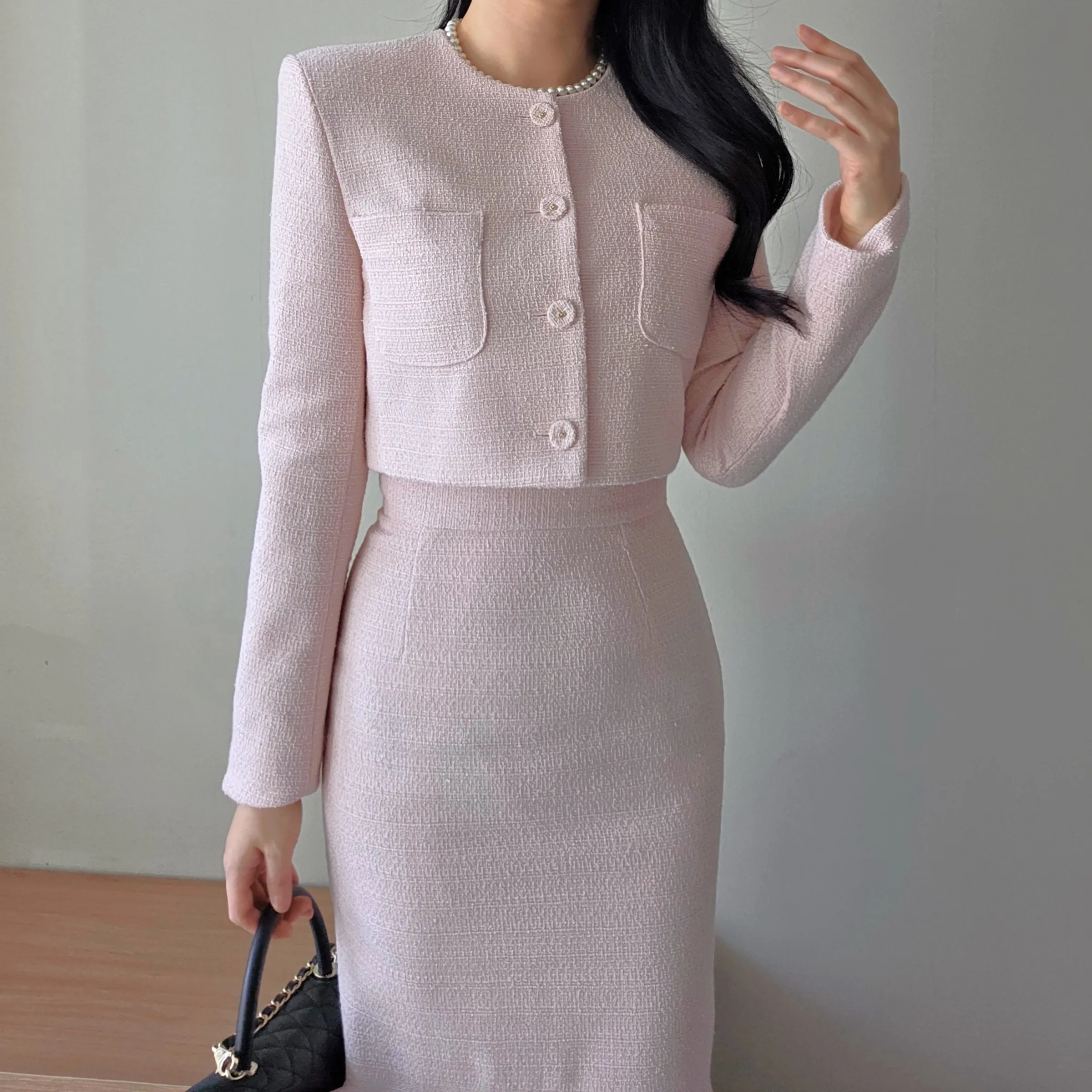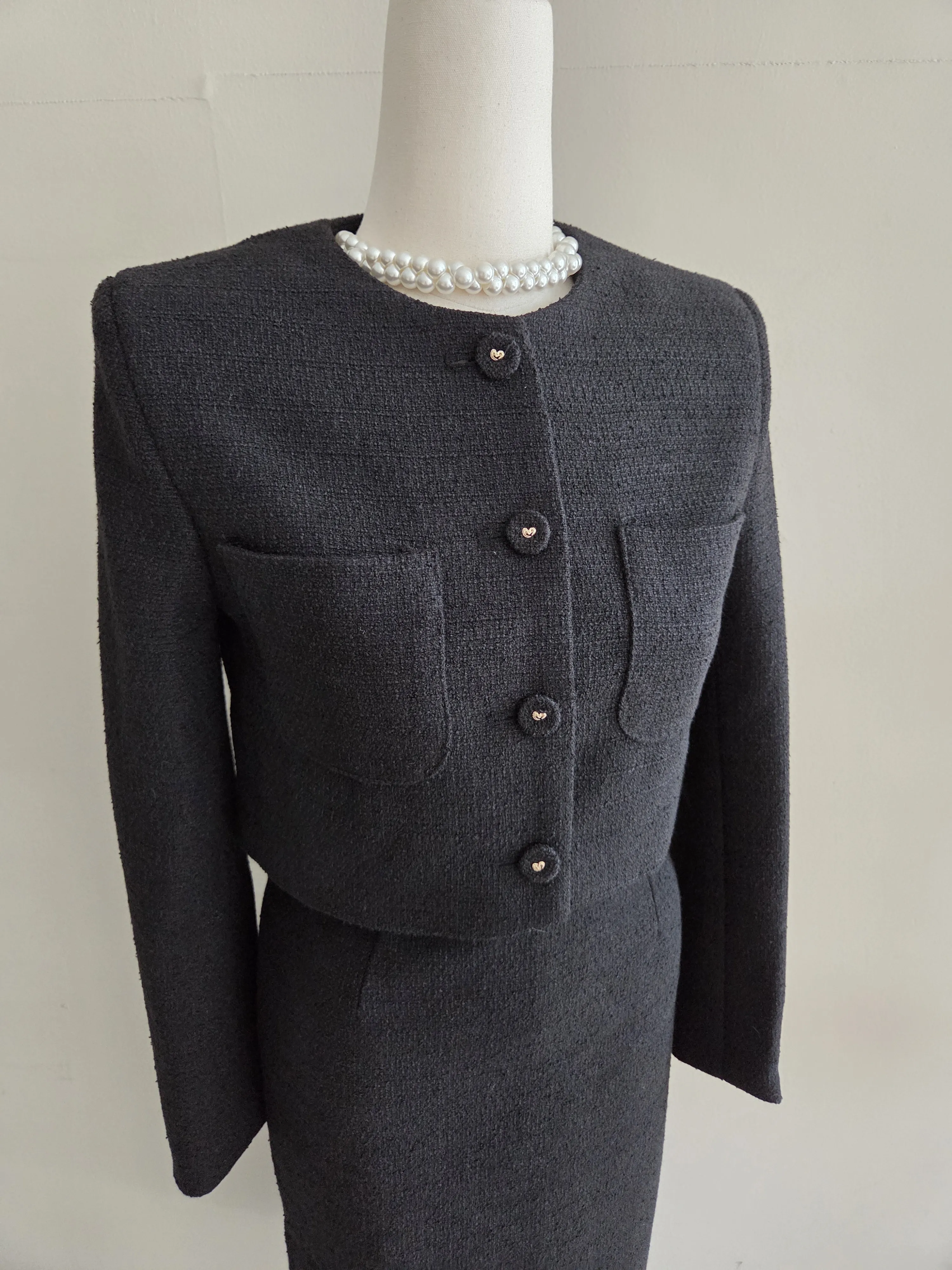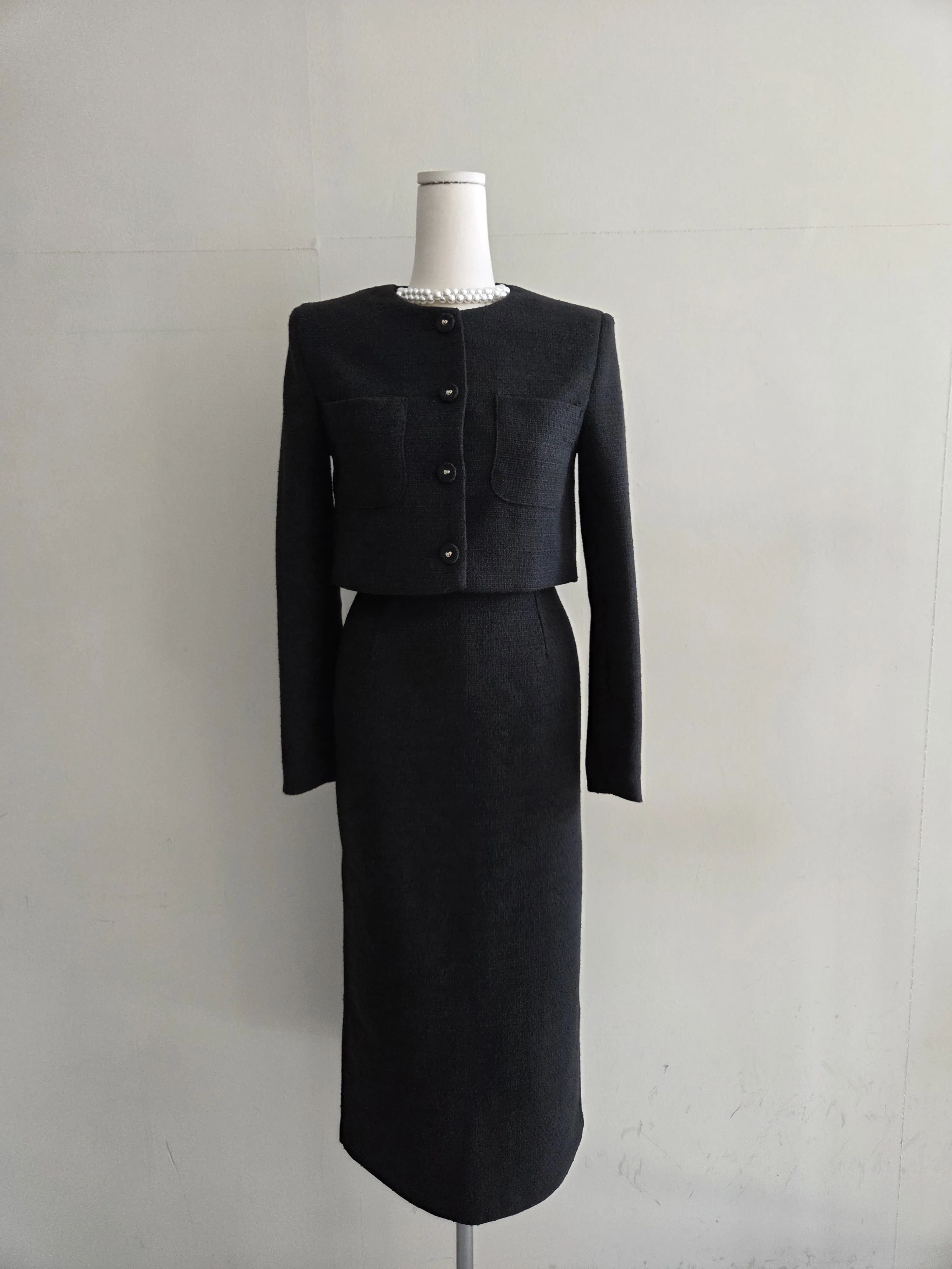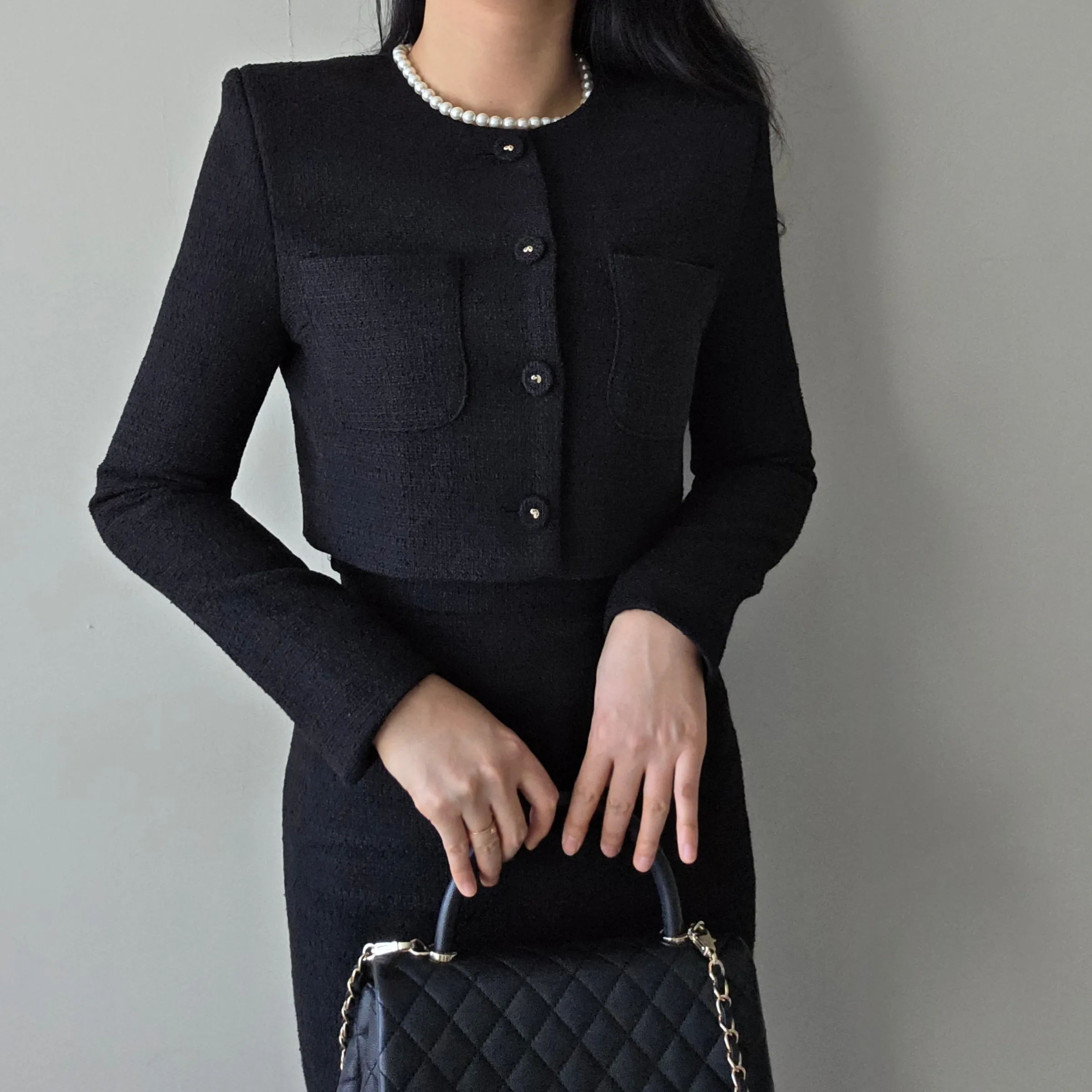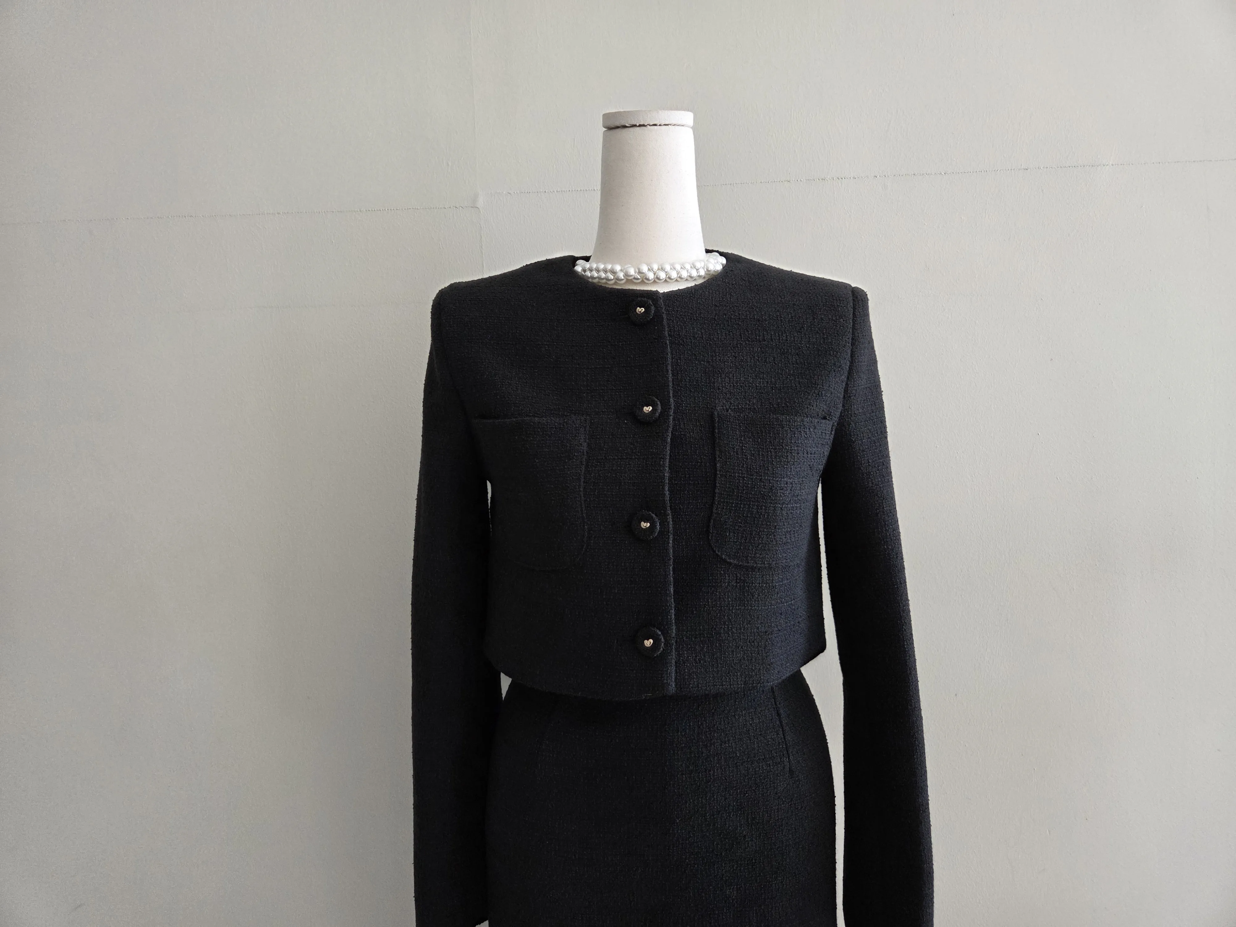 ツイードボタンラウンドネックノーカラーポケット肩パッドクロップド長袖フェイクポケットHライン(ロング丈)ヒドゥンジッパー無地ツーピース(トップス、ボトムス)スカートジャケット