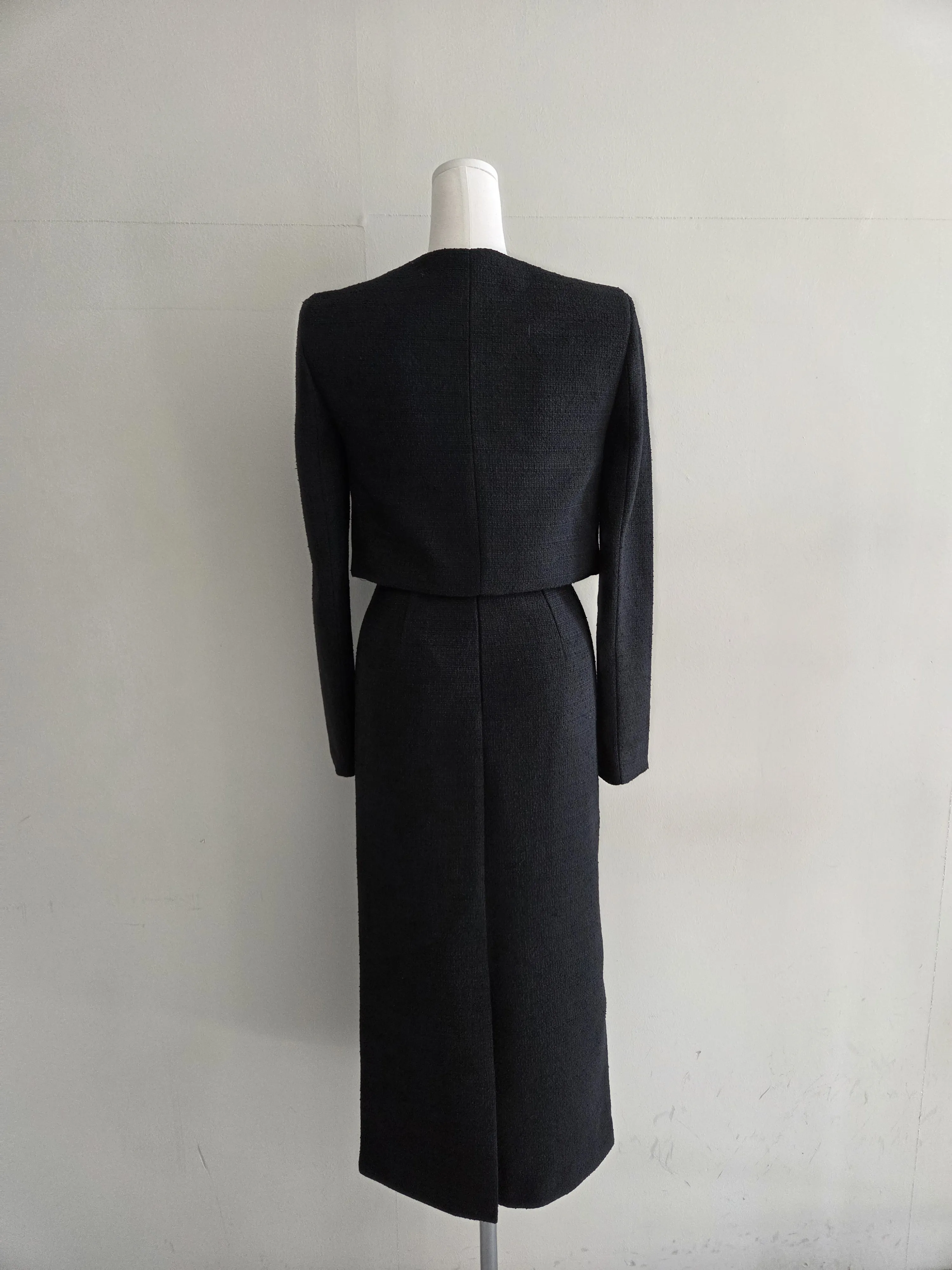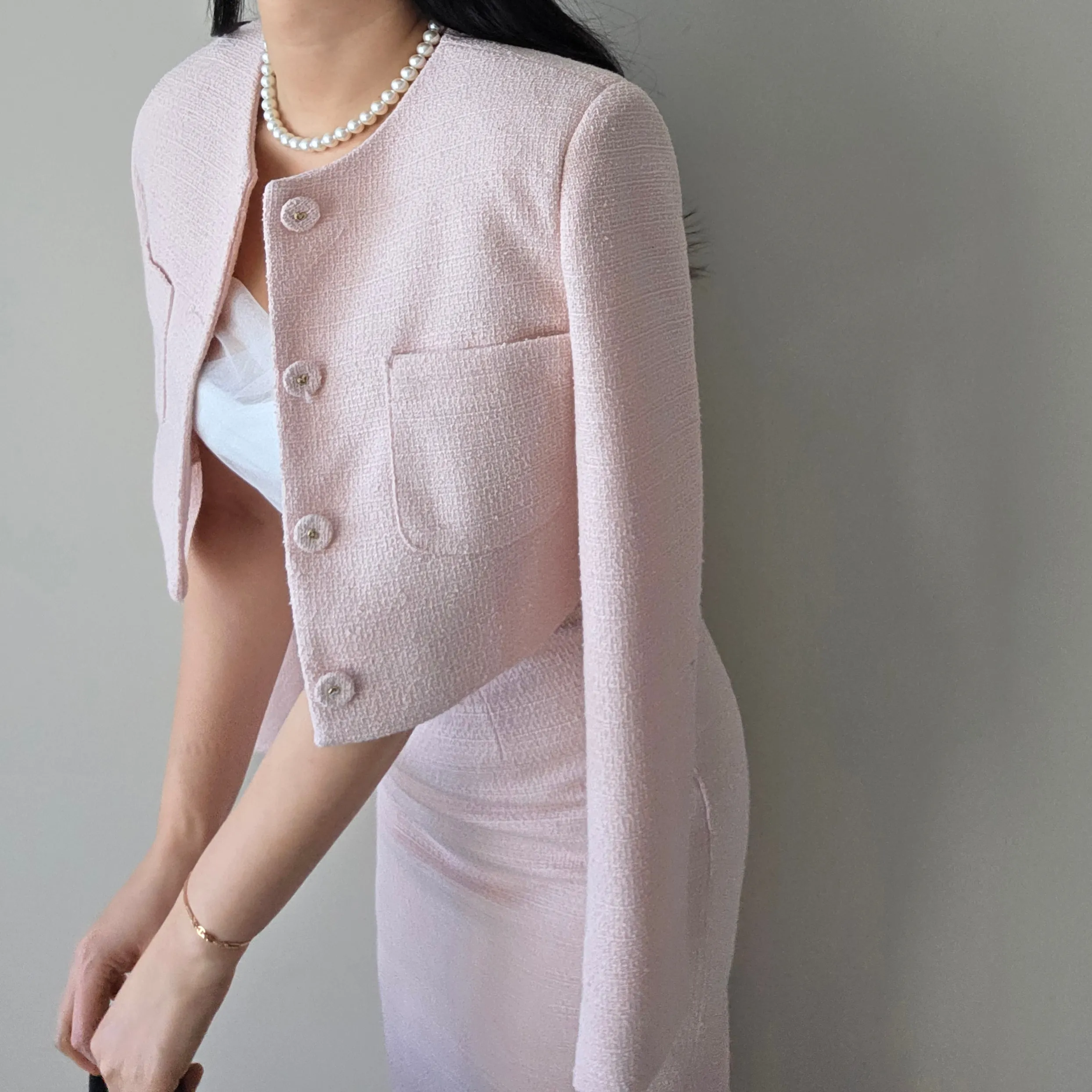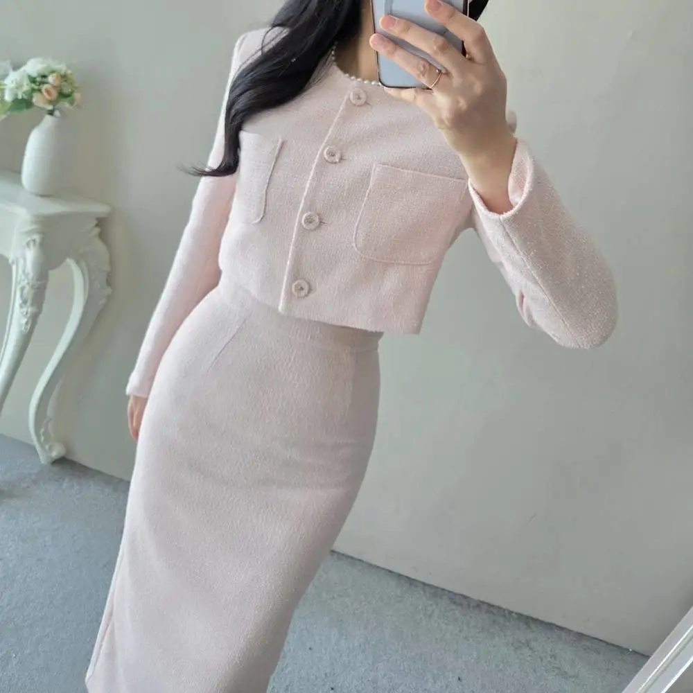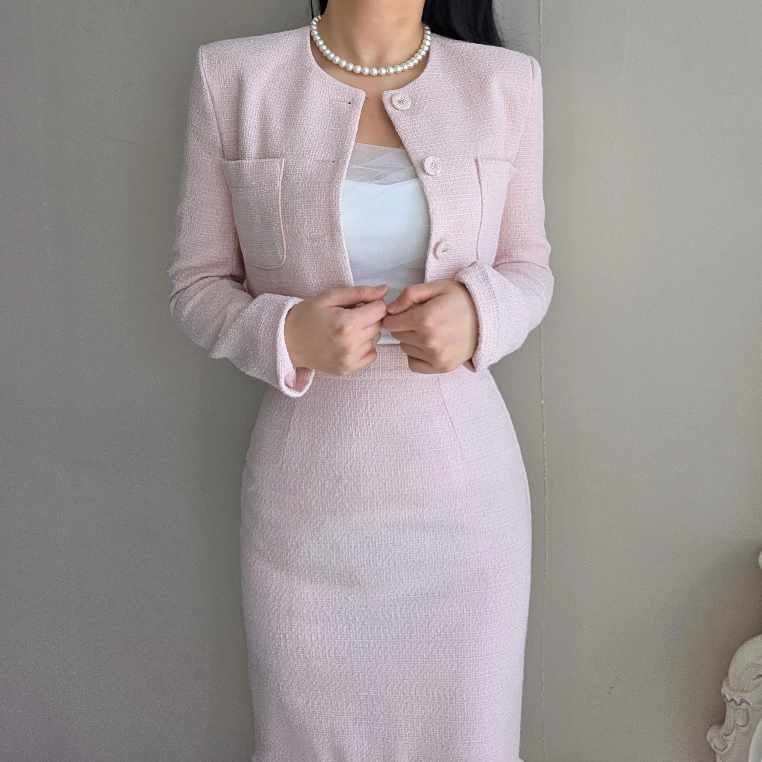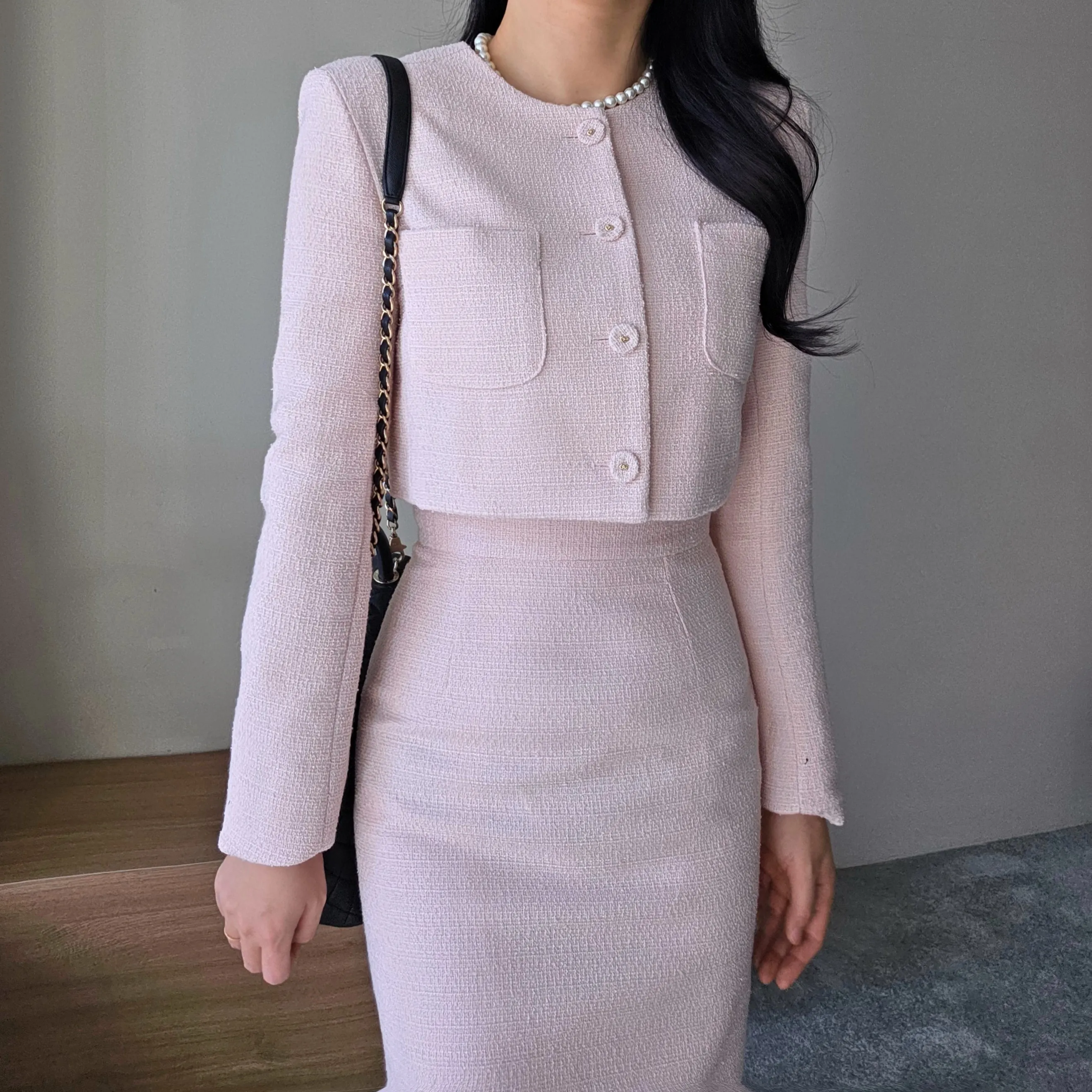 ツイードボタンラウンドネックノーカラーポケット肩パッドクロップド長袖フェイクポケットHライン(ロング丈)ヒドゥンジッパー無地ツーピース(トップス、ボトムス)スカートジャケット