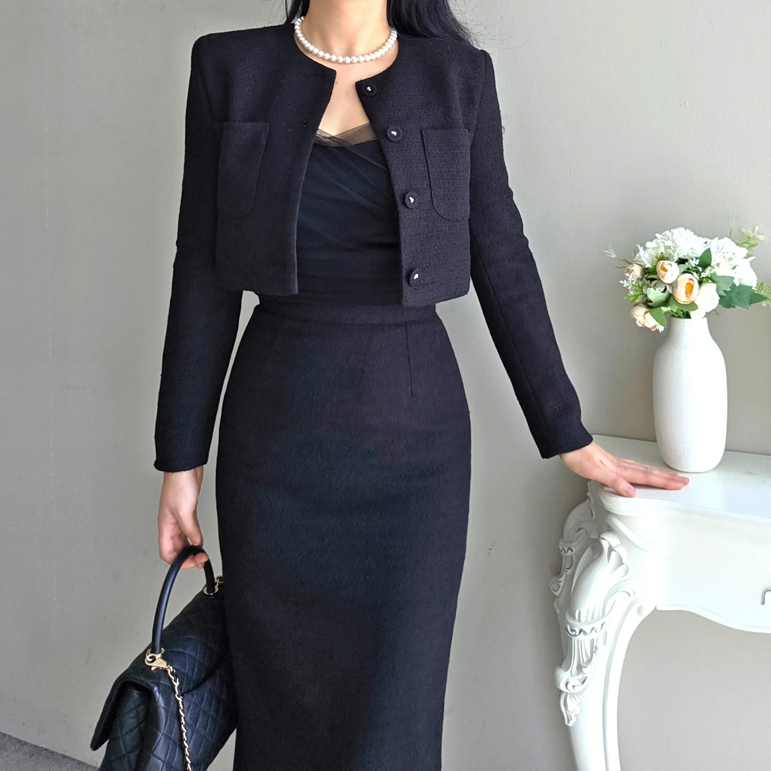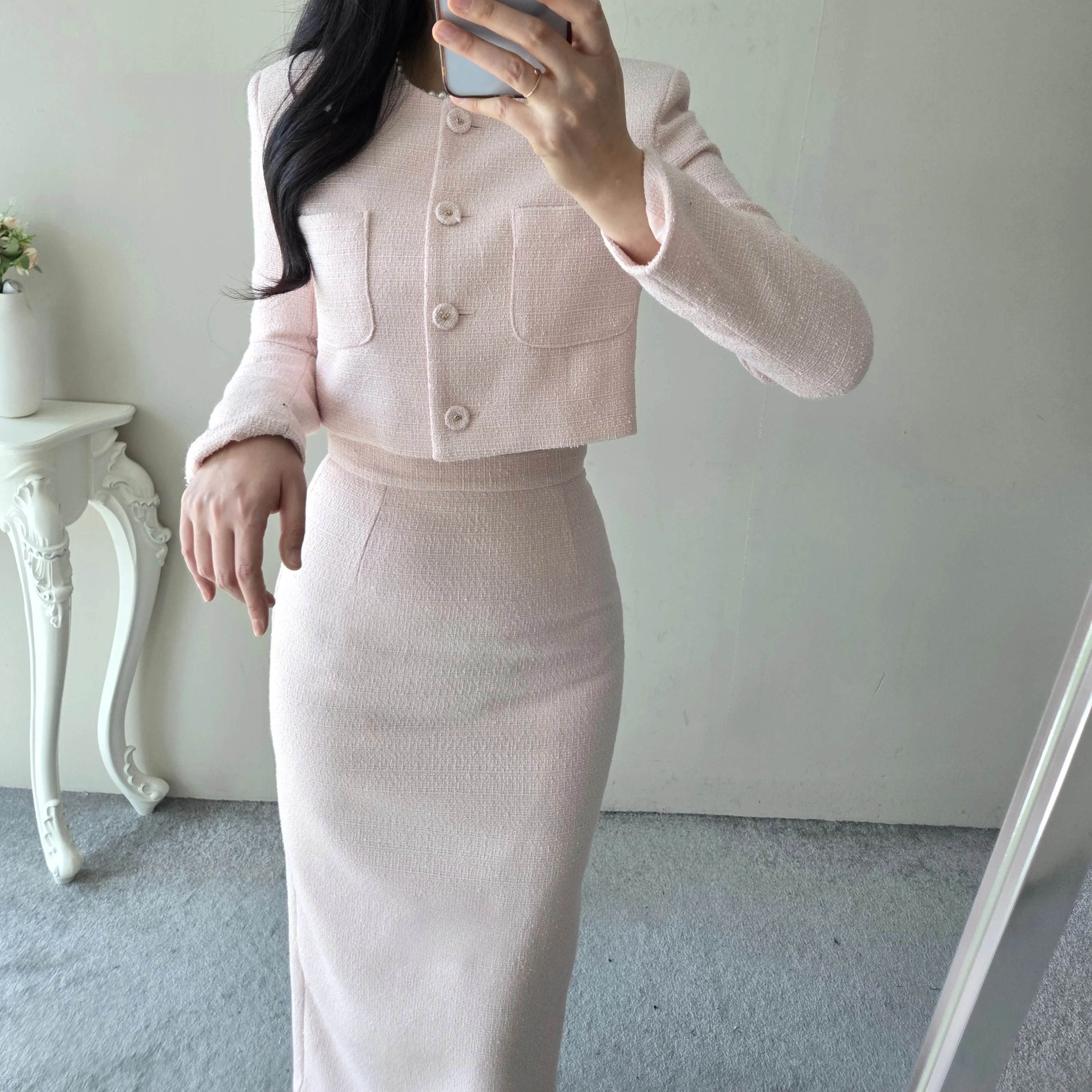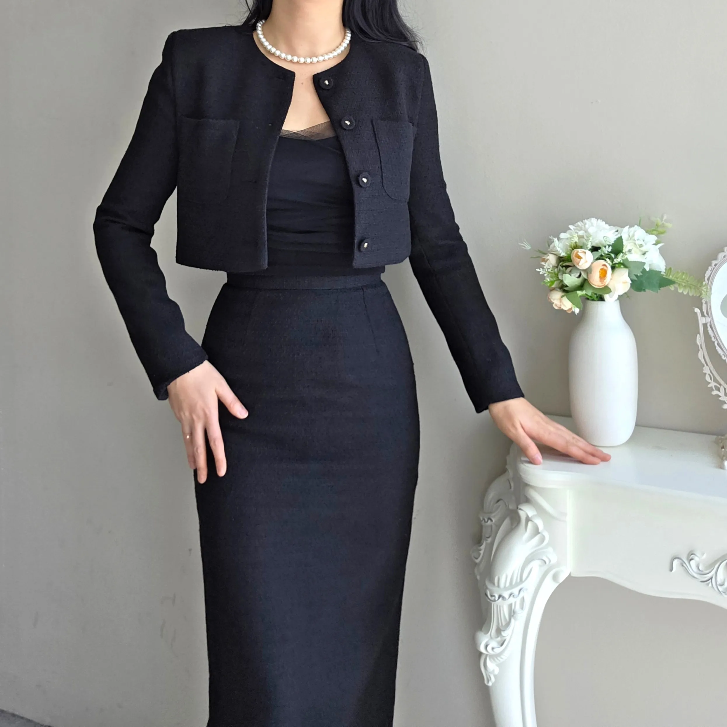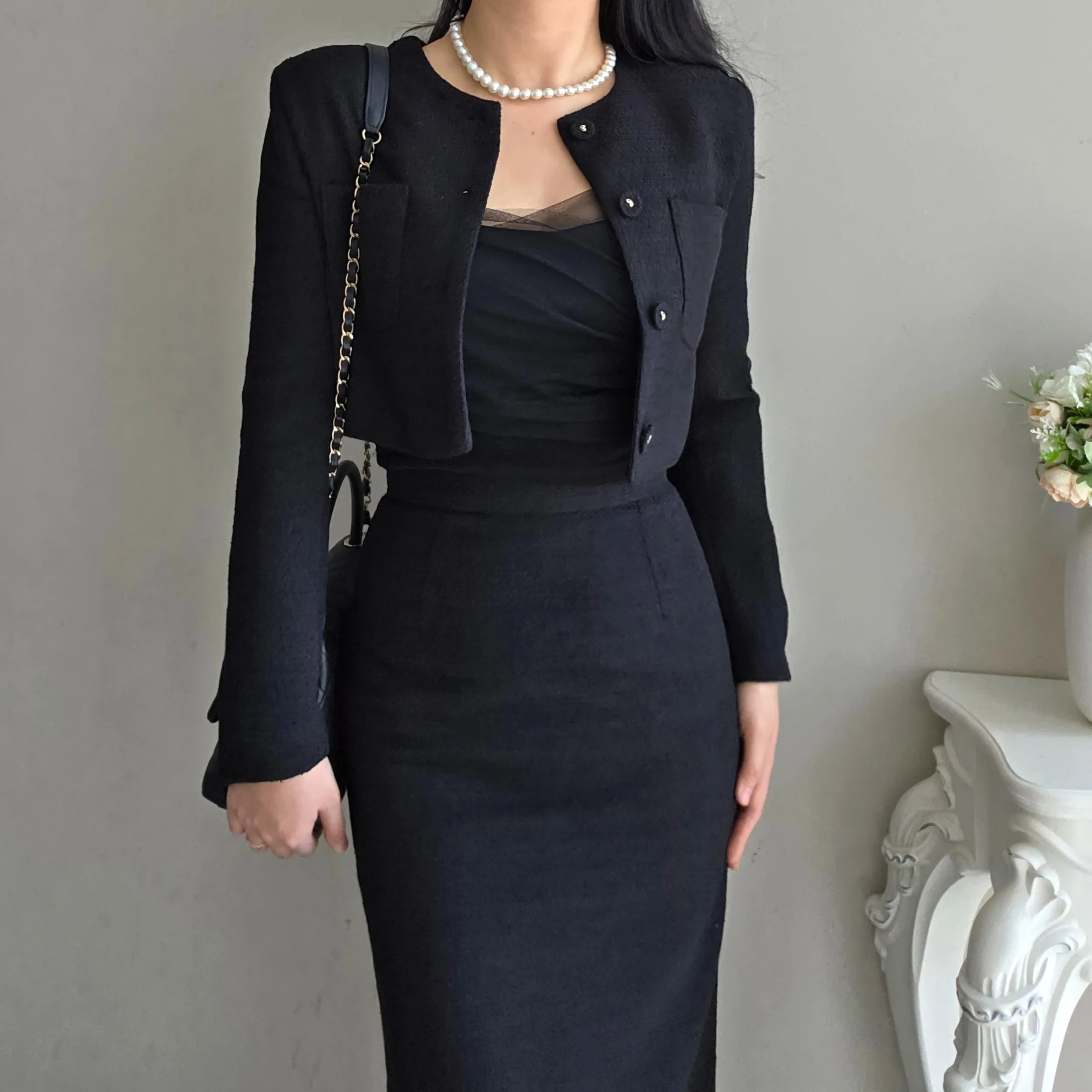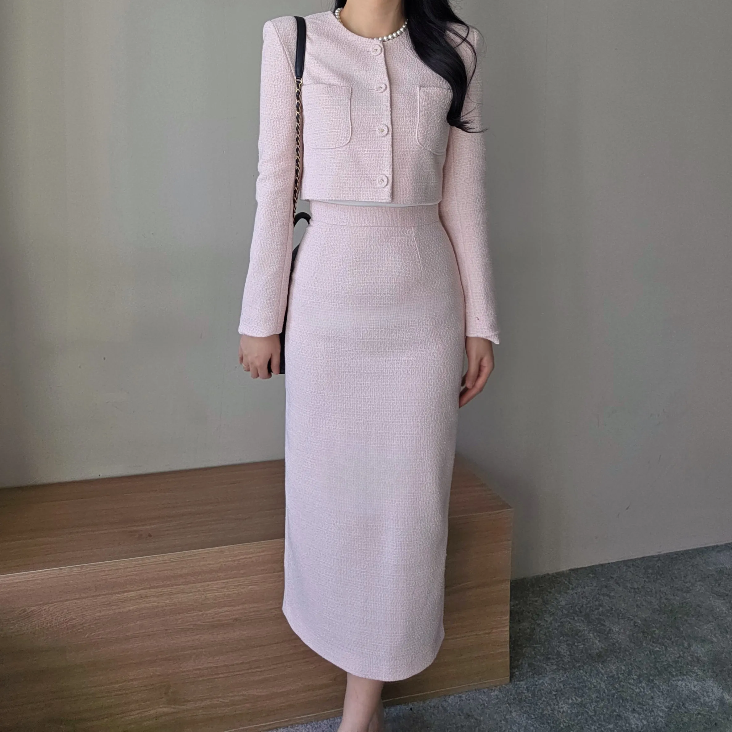 ツイードボタンラウンドネックノーカラーポケット肩パッドクロップド長袖フェイクポケットHライン(ロング丈)ヒドゥンジッパー無地ツーピース(トップス、ボトムス)スカートジャケット