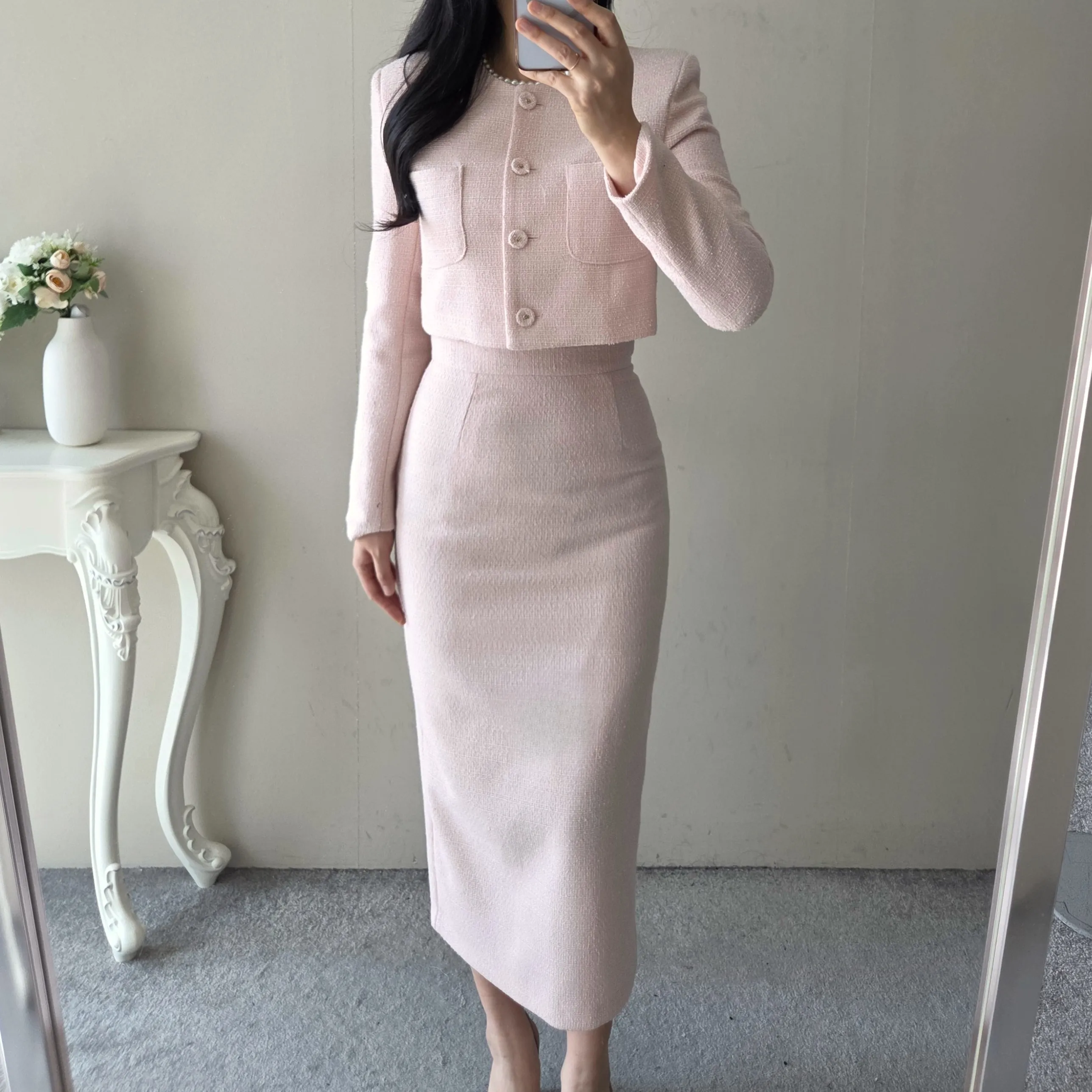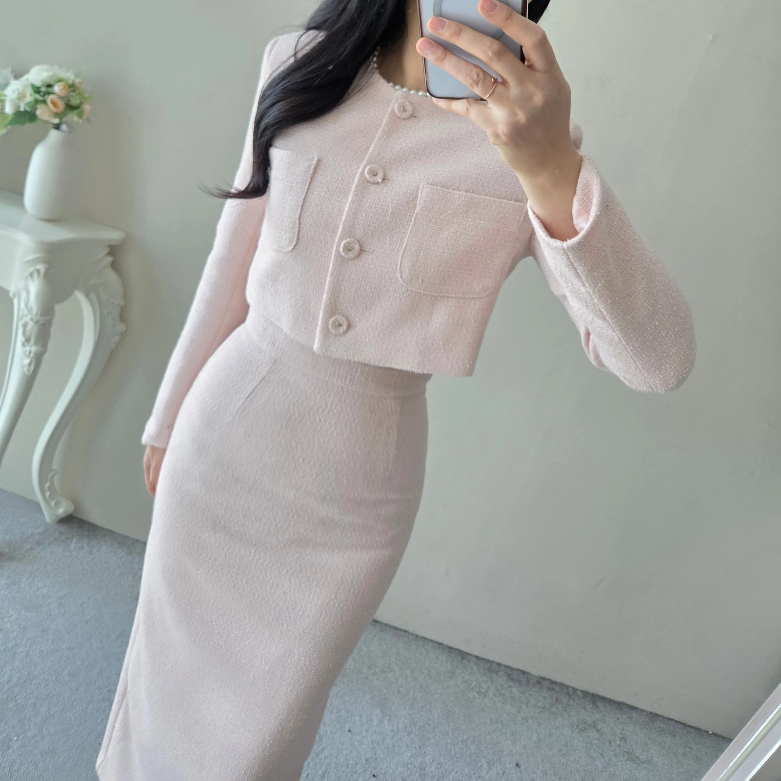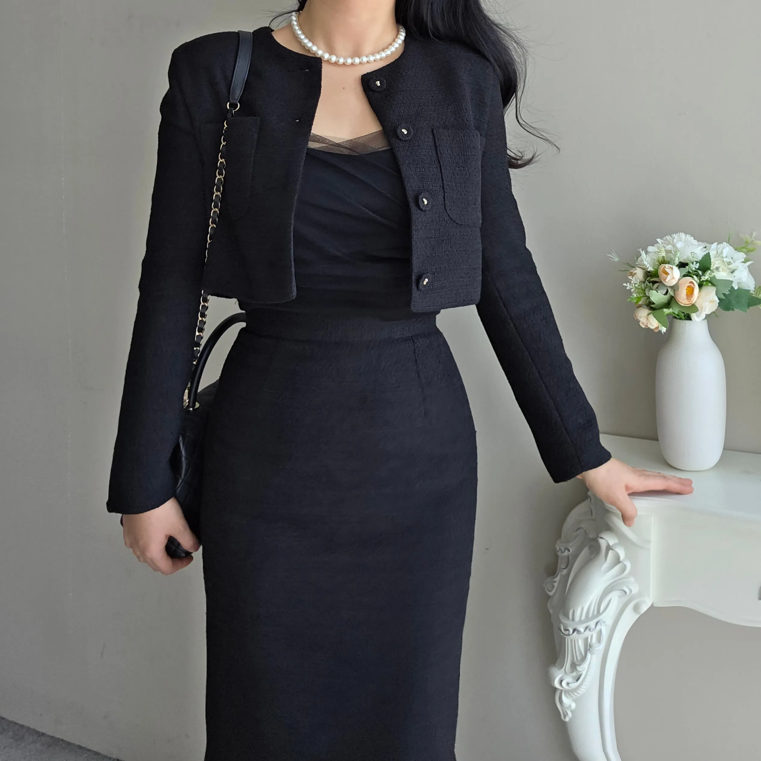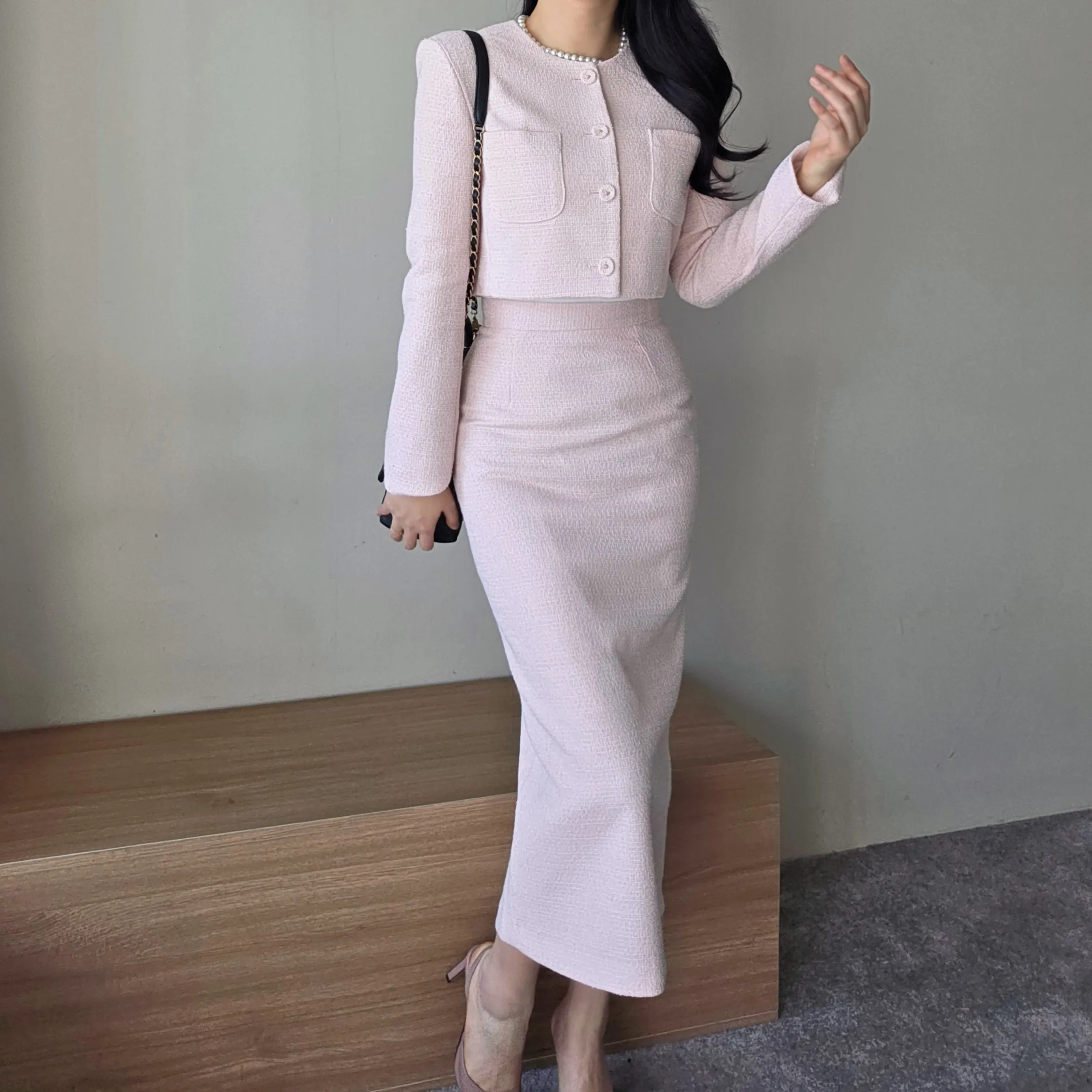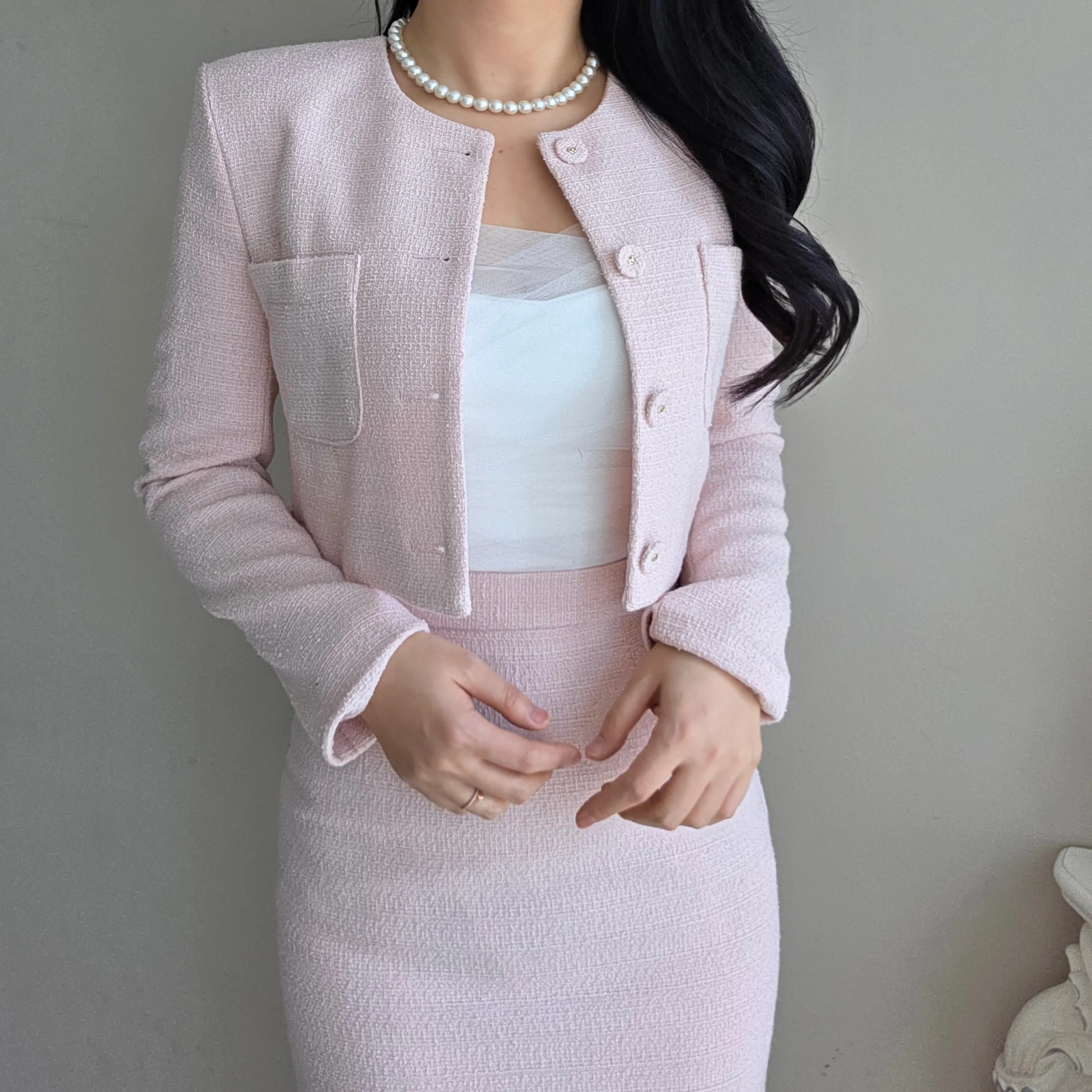 ツイードボタンラウンドネックノーカラーポケット肩パッドクロップド長袖フェイクポケットHライン(ロング丈)ヒドゥンジッパー無地ツーピース(トップス、ボトムス)スカートジャケット