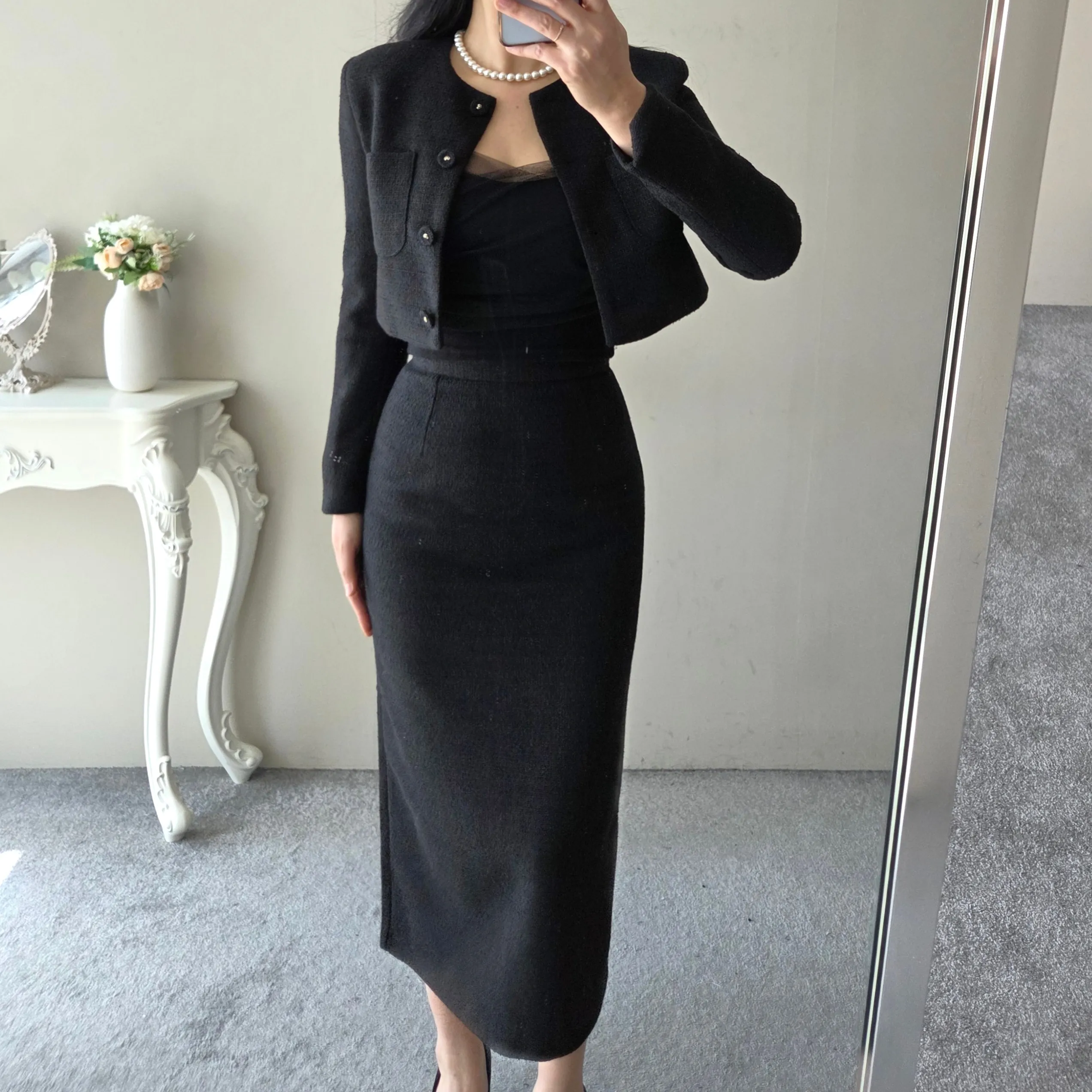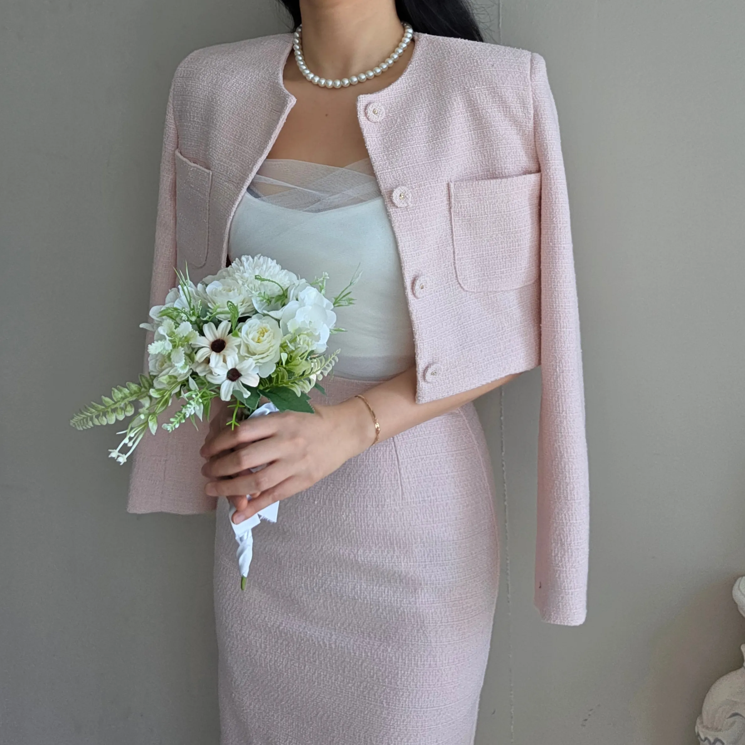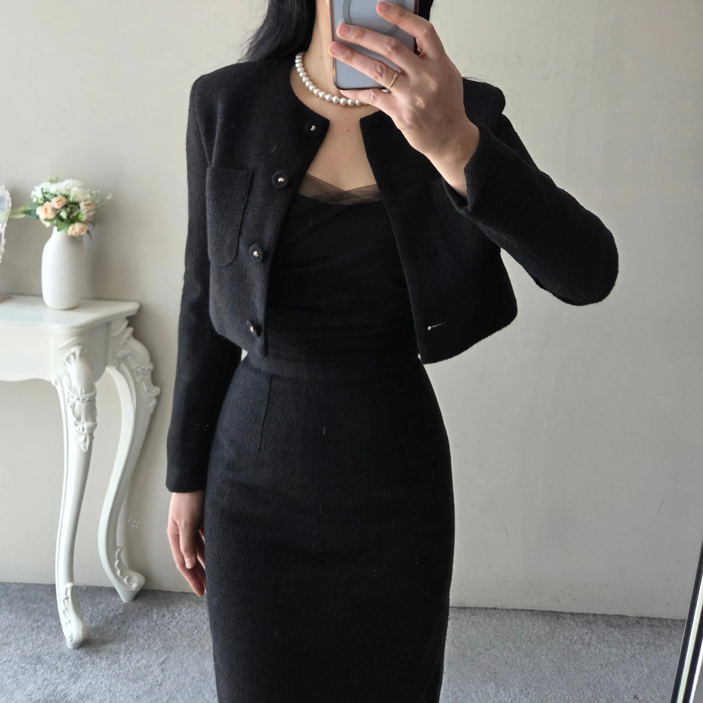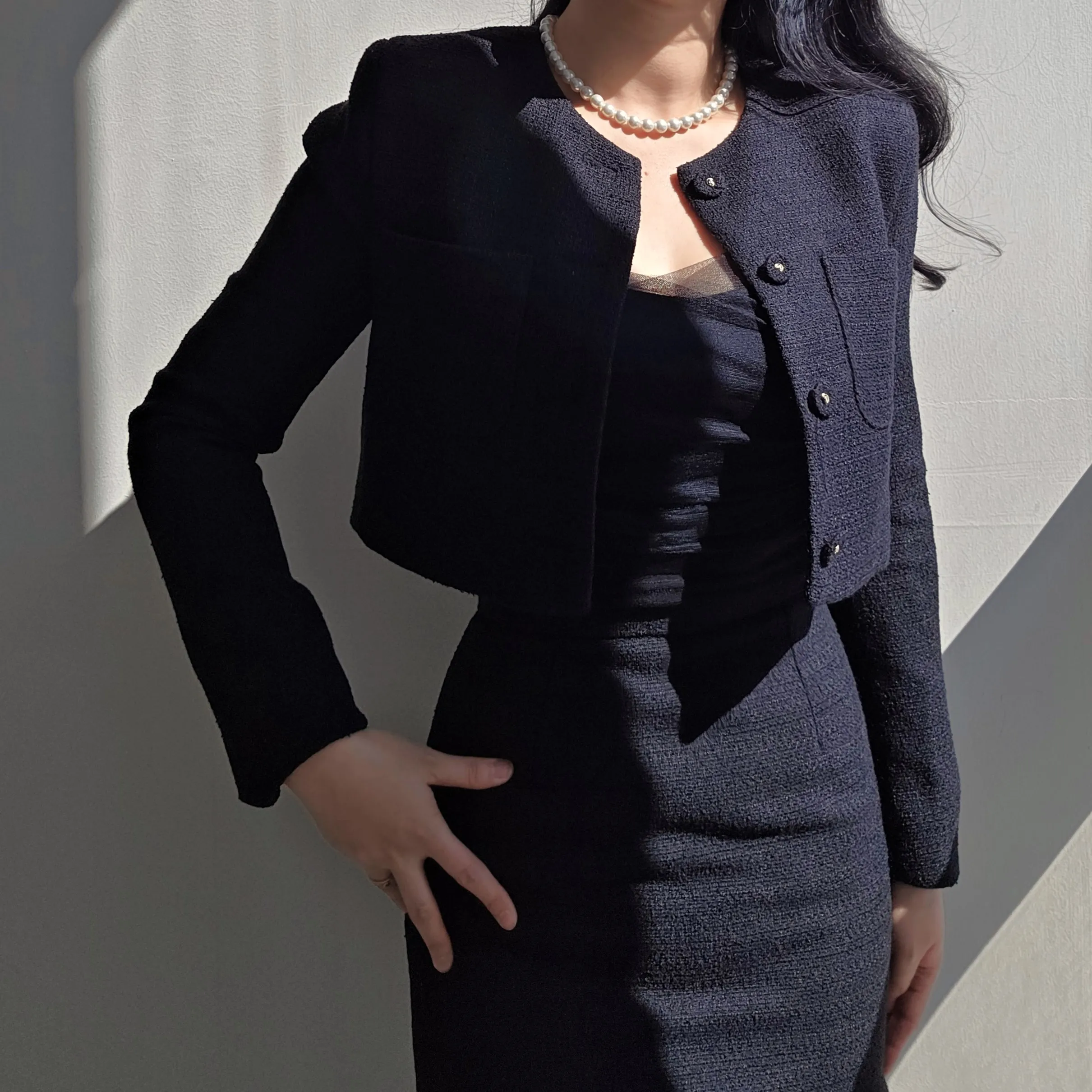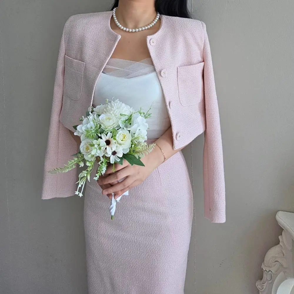 ツイードボタンラウンドネックノーカラーポケット肩パッドクロップド長袖フェイクポケットHライン(ロング丈)ヒドゥンジッパー無地ツーピース(トップス、ボトムス)スカートジャケット