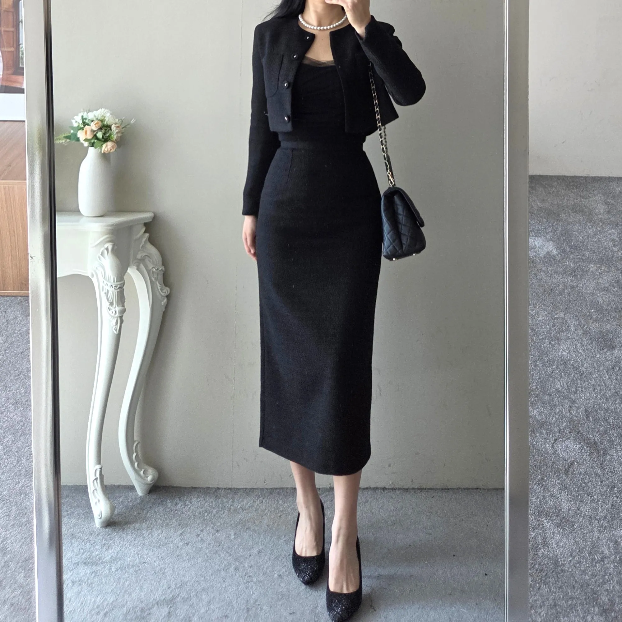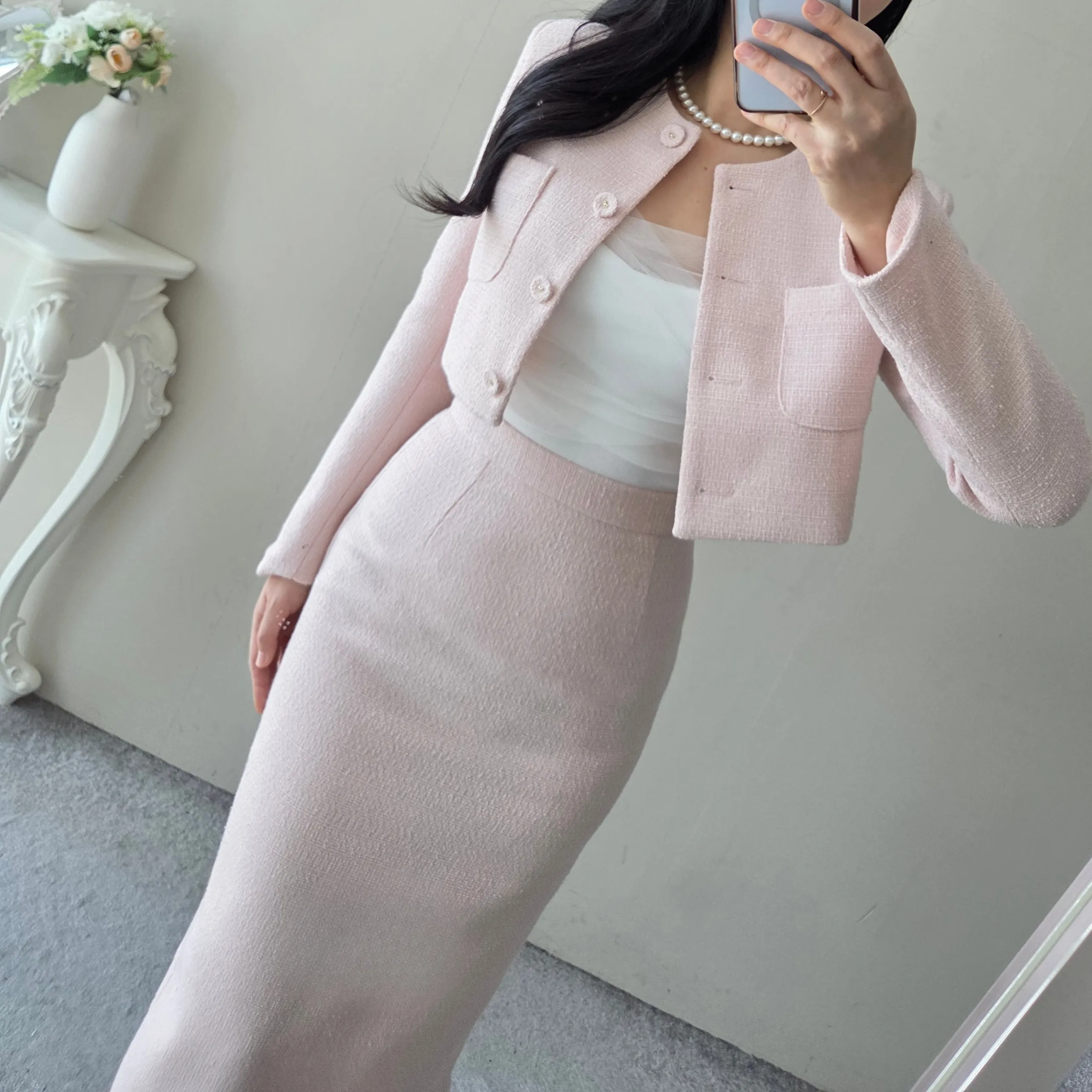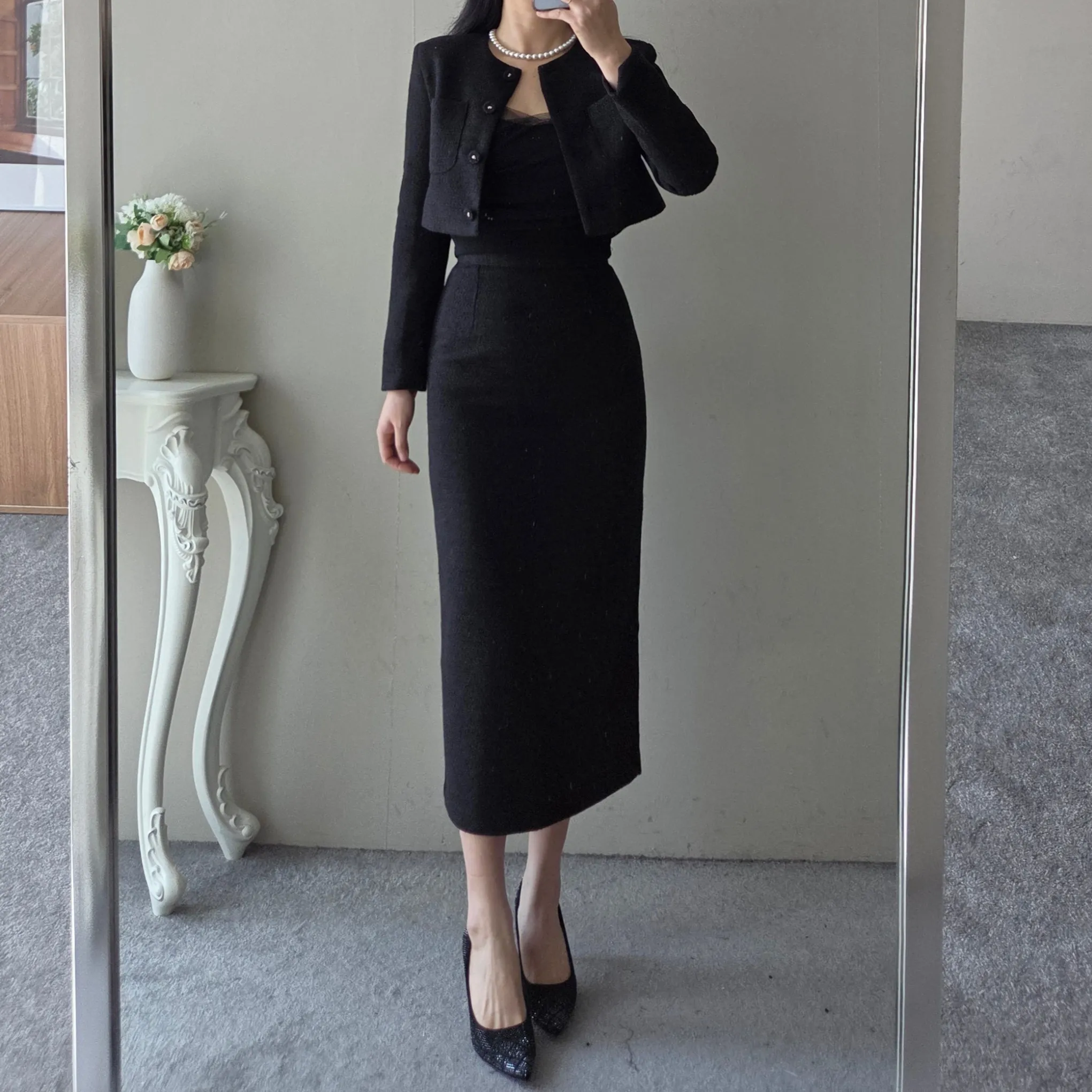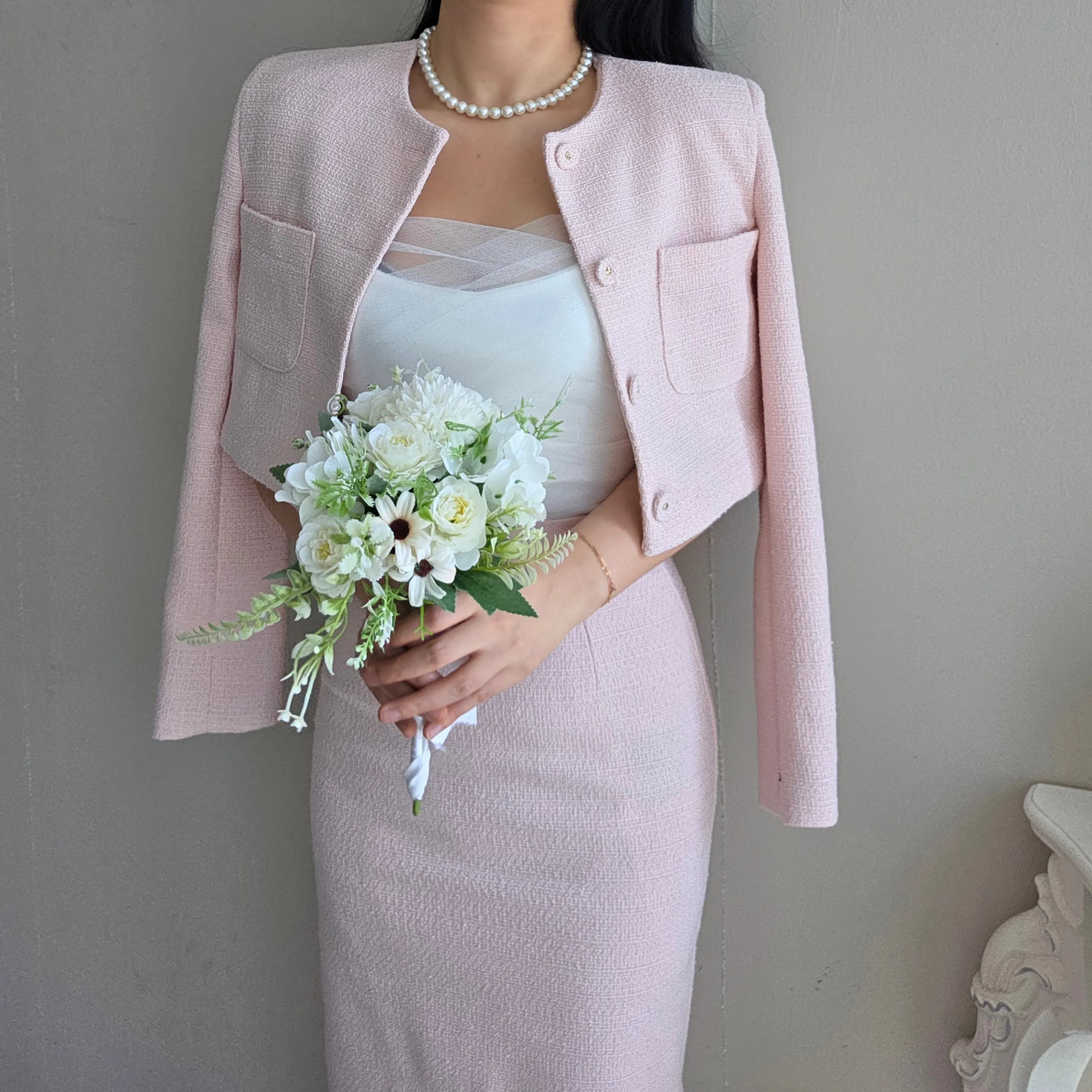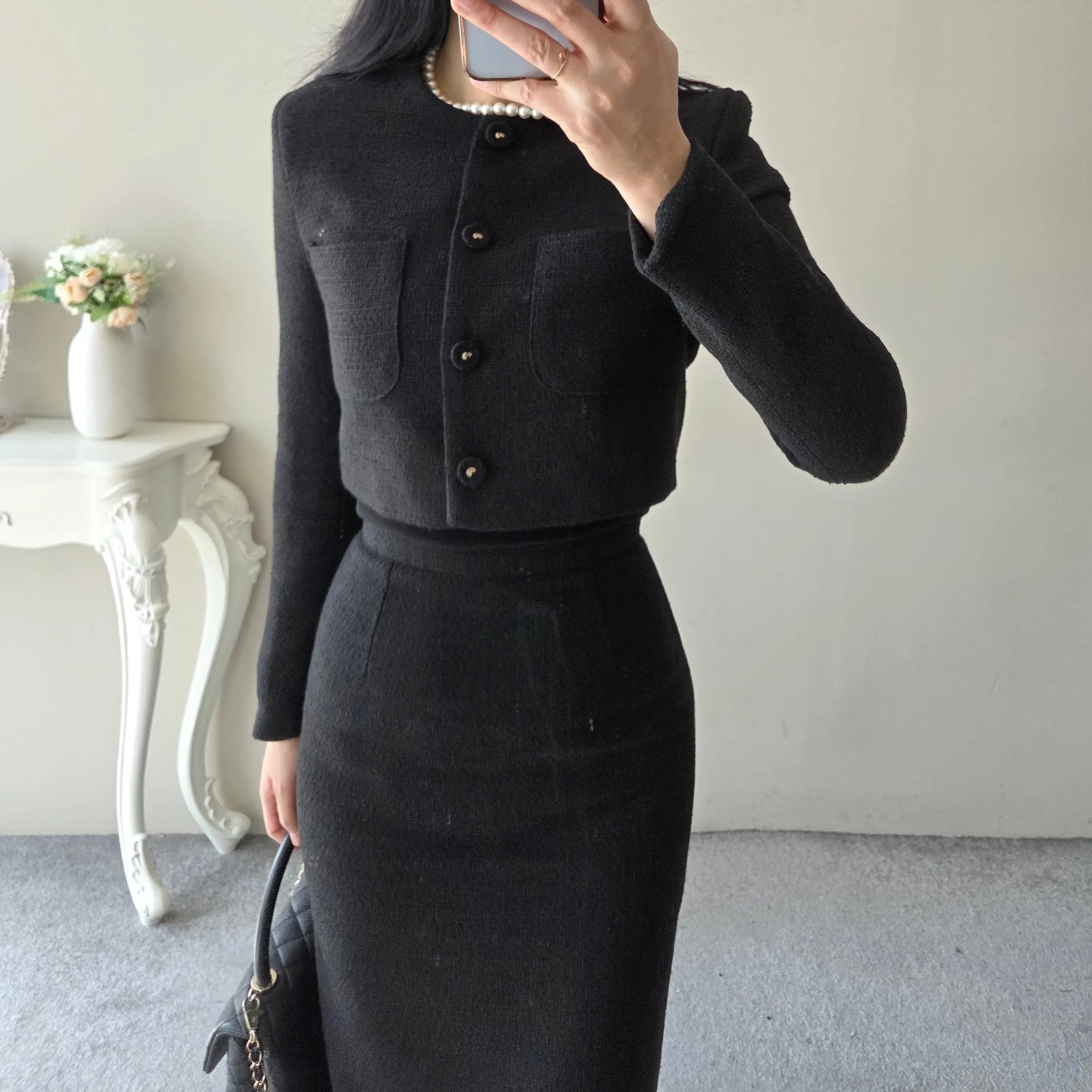 ツイードボタンラウンドネックノーカラーポケット肩パッドクロップド長袖フェイクポケットHライン(ロング丈)ヒドゥンジッパー無地ツーピース(トップス、ボトムス)スカートジャケット
