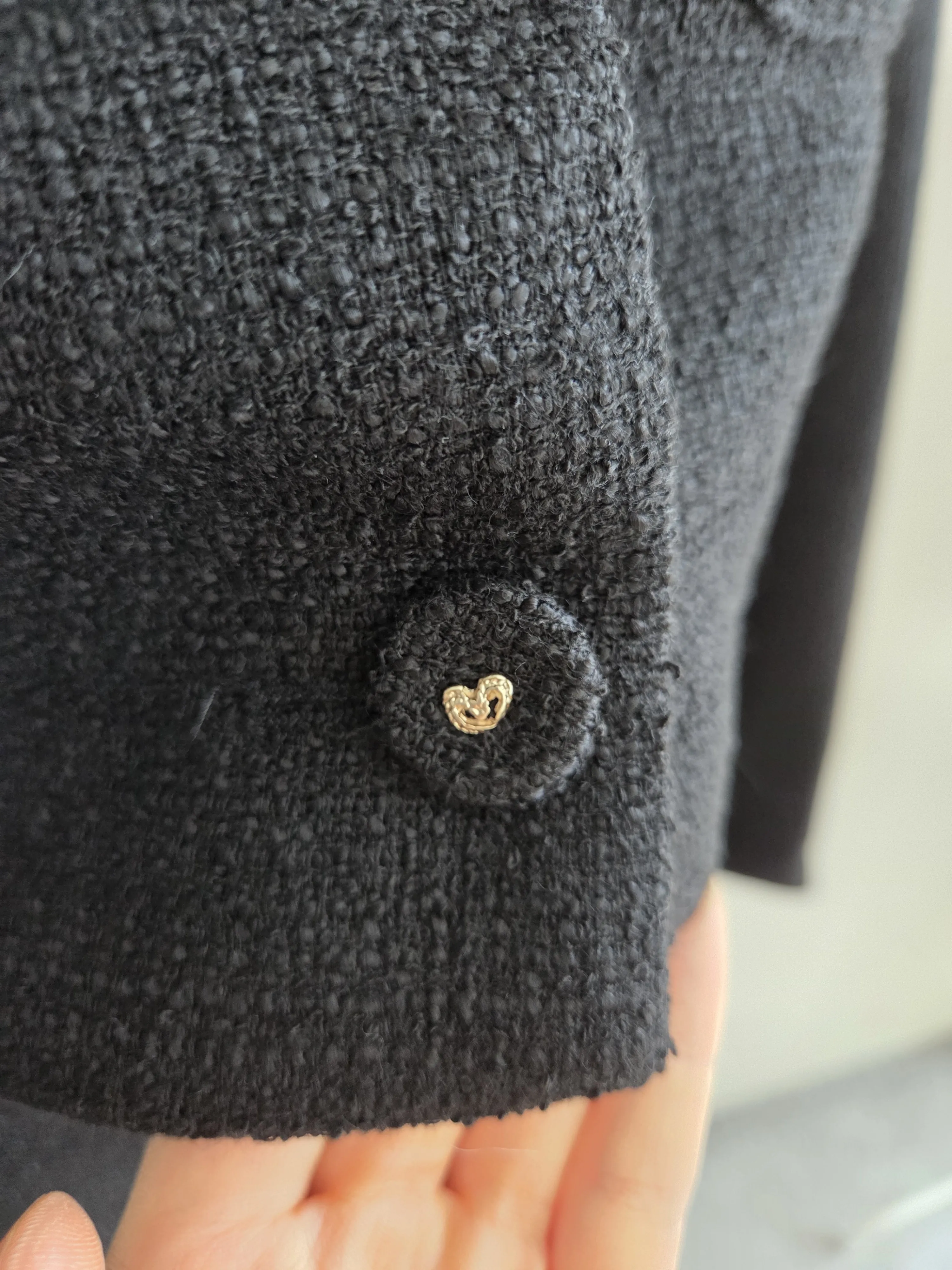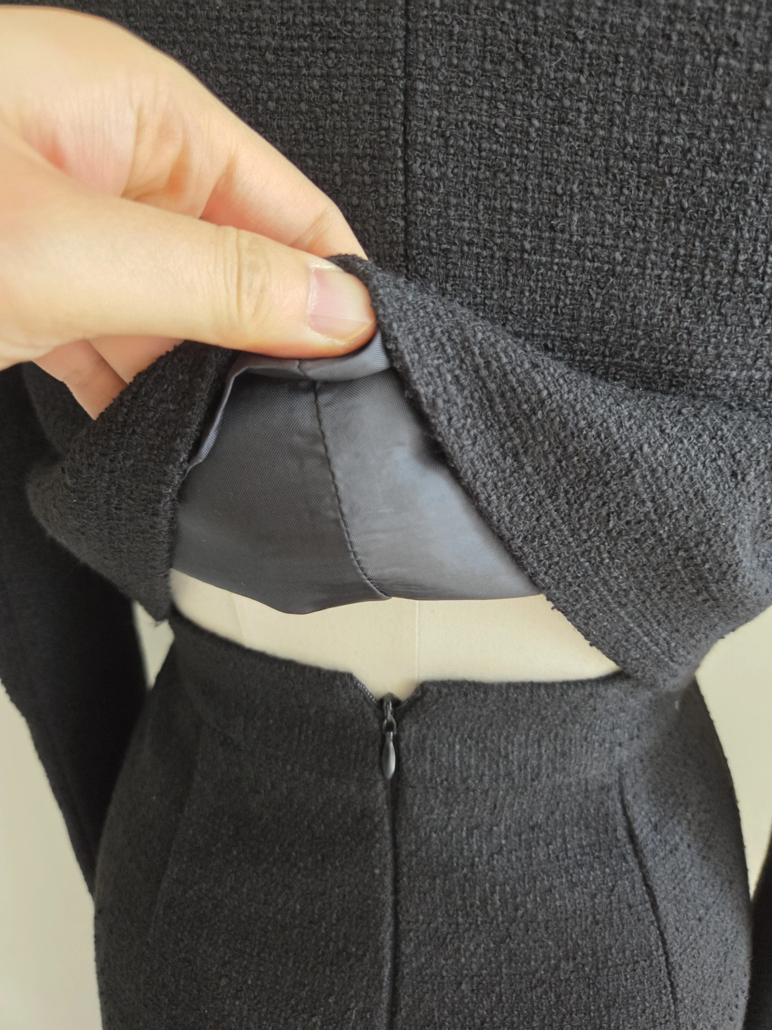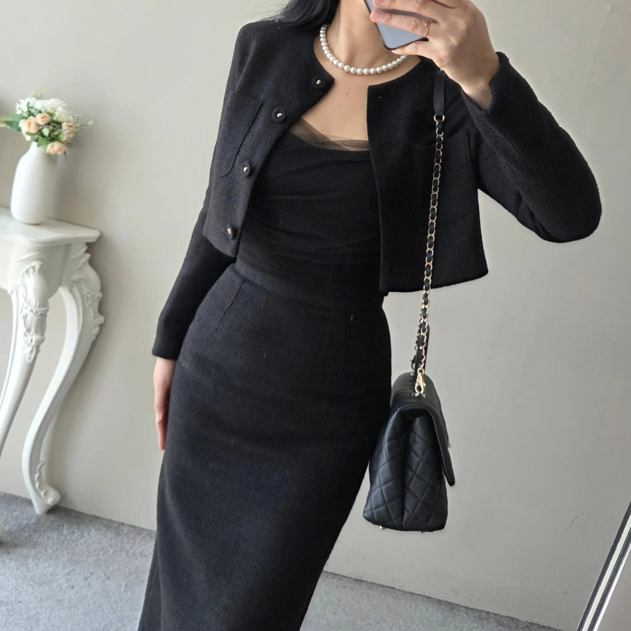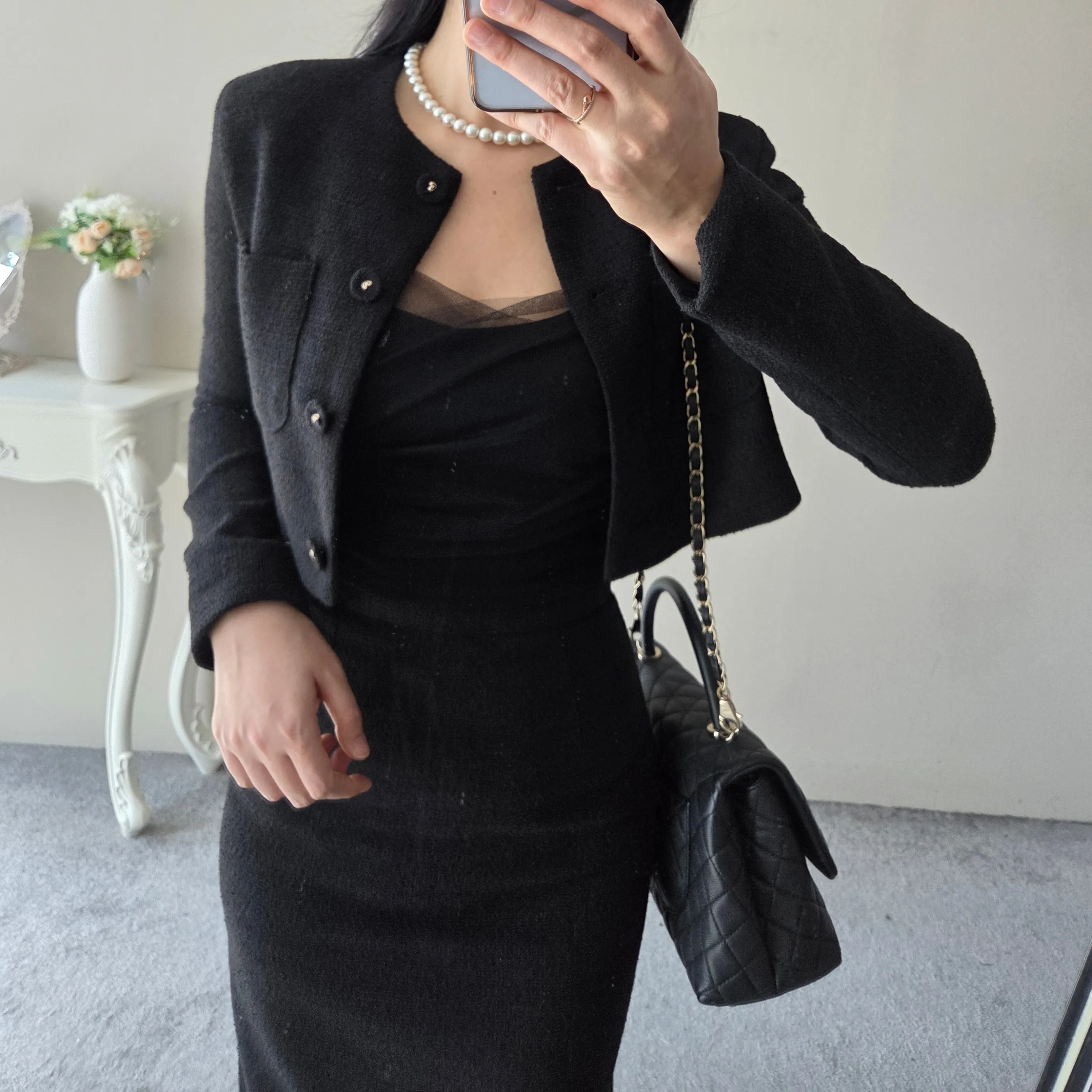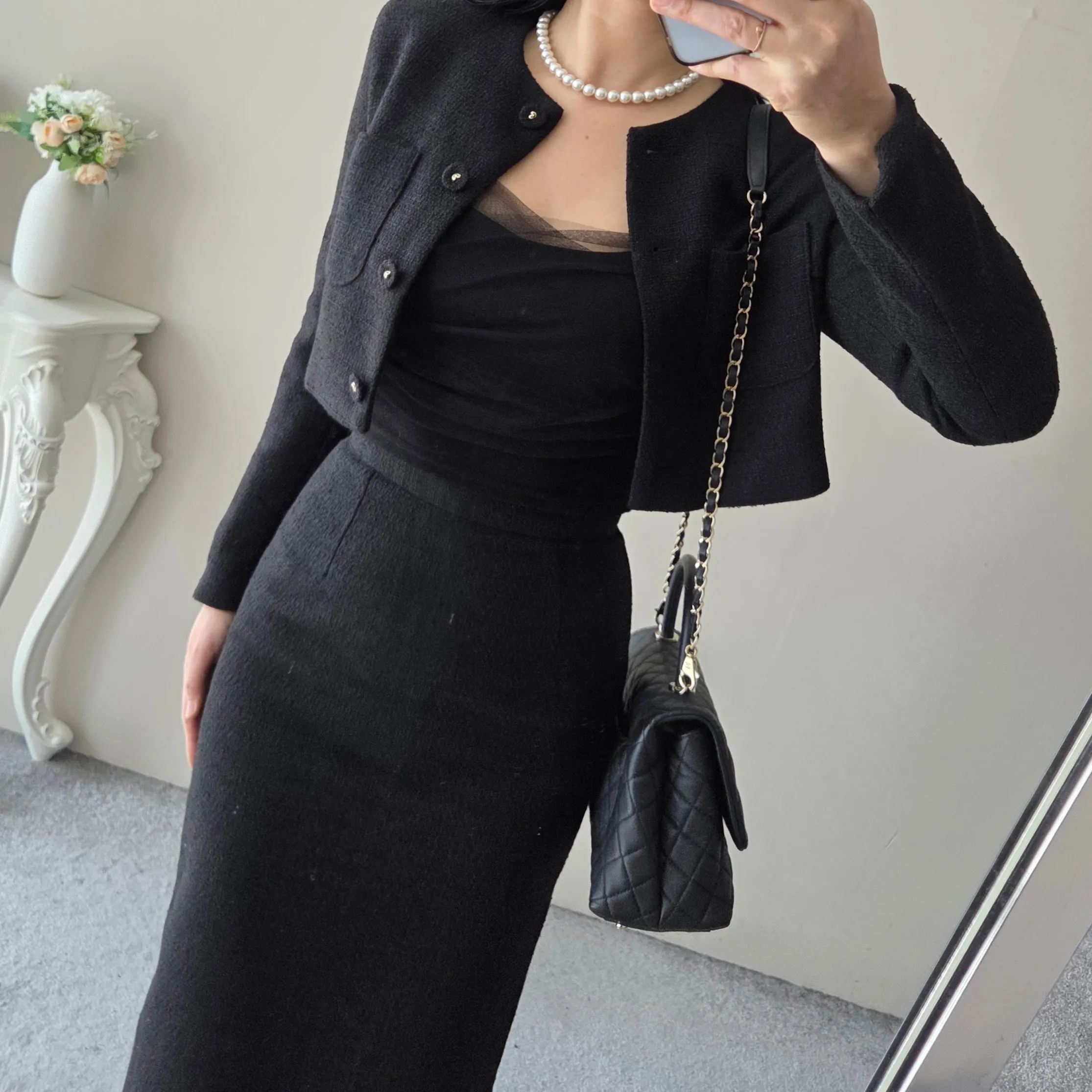 ツイードボタンラウンドネックノーカラーポケット肩パッドクロップド長袖フェイクポケットHライン(ロング丈)ヒドゥンジッパー無地ツーピース(トップス、ボトムス)スカートジャケット