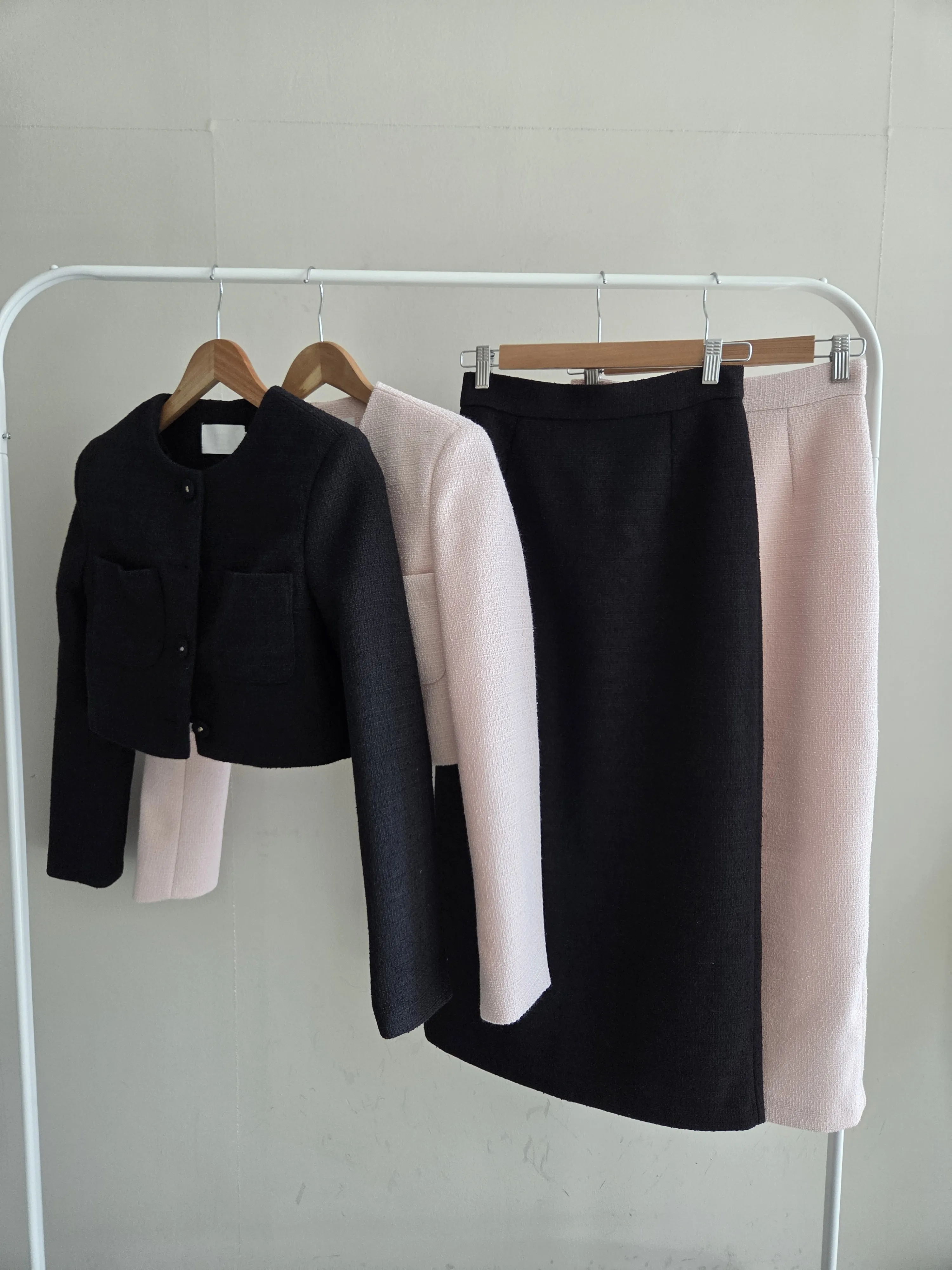 ツイードノーカラー肩パッドパフスリーブショートロング長袖フレアAラインダブルボタンヒドゥンジッパーツーピース(トップス、ボトムス)スカートダブルジャケット