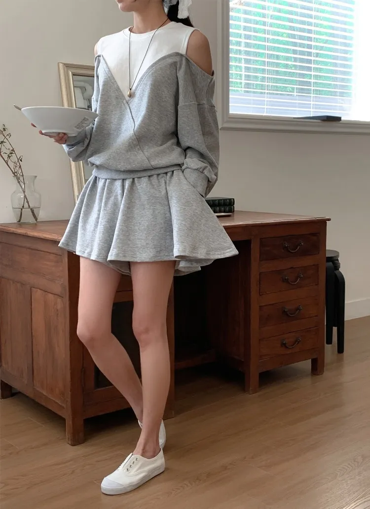 ストラップVネックリンクルスリットウエストゴムラグランスリム長袖ギャザーフレアAラインミニくるみボタン無地ツーピース(トップス、ボトムス)ブラウスショートパンツ[選べる丈]