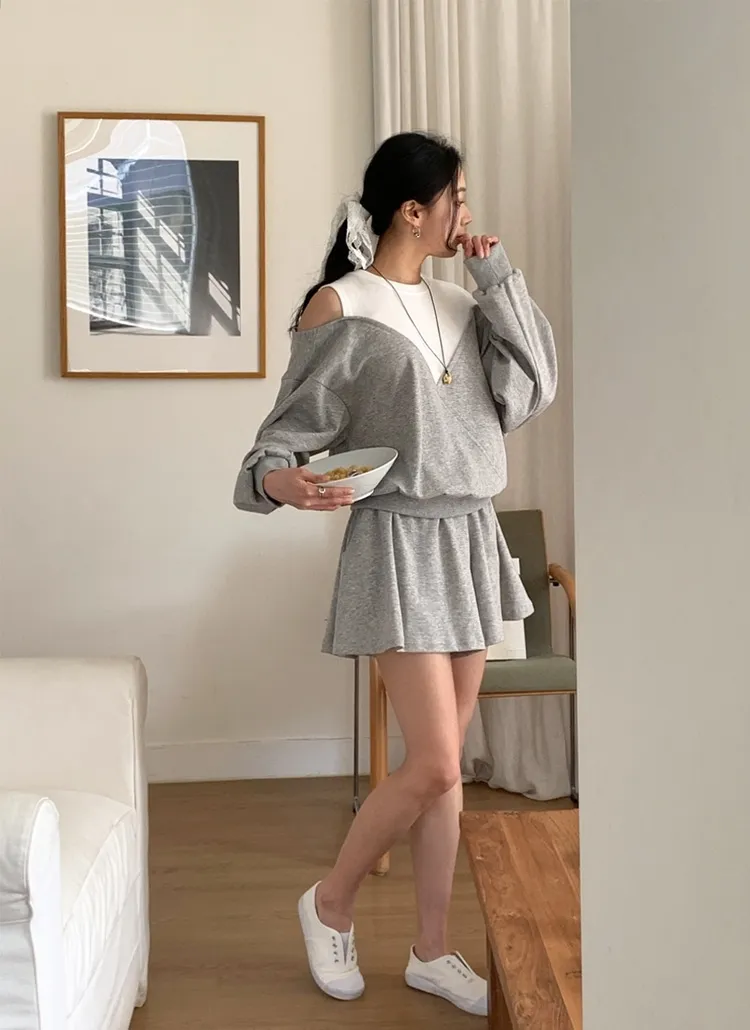 ウール混長袖ラインカンガルーポケットルーズドローストリングドロップショルダーウエストゴムポケットパッチ無地パーカーパンツツーピース(トップス、ボトムス)