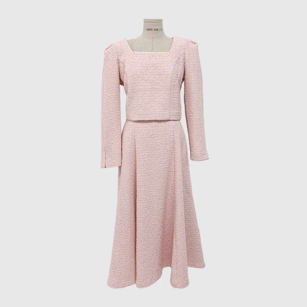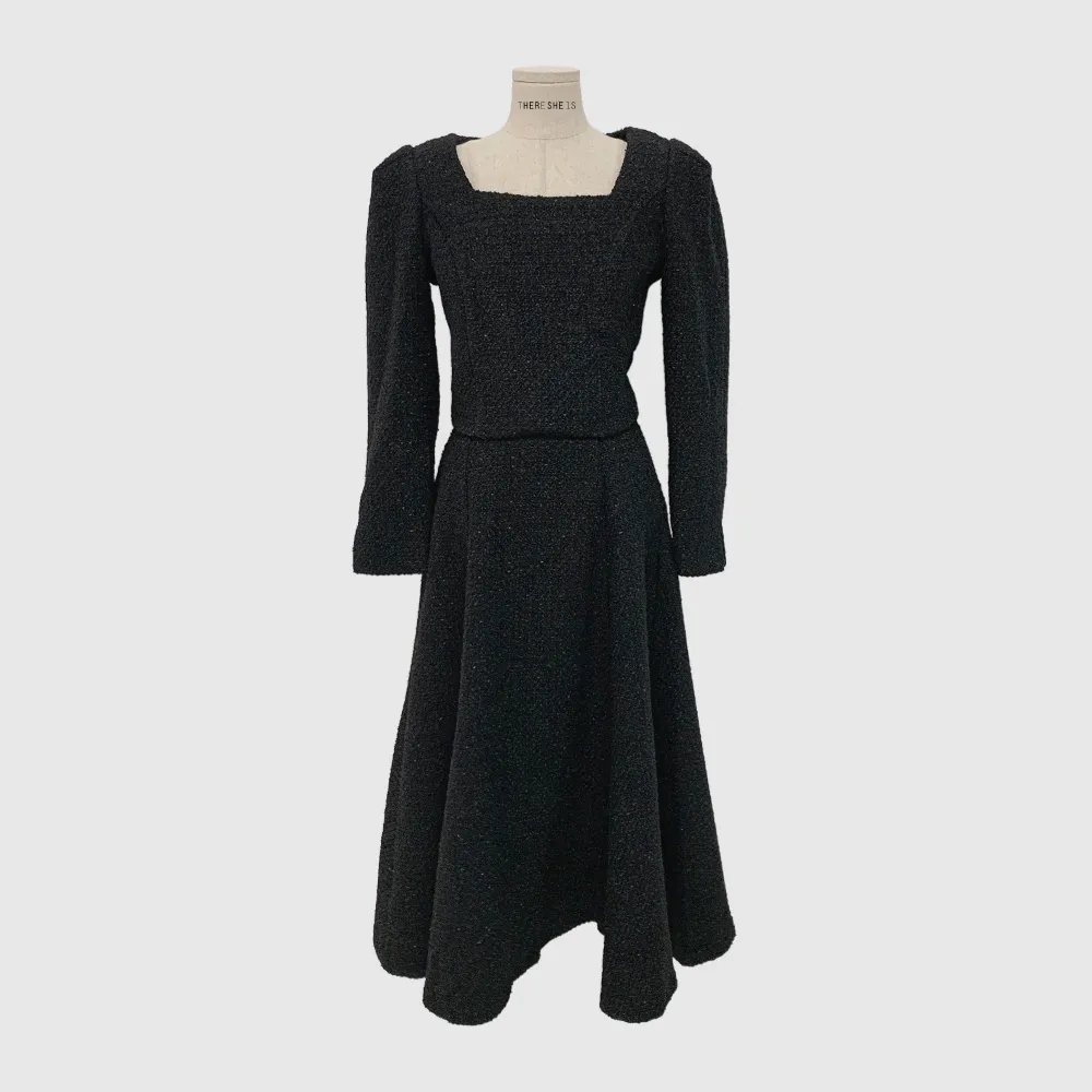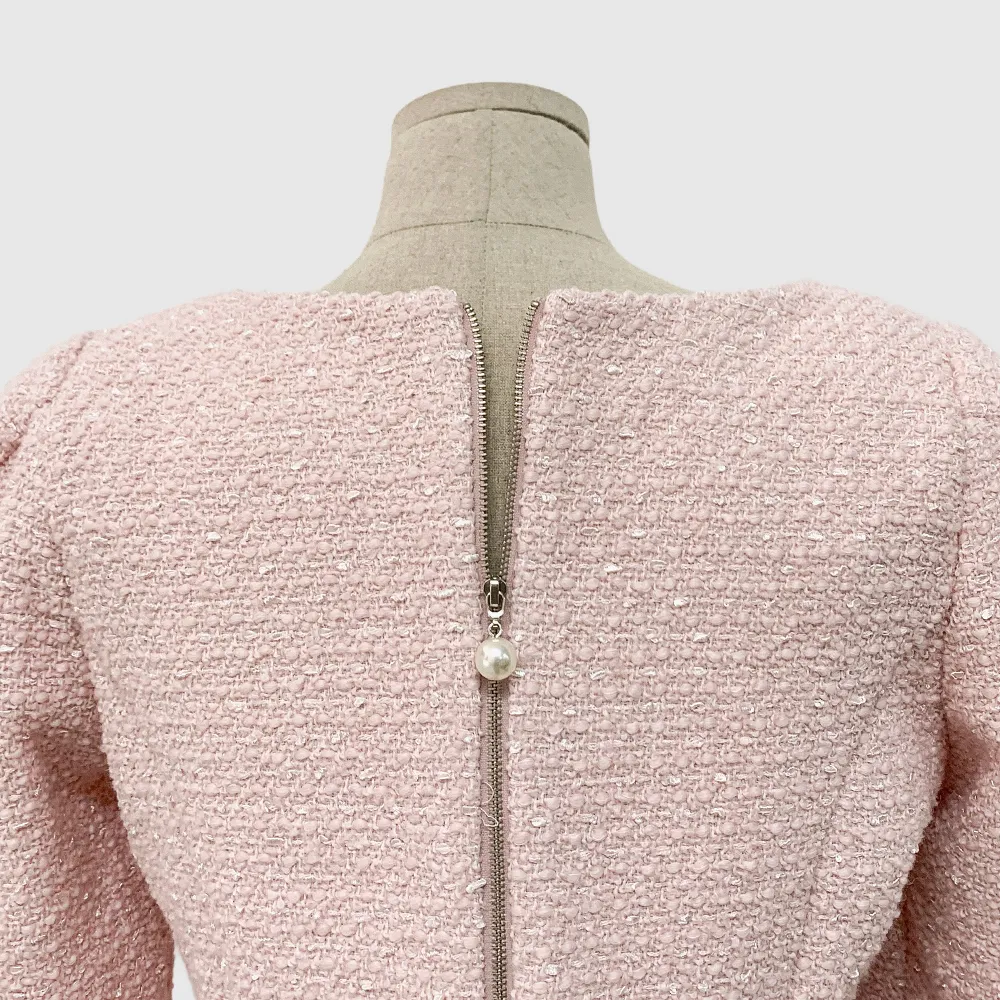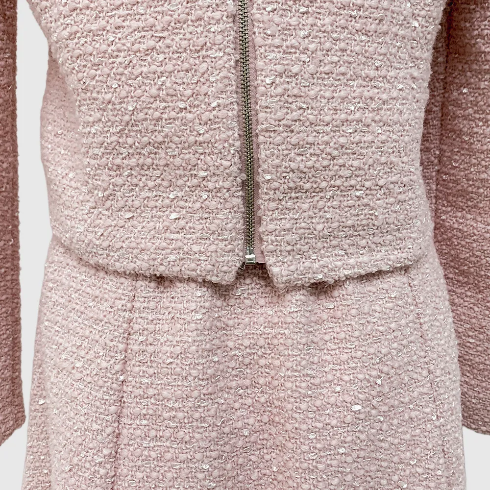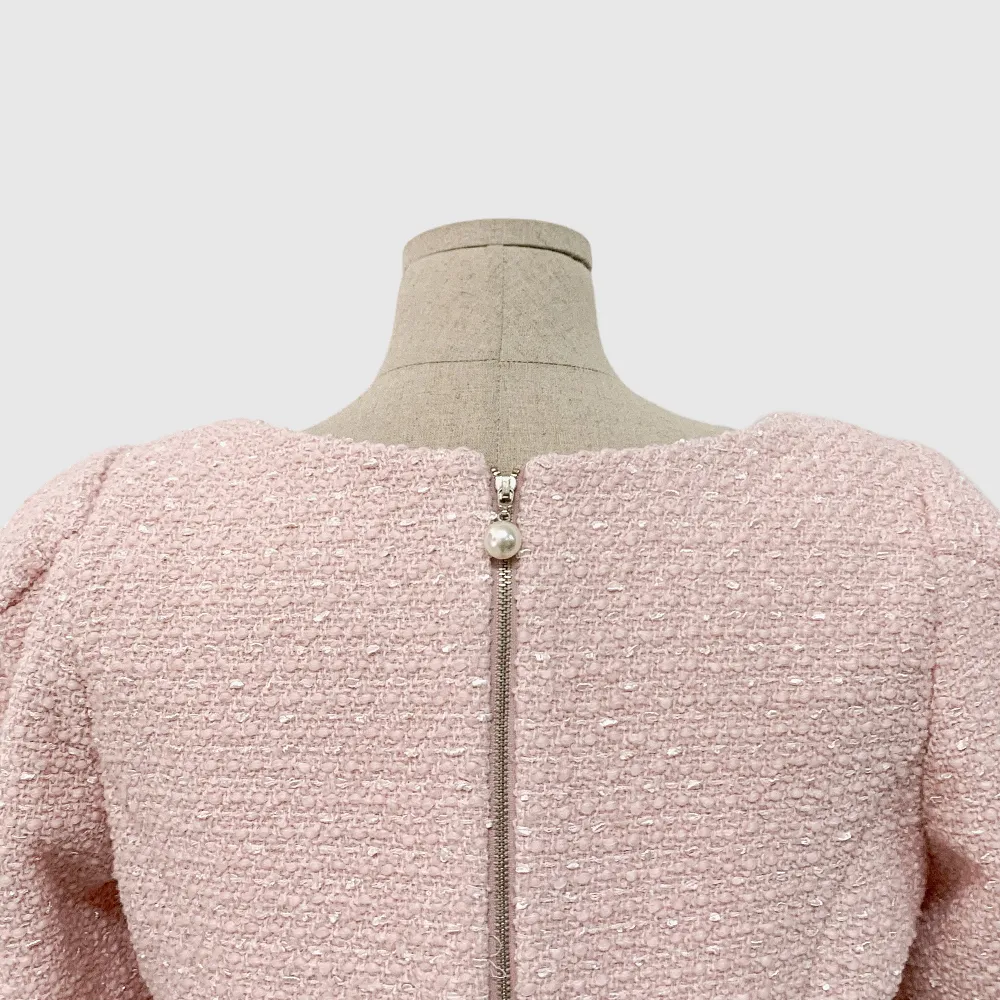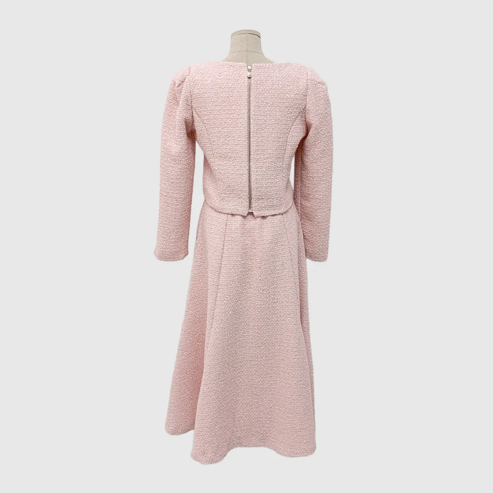 ツイードボタンラウンドネックノーカラーポケット肩パッドクロップド長袖フェイクポケットHライン(ロング丈)ヒドゥンジッパー無地ツーピース(トップス、ボトムス)スカートジャケット