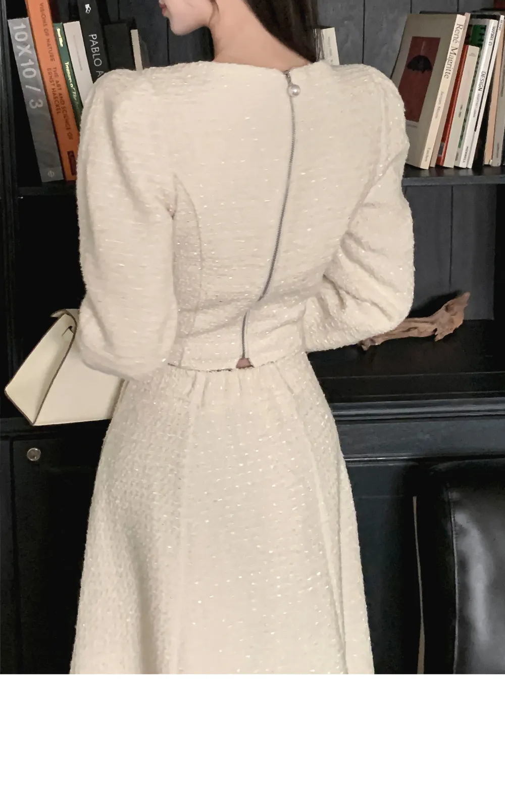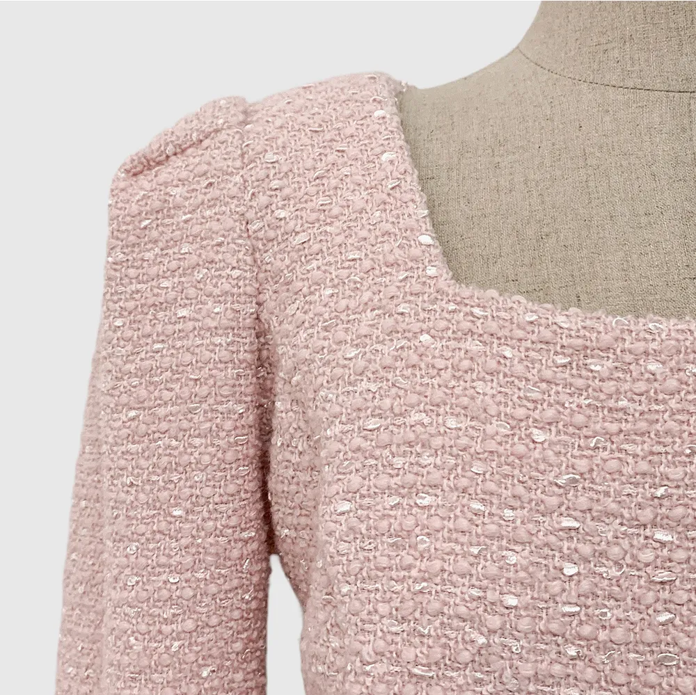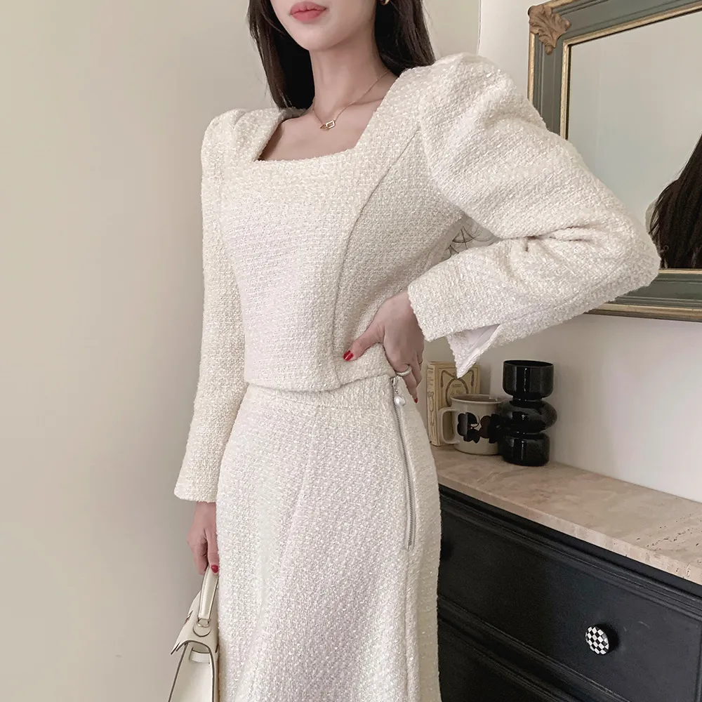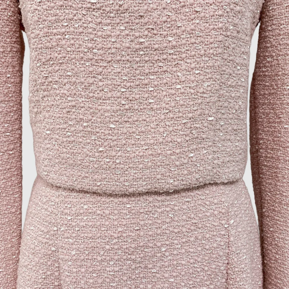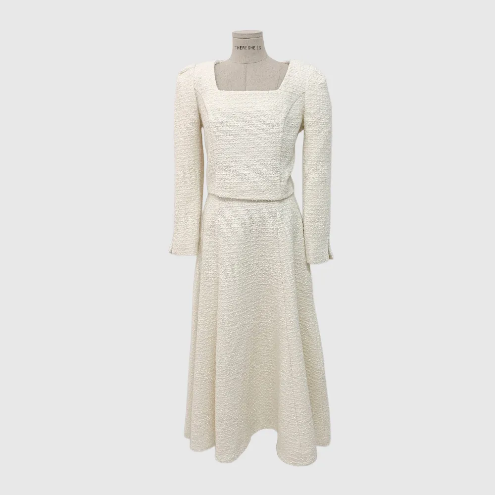 ツイードボタンラウンドネックノーカラーポケット肩パッドクロップド長袖フェイクポケットHライン(ロング丈)ヒドゥンジッパー無地ツーピース(トップス、ボトムス)スカートジャケット
