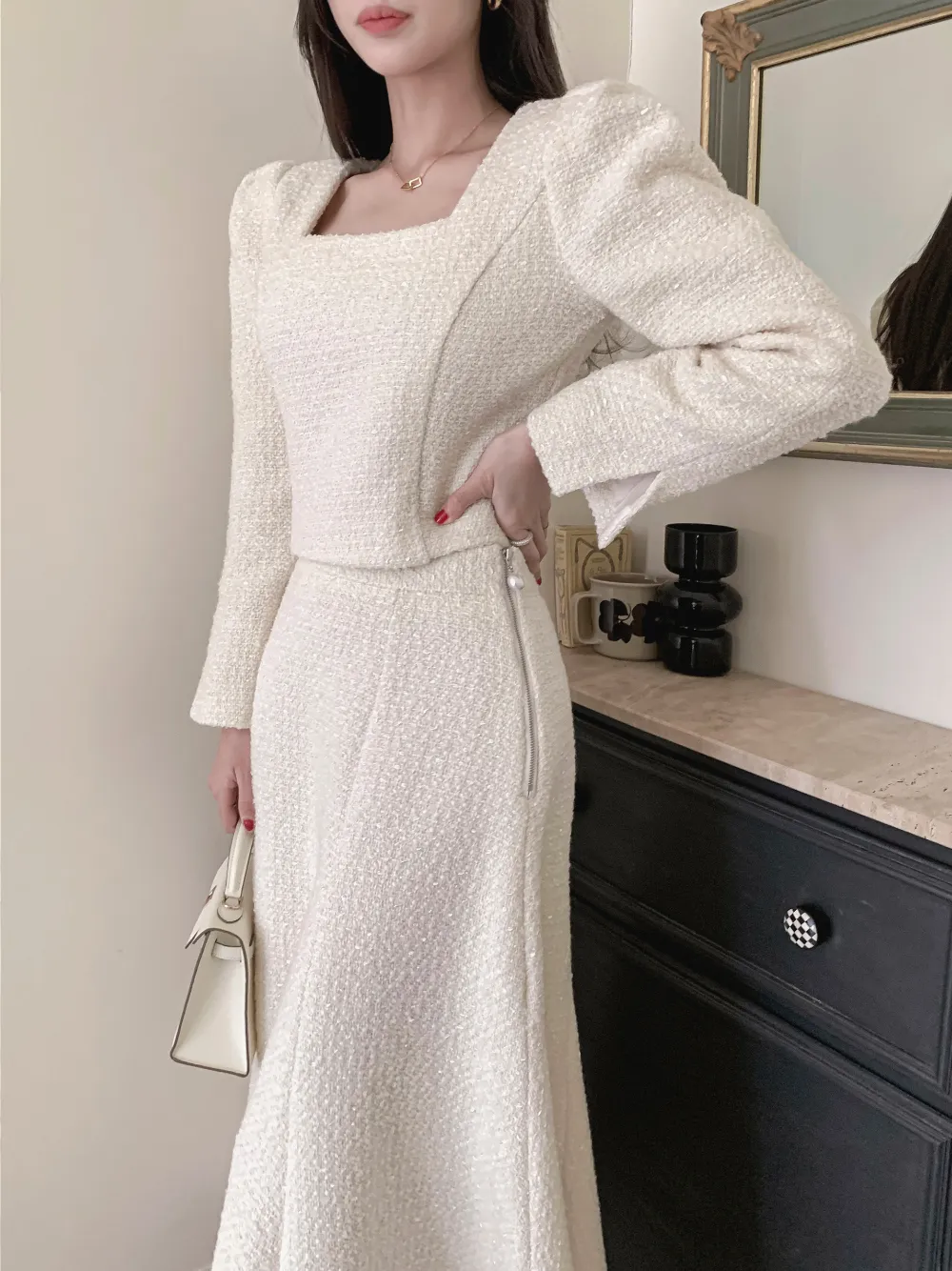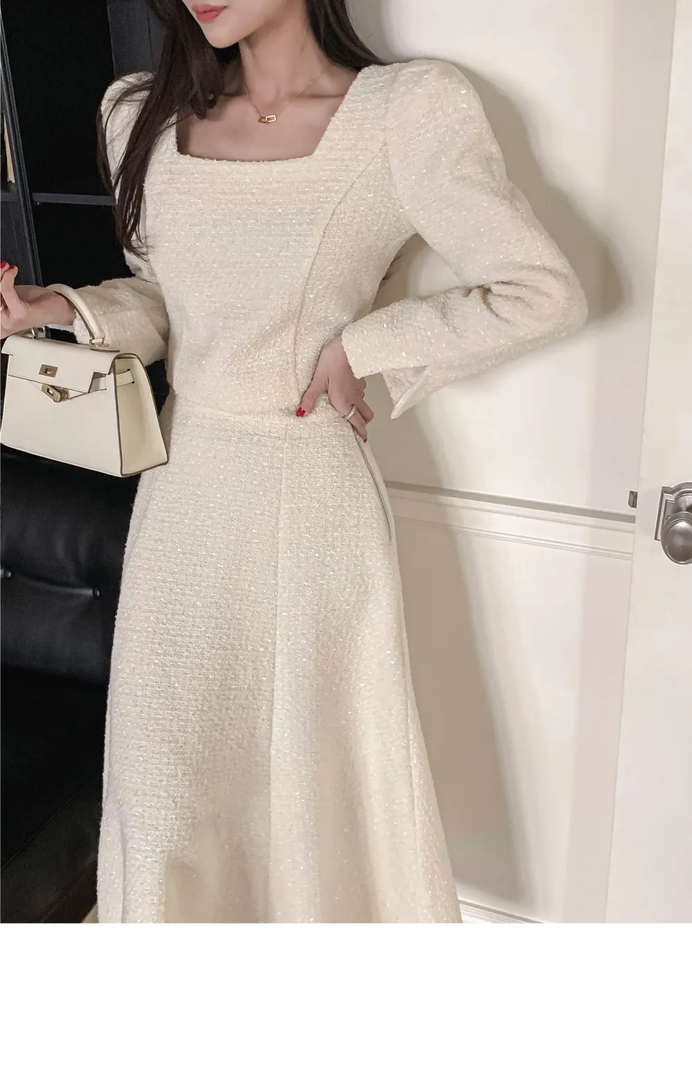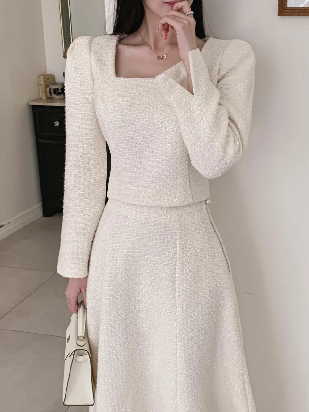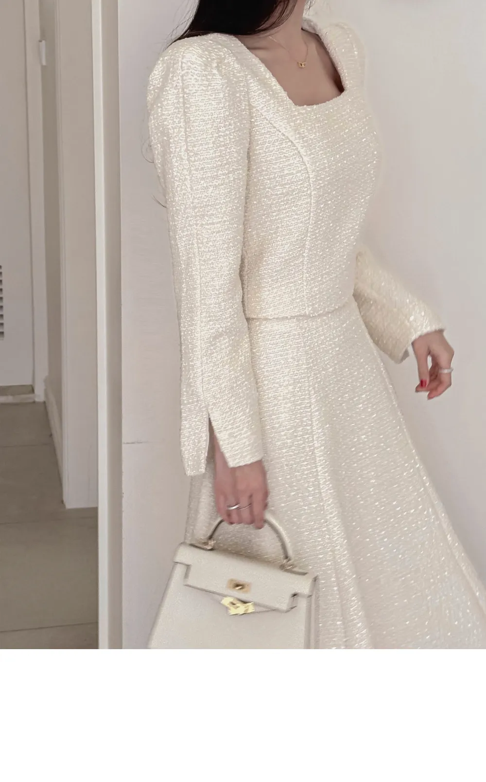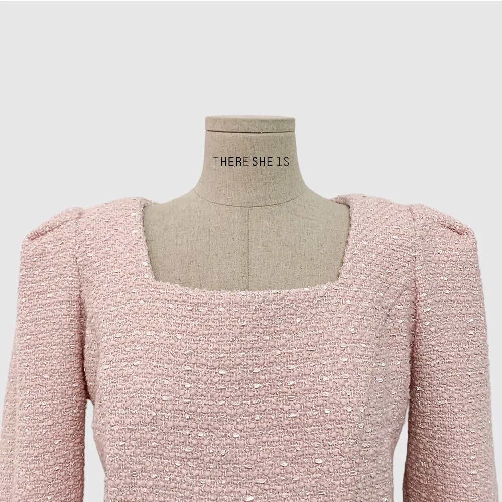 ツイードボタンラウンドネックノーカラーポケット肩パッドクロップド長袖フェイクポケットHライン(ロング丈)ヒドゥンジッパー無地ツーピース(トップス、ボトムス)スカートジャケット