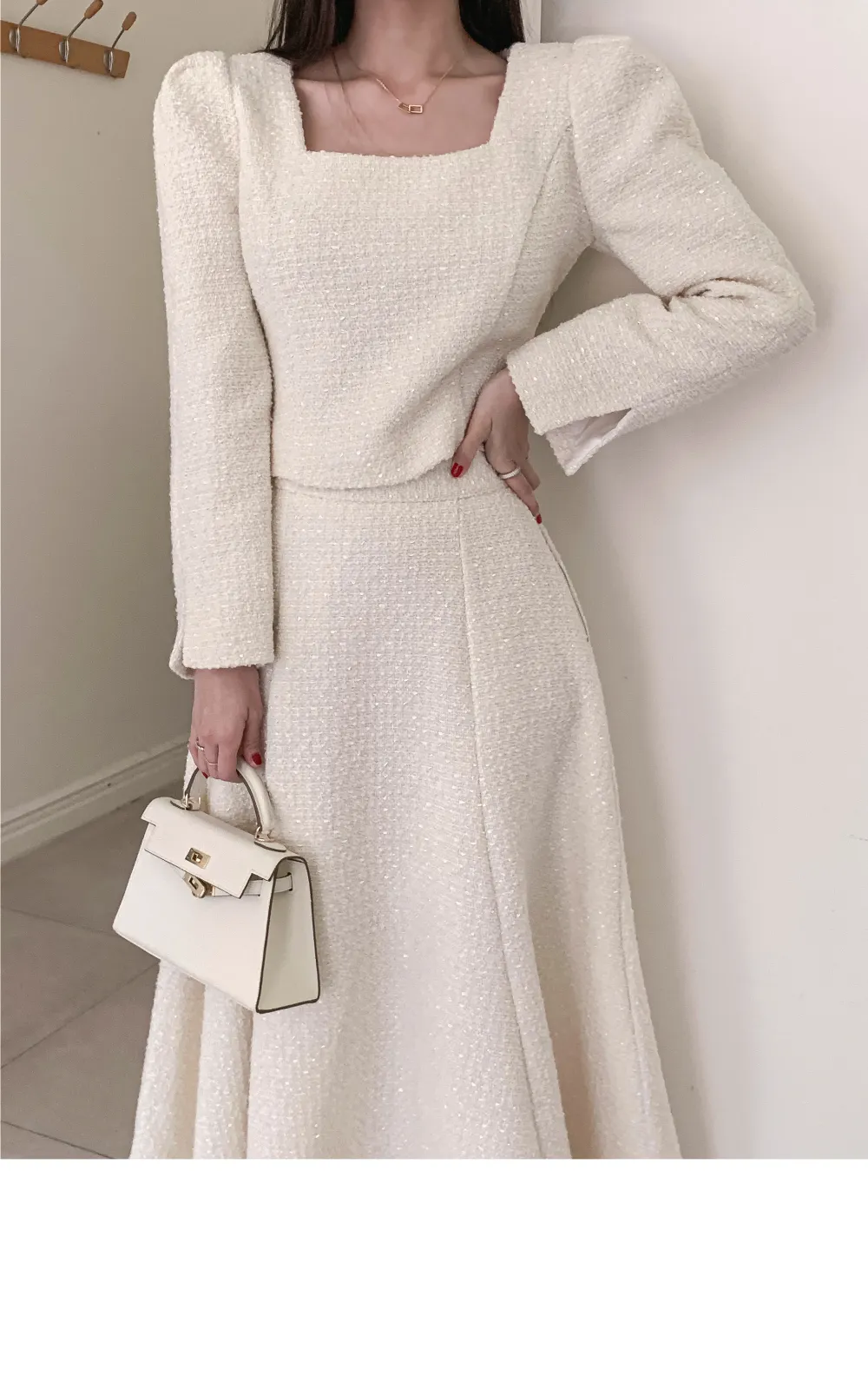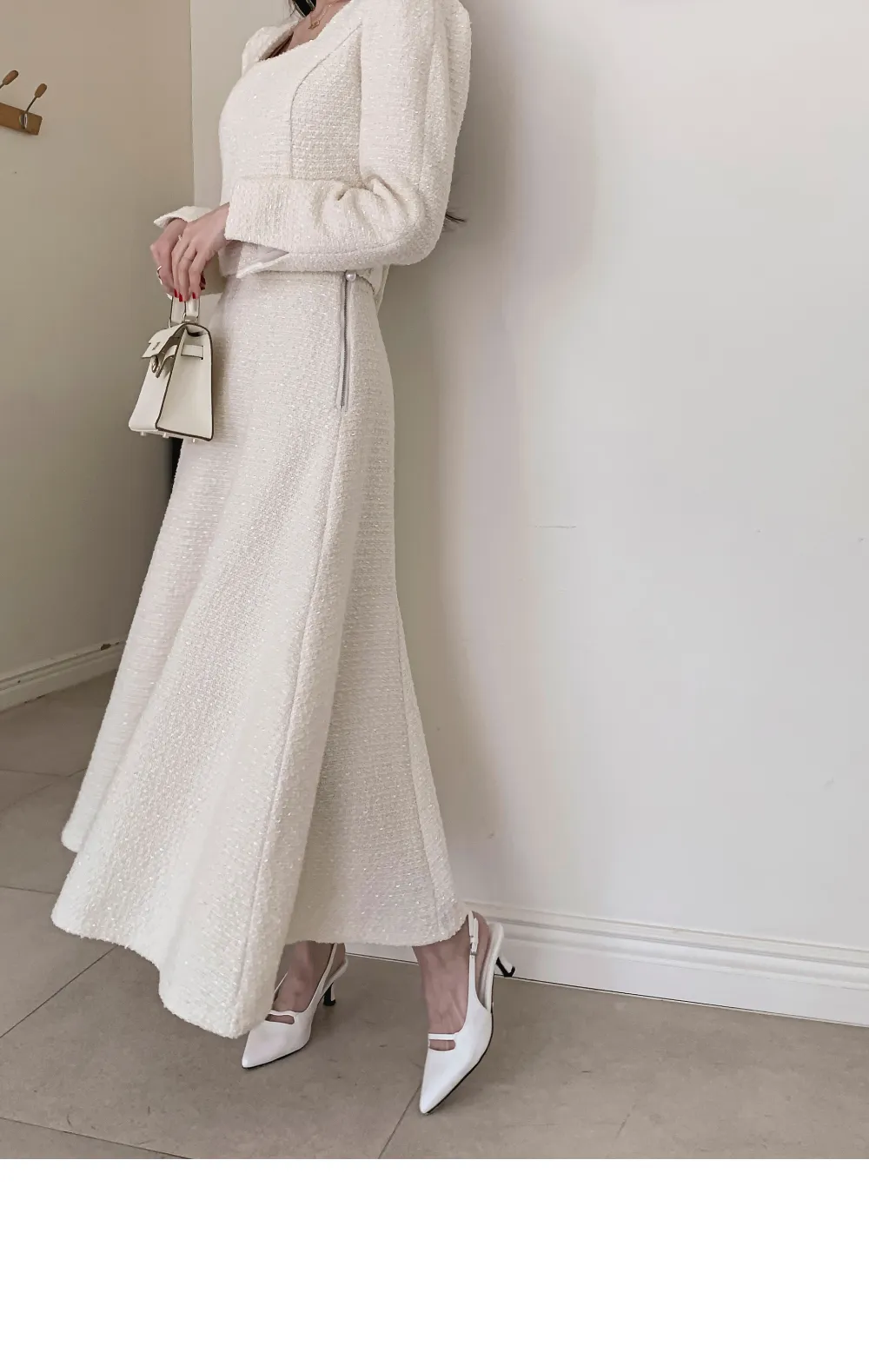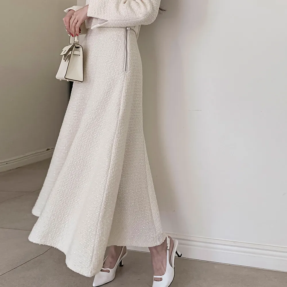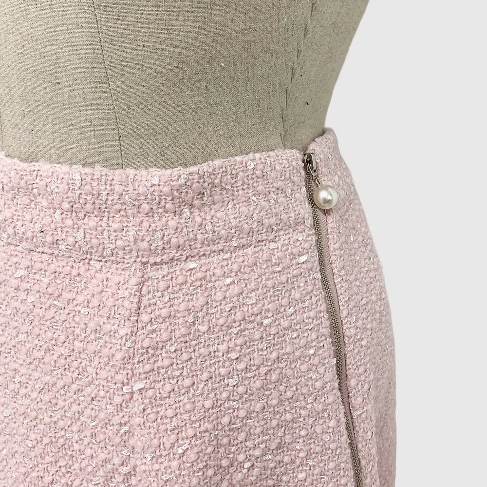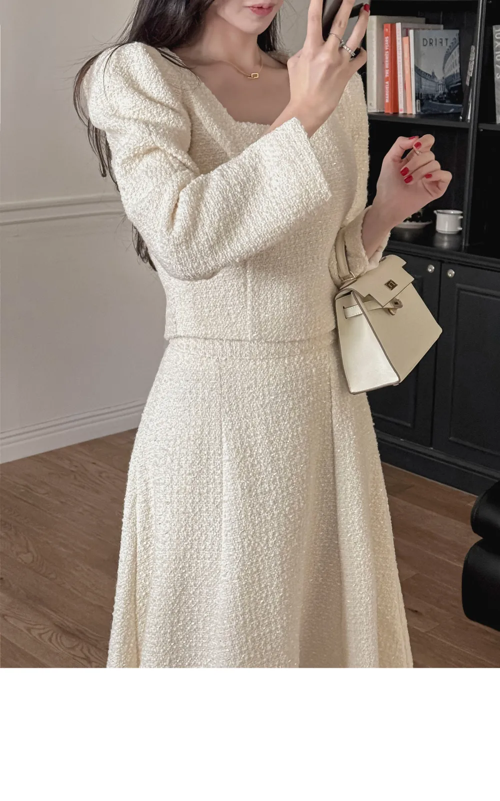 ツイードボタンラウンドネックノーカラーポケット肩パッドクロップド長袖フェイクポケットHライン(ロング丈)ヒドゥンジッパー無地ツーピース(トップス、ボトムス)スカートジャケット
