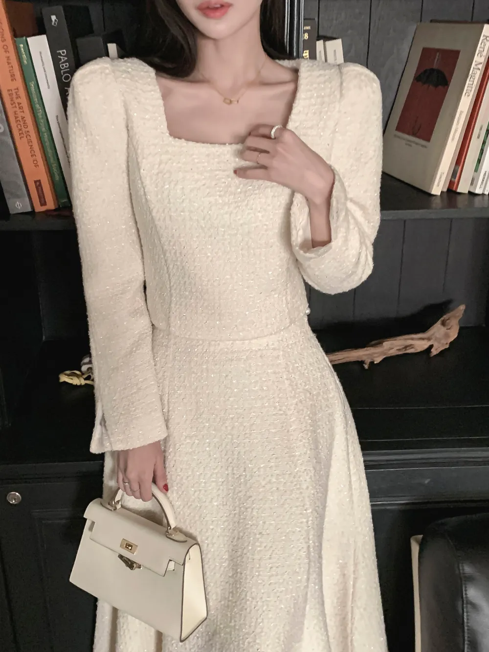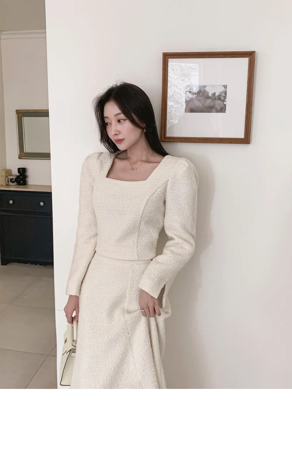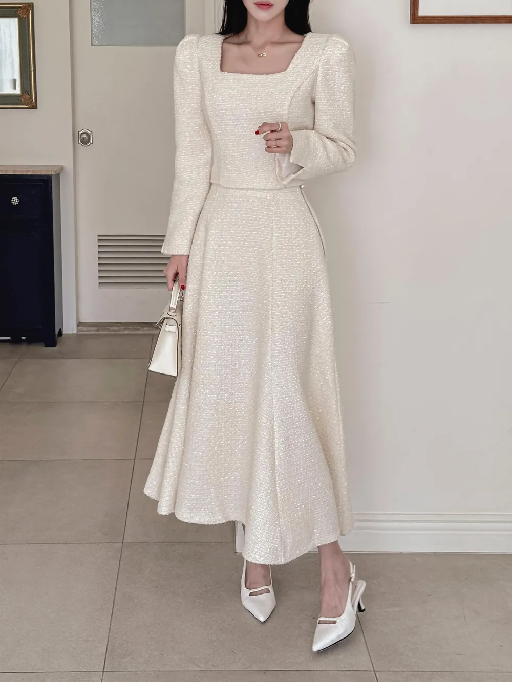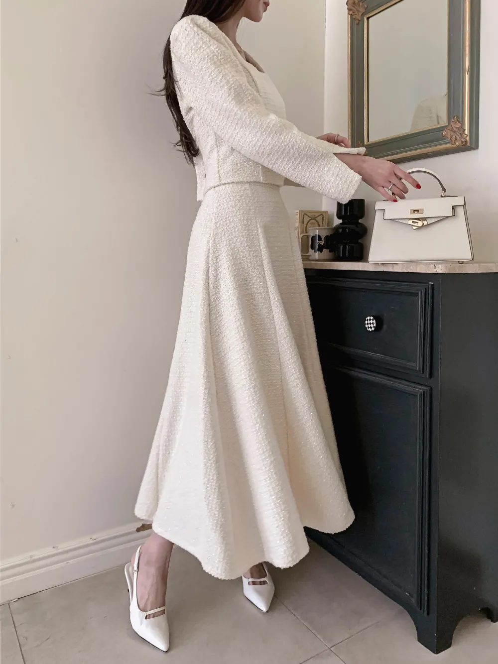 ツイードボタンラウンドネックノーカラーポケット肩パッドクロップド長袖フェイクポケットHライン(ロング丈)ヒドゥンジッパー無地ツーピース(トップス、ボトムス)スカートジャケット
