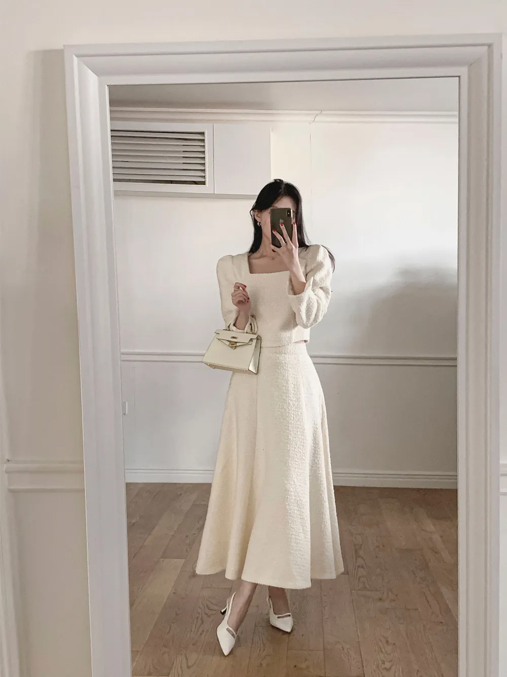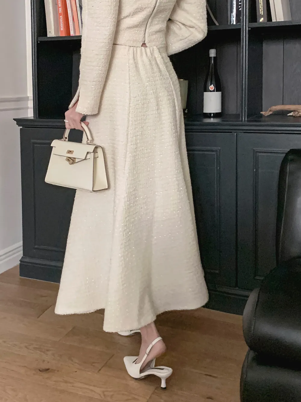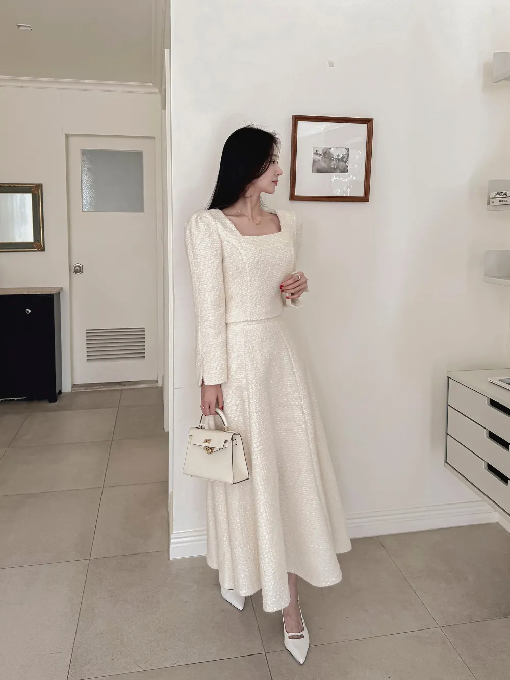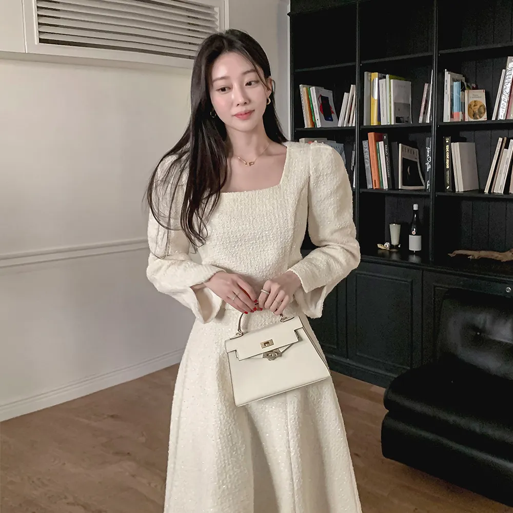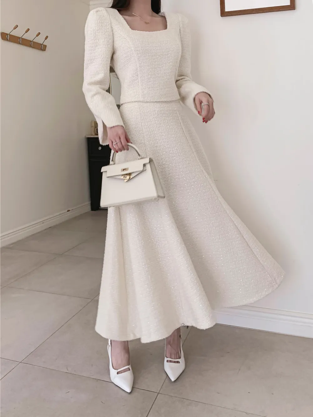 ツイードボタンラウンドネックノーカラーポケット肩パッドクロップド長袖フェイクポケットHライン(ロング丈)ヒドゥンジッパー無地ツーピース(トップス、ボトムス)スカートジャケット