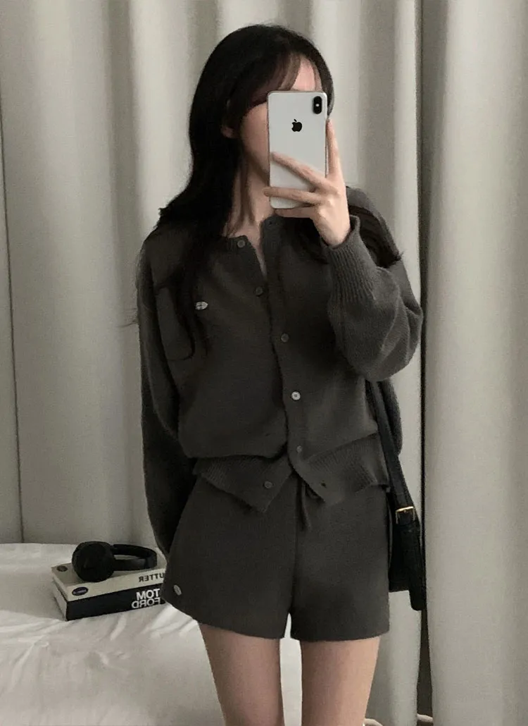 シアサッカーVネック半袖ラグランAラインオーバーサイズルーズウエストゴムロングワイドリンクル無地カーディガンパンツツーピース(トップス、ボトムス)