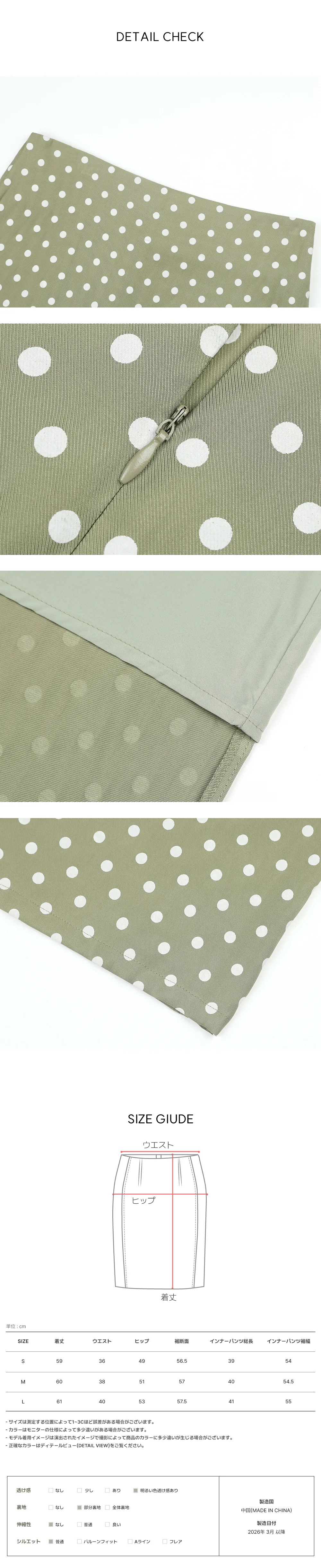 | Size | ウエスト | ヒップ | 裾幅 | 着丈 | 裏地丈 | 裏地裾幅 |